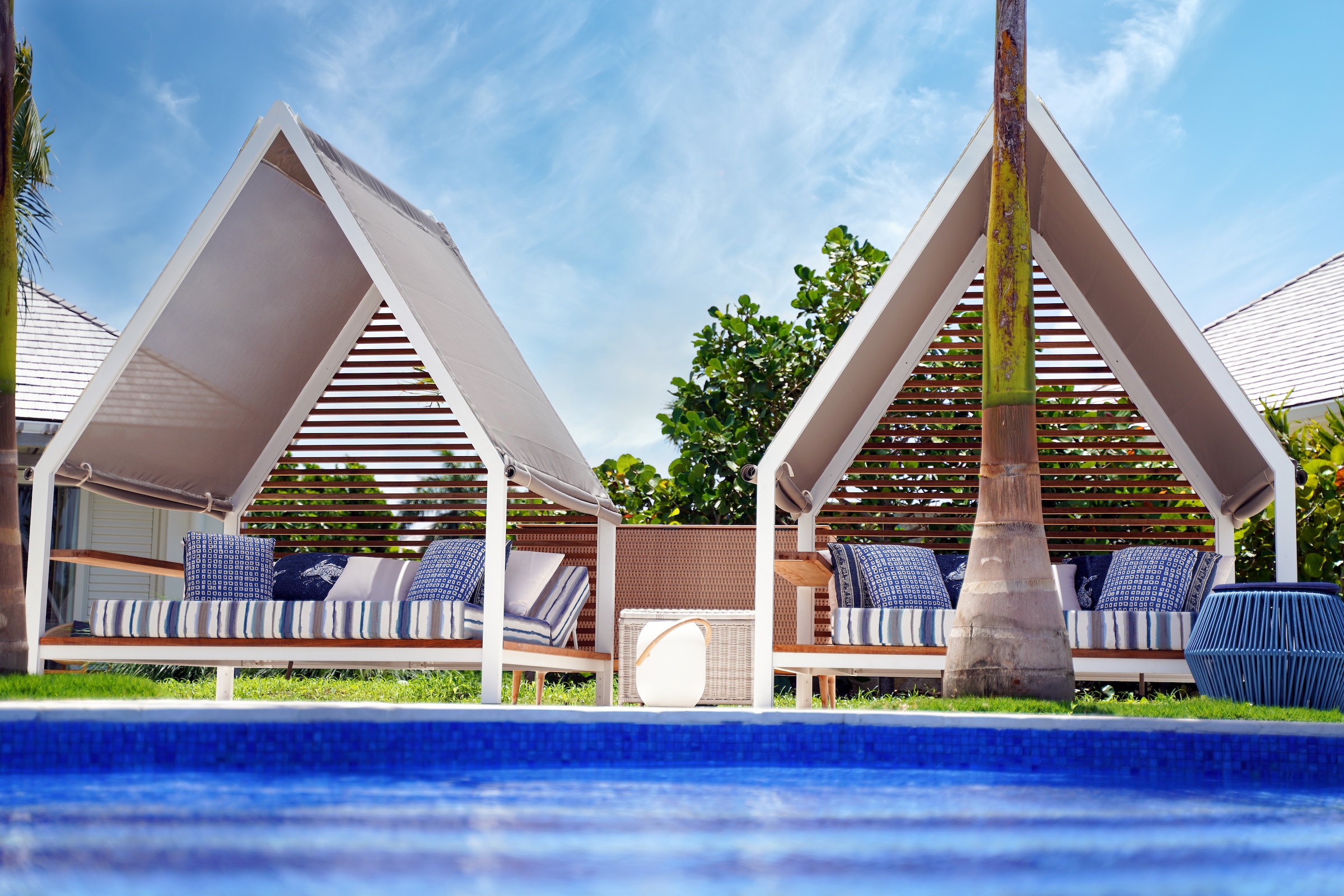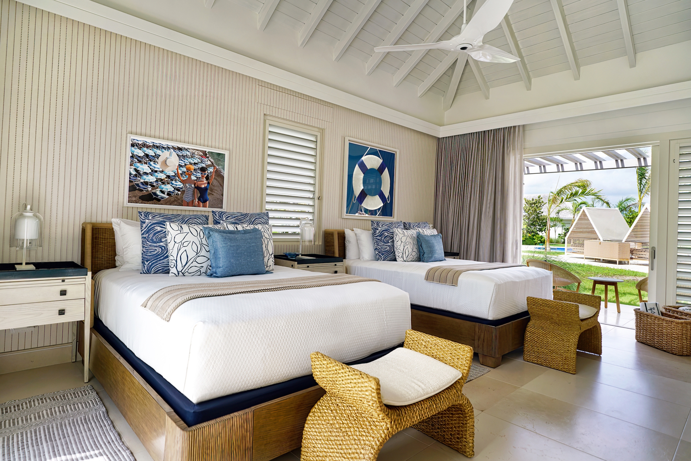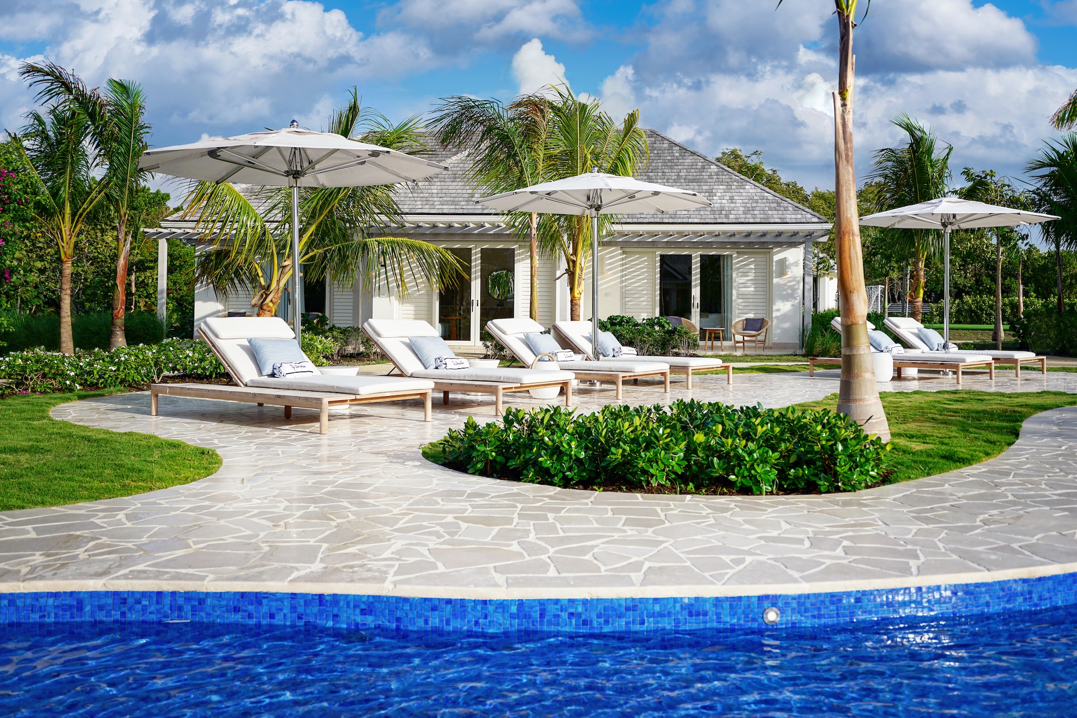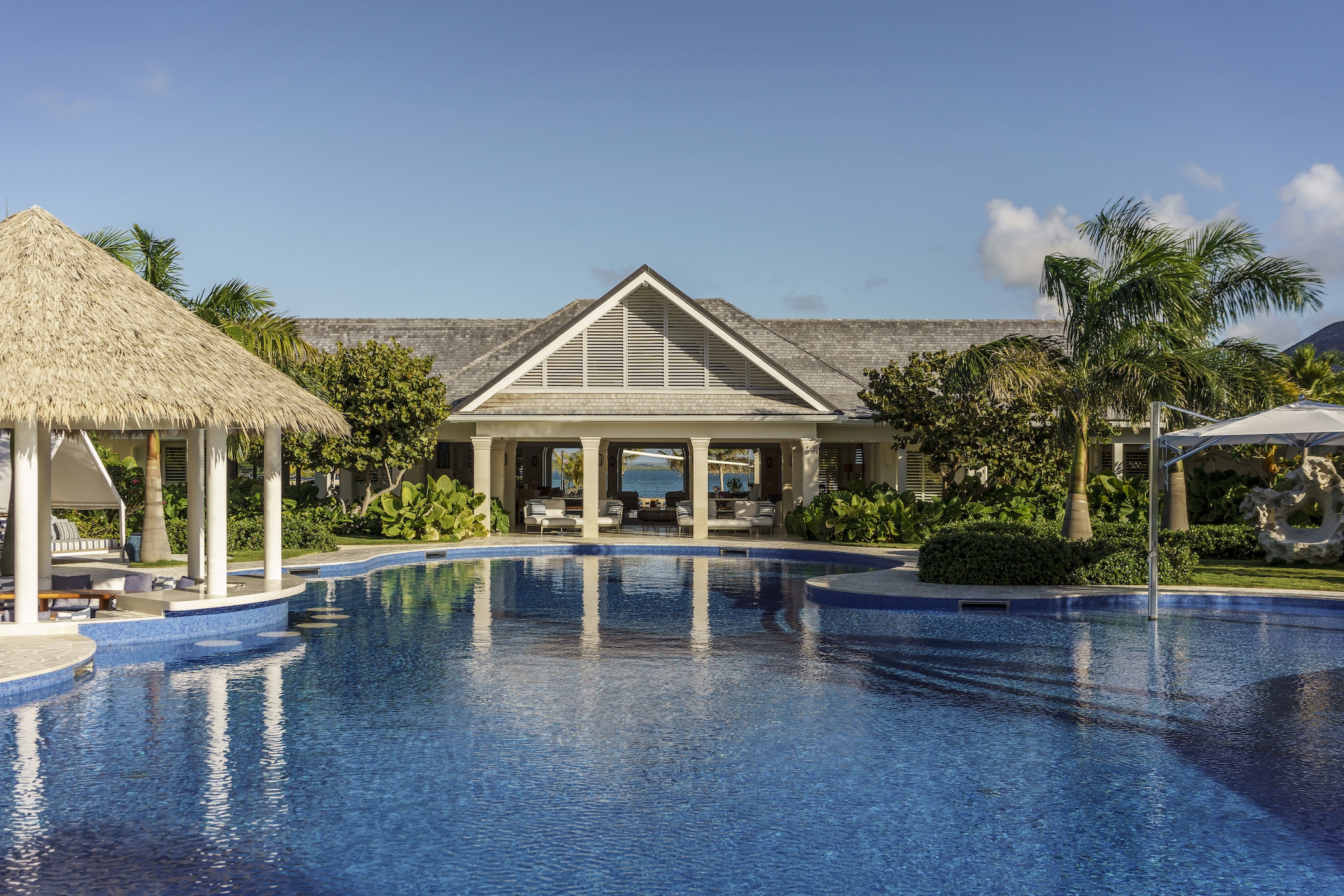 This 23,000 sq. ft. property has 8 bedrooms, with two primary bedrooms, three 2-bedroom cottages, and a pool house; each bedroom includes a private ensuite bathroom with an alfresco soaking tub and shower. The great room has two terraces (one ocean-facing, one poolside) and outdoor dining for 20 at the custom teak dining table. Other amenities include a private vegetable/herb garden, gym, and golf simulator.