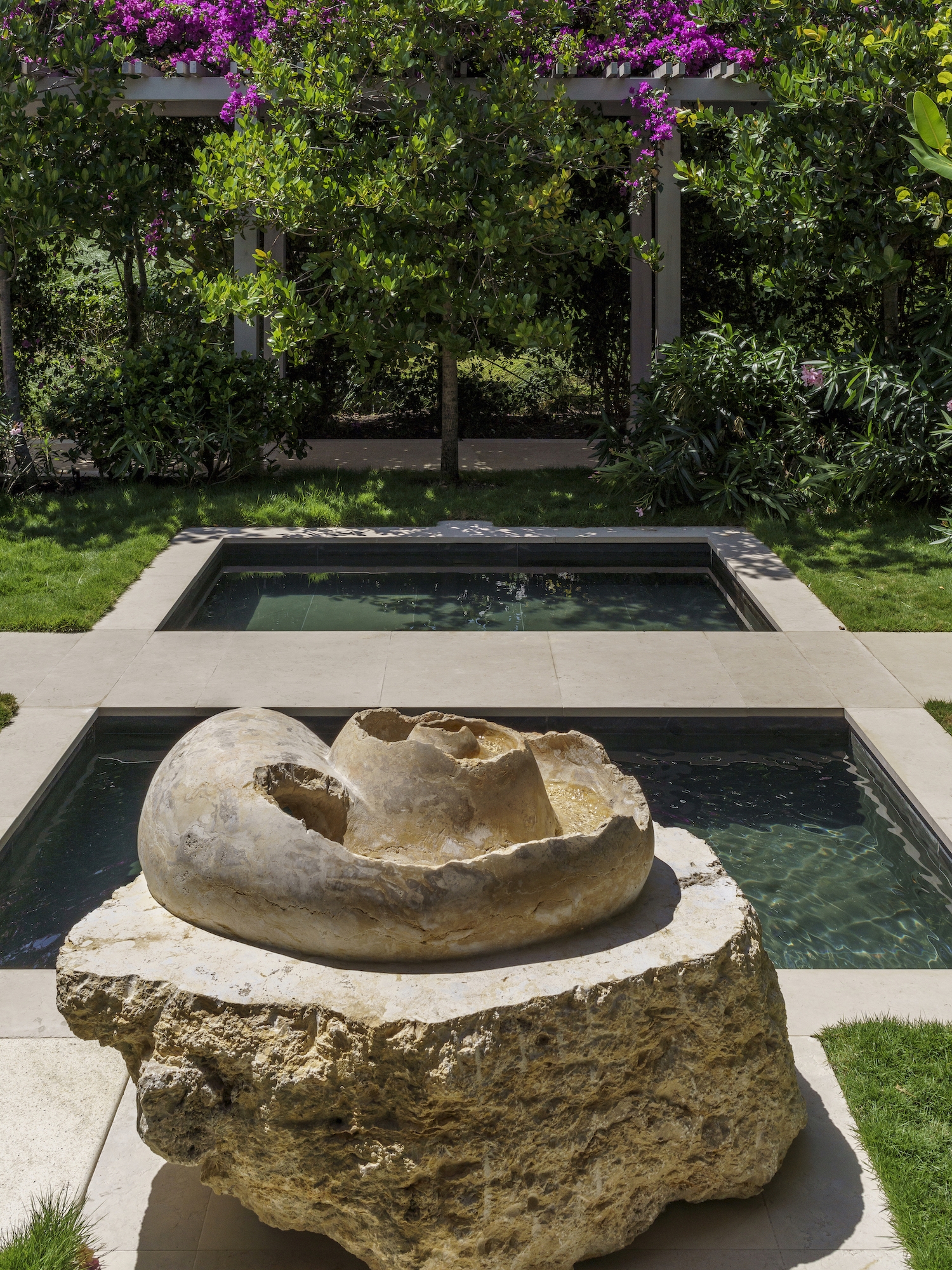 The overall design has a neutral, textured, and layered backdrop, allowing for accenting in a crisp color palette and directing attention to the tropical landscape. Collected objects, including vintage, antique, and new artworks, accessories, and furnishings, give it a unique and artistic sensibility.