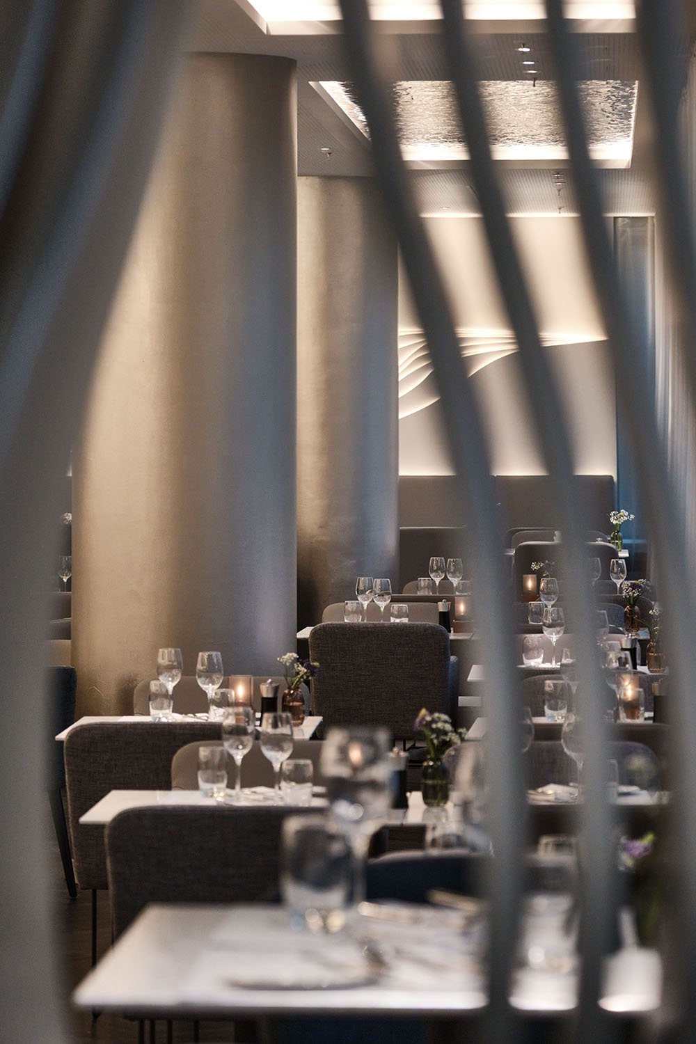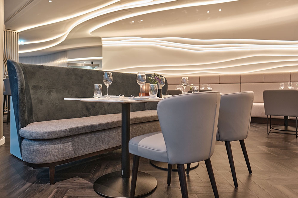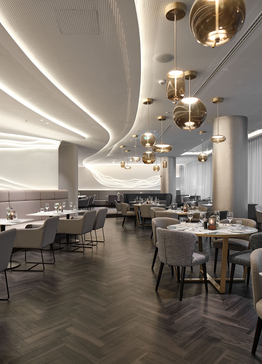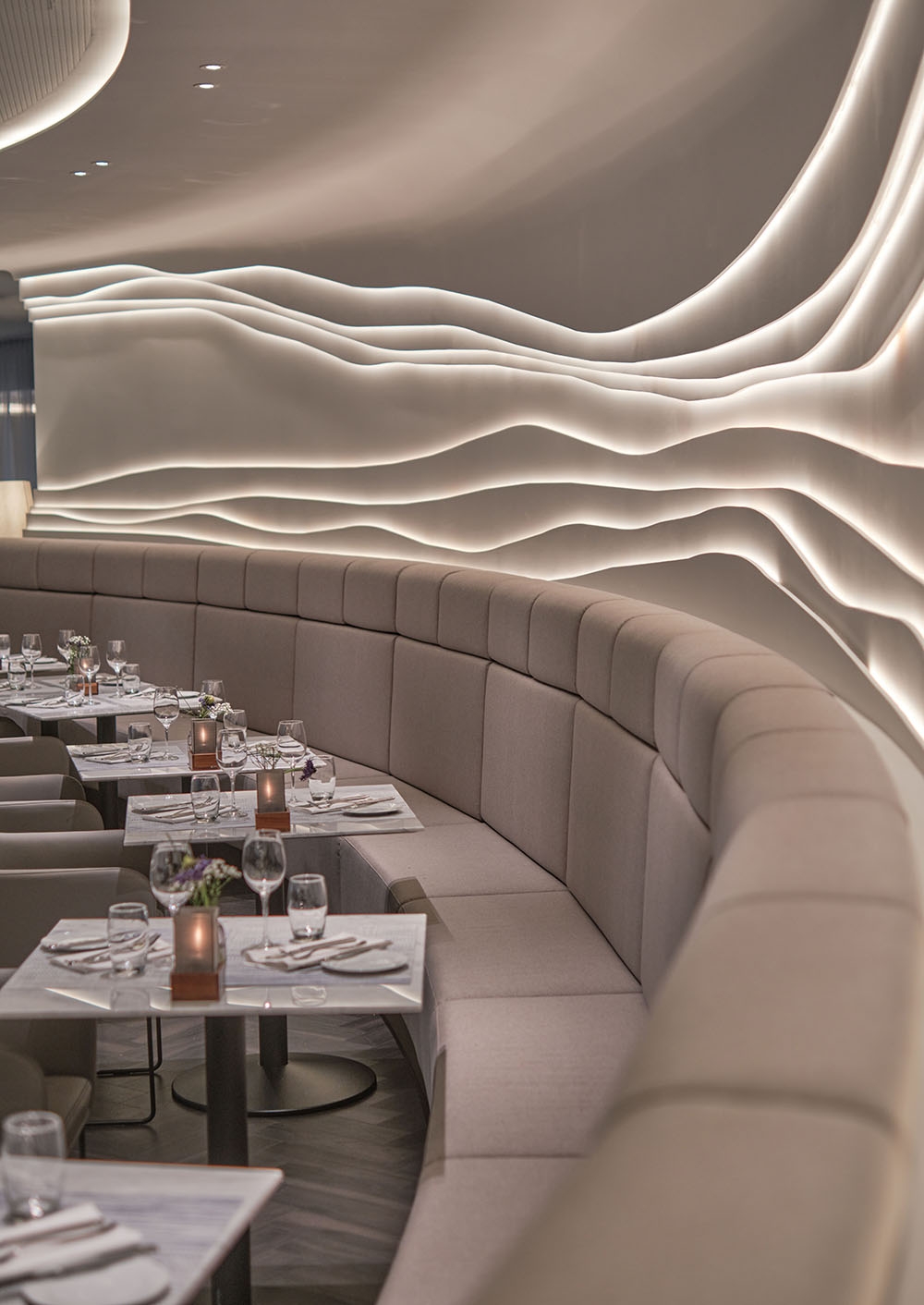 Due to its prominent situation on Fleetinsel island between the harbour & Alster canal, the Steigenberger Hotel Hamburg has been a luxurious ‘safe harbour’ since the 1990s. The designers reinvented their own decade-old concept for the rebranded venue ‘Restaurant am Fleet’. Previously named ‘Restaurant Calla’, the graceful calla lily inspired the original design’s textured stucco ripples inset within the walls. Now, the kernel of the new design has changed to ‘the pearl’, Hamburg’s nickname, to strengthen the sense of place & provide a segue linking the initial concept with the new one. White finishes with subtly shimmering lustre allude to the pearl, while fluid organic shapes take on a different dimension by recalling pearl age rings & the waves of the passing fleet. The restaurant’s original stucco wall feature is honoured with sinuous light strands newly embedded in the walls & ceiling. A room divider made from flowing metal ‘ribbons’ includes curves that create vantage points looking beyond the screen. Muted tone-on-tone colours create a tranquil ambience that encourages hotel guests & locals to relax & recharge their batteries for their next adventures in the Hanseatic city.