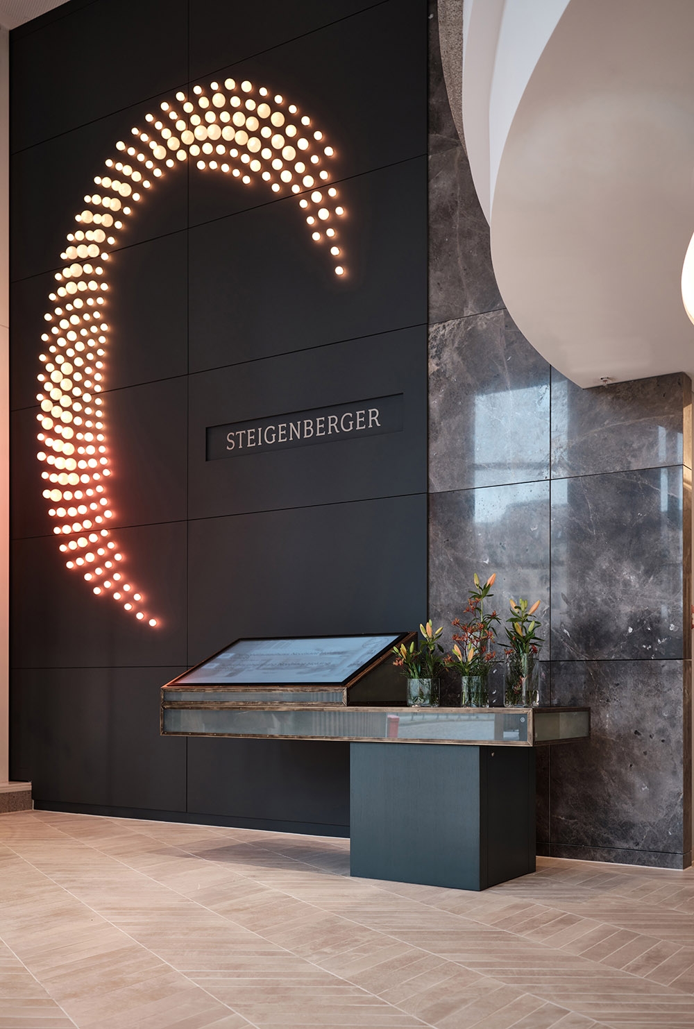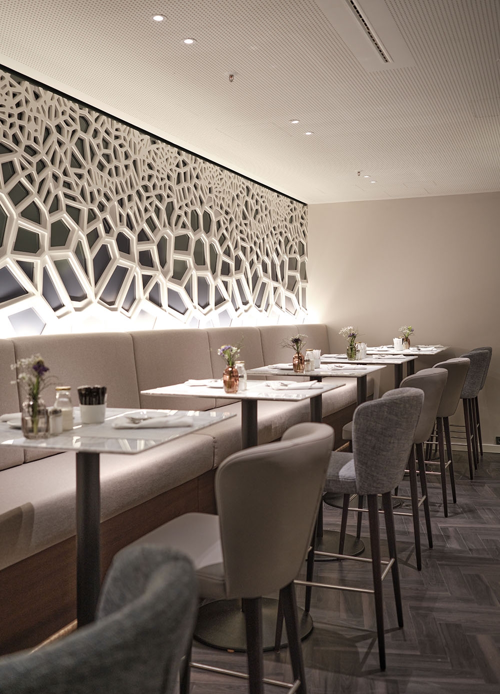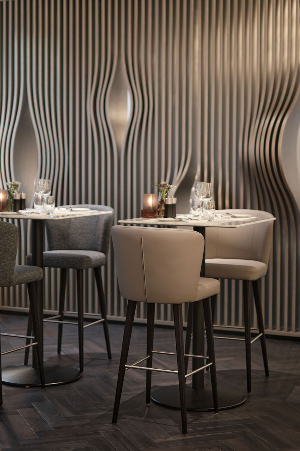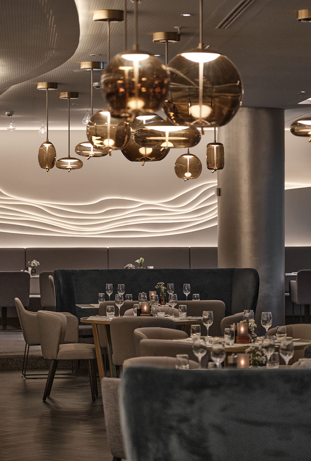 Due to its prominent situation on Fleetinsel island between the harbour & Alster canal, the Steigenberger Hotel Hamburg has been a luxurious ‘safe harbour’ since the 1990s. The designers reinvented their own decade-old concept for the rebranded venue ‘Restaurant am Fleet’. Previously named ‘Restaurant Calla’, the graceful calla lily inspired the original design’s textured stucco ripples inset within the walls. Now, the kernel of the new design has changed to ‘the pearl’, Hamburg’s nickname, to strengthen the sense of place & provide a segue linking the initial concept with the new one. White finishes with subtly shimmering lustre allude to the pearl, while fluid organic shapes take on a different dimension by recalling pearl age rings & the waves of the passing fleet. The restaurant’s original stucco wall feature is honoured with sinuous light strands newly embedded in the walls & ceiling. A room divider made from flowing metal ‘ribbons’ includes curves that create vantage points looking beyond the screen. Muted tone-on-tone colours create a tranquil ambience that encourages hotel guests & locals to relax & recharge their batteries for their next adventures in the Hanseatic city.