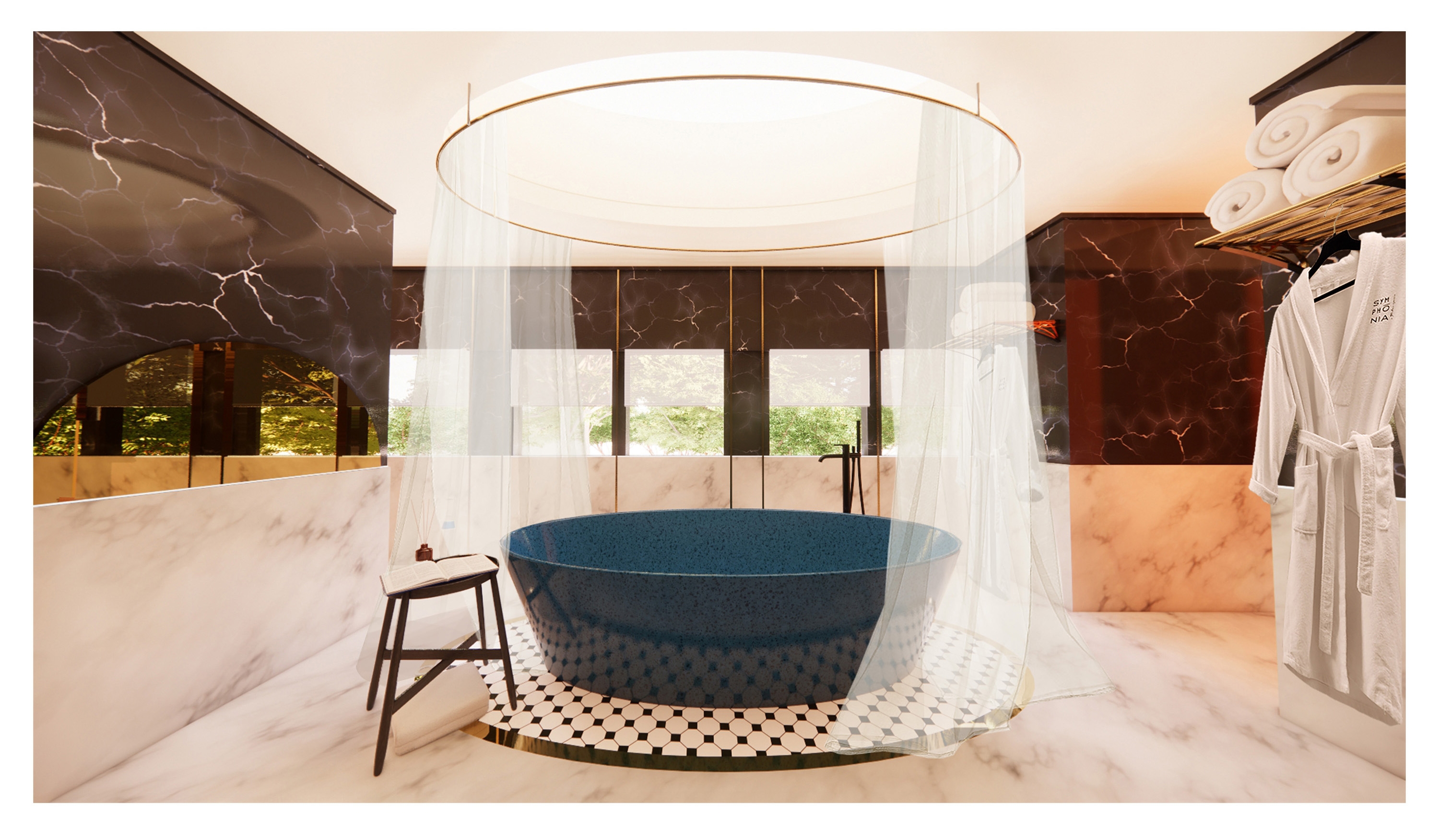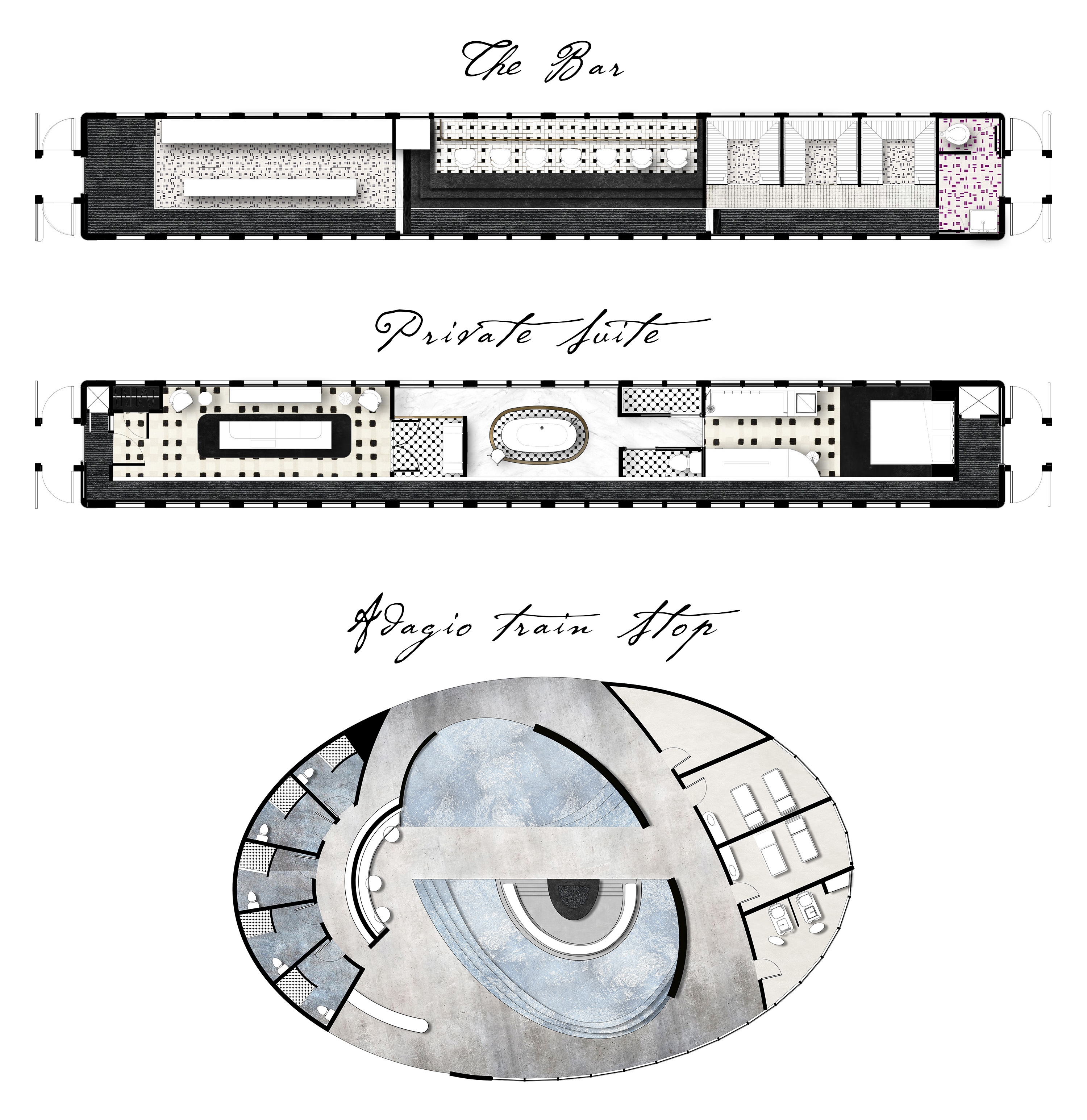 An orchestra aligns its individual pieces to create a single evocative note, unifying the symphony's tune as the sound unravels into distinct instrumental elements. Much like instruments forming that note, human senses craft our reality. Inspired by the intricate harmony of an orchestra, Symphonia engages guests through theatrical encounters framed within vivid surroundings. At every stop, a captivating rendezvous awaits, perfectly attuned to a symphony's cadence - an exhilarating private concert, a languid spa interlude, and a vibrant ball to conclude. The train harmoniously adapts, allowing guests to traverse the experience with the fluidity of musical notes. Harnessing the influence of scale and color, Symphonia guides guests through dramatic and sensorial movements, deconstructing their reality and culminating in a realigning finale upon re-entry into the world.