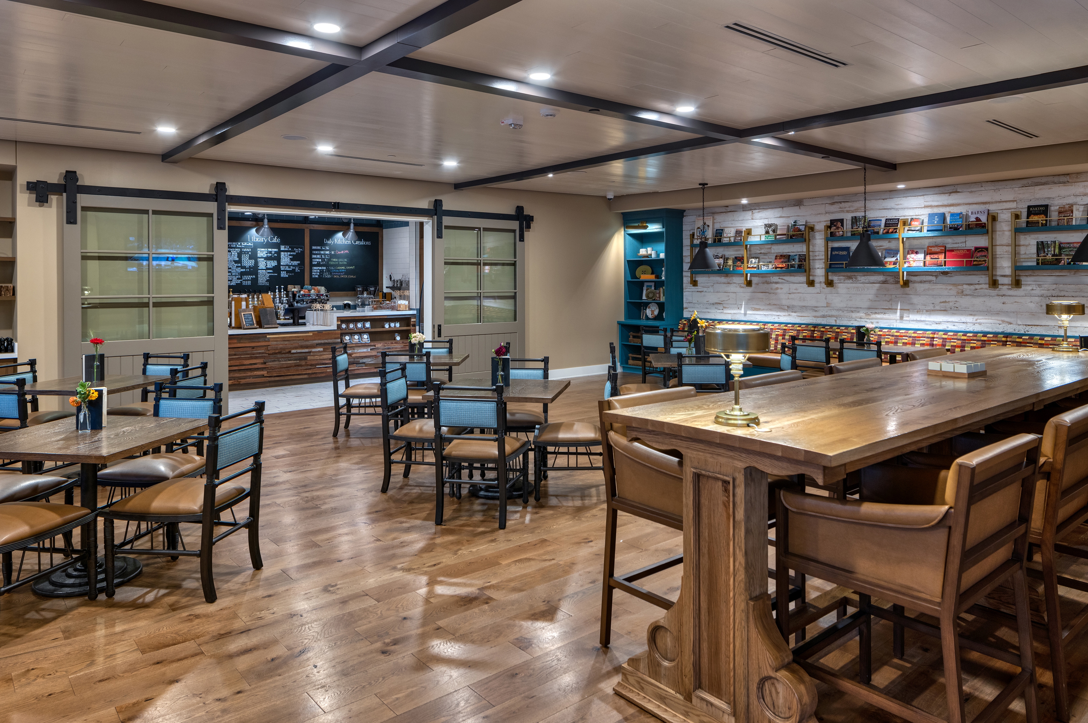 The Library Café is positioned as a café by day and a bar by night and offers a cozy setting for guests. It serves specialty coffees, freshly made grab-n-go items, in-house baked goods, and breakfast during the day. In the evening, the adjacent Library Bar provides cocktails and local favorites.