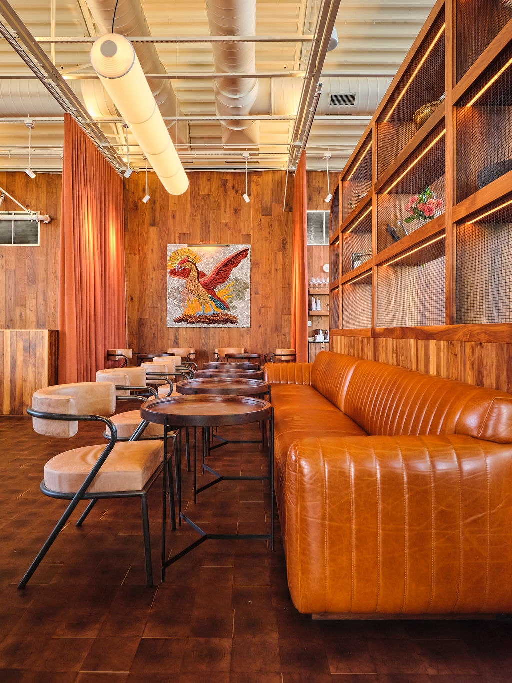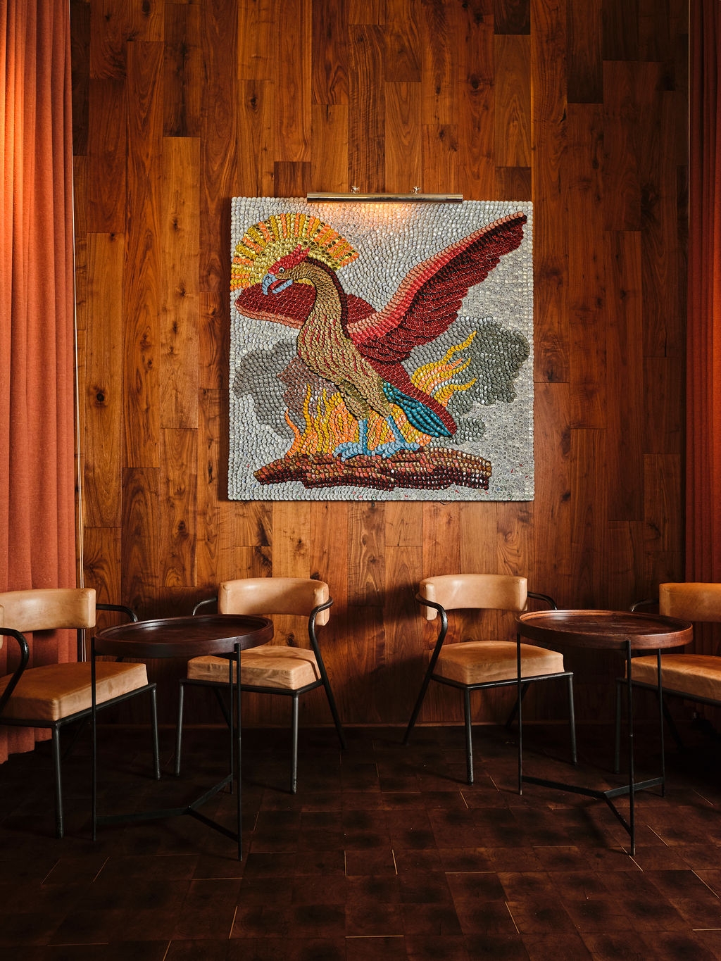 Amidst minimal wall art, a singular piece – an intricately crafted Phoenix sculpture made of upcycled bottle caps – takes center stage. Symbolizing the restaurant’s resurgence from the ashes, this commissioned artwork embodies the narrative of renewal and triumph.