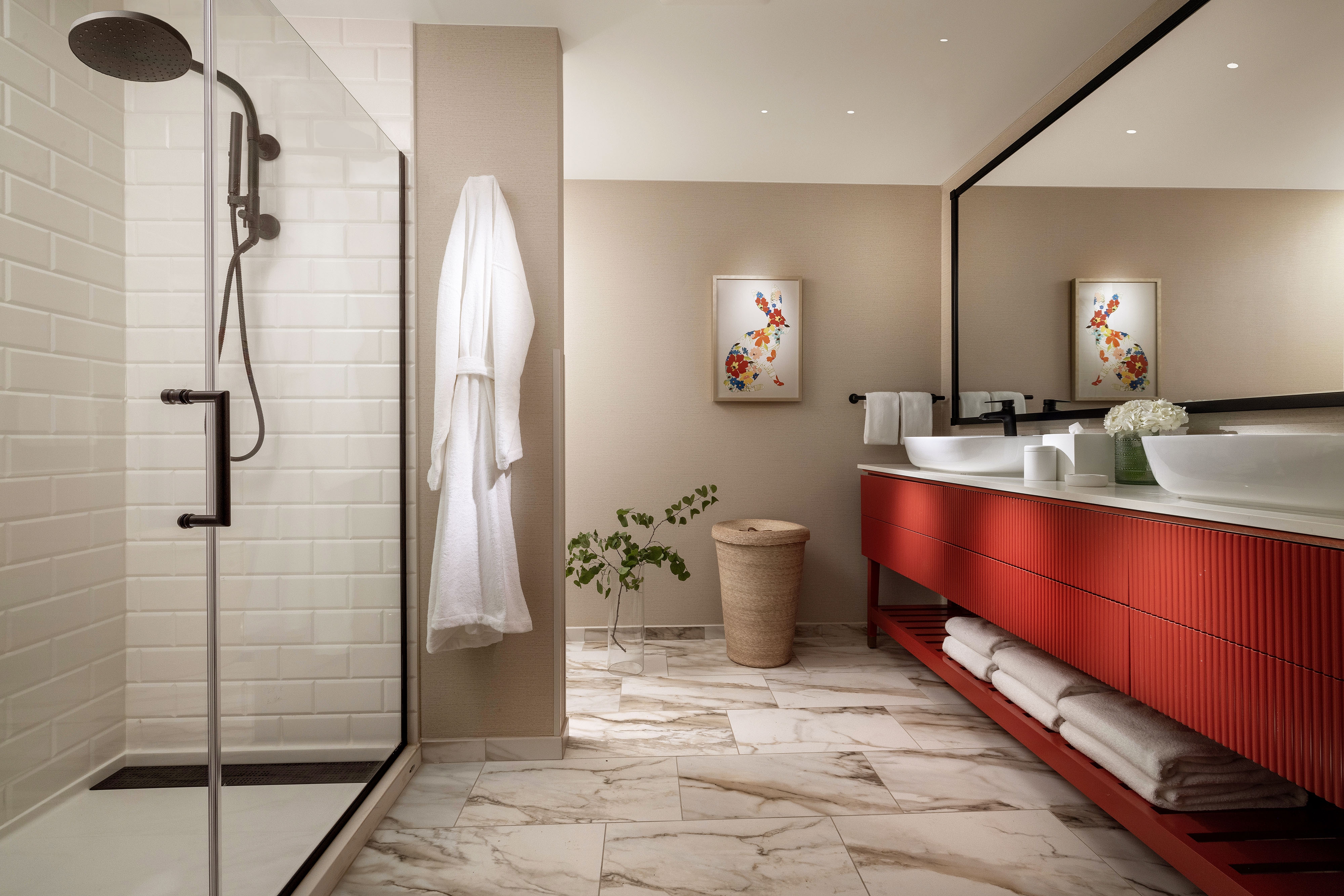 Rustic and quiet with a hint of a bold hip vibe, the red colored vanities set a tone for a wonder filled surprise with charming and intimate details. Cerused oak finishes are used throughout to pay homage to the property oak tree and make the rooms blend into its natural surroundings.