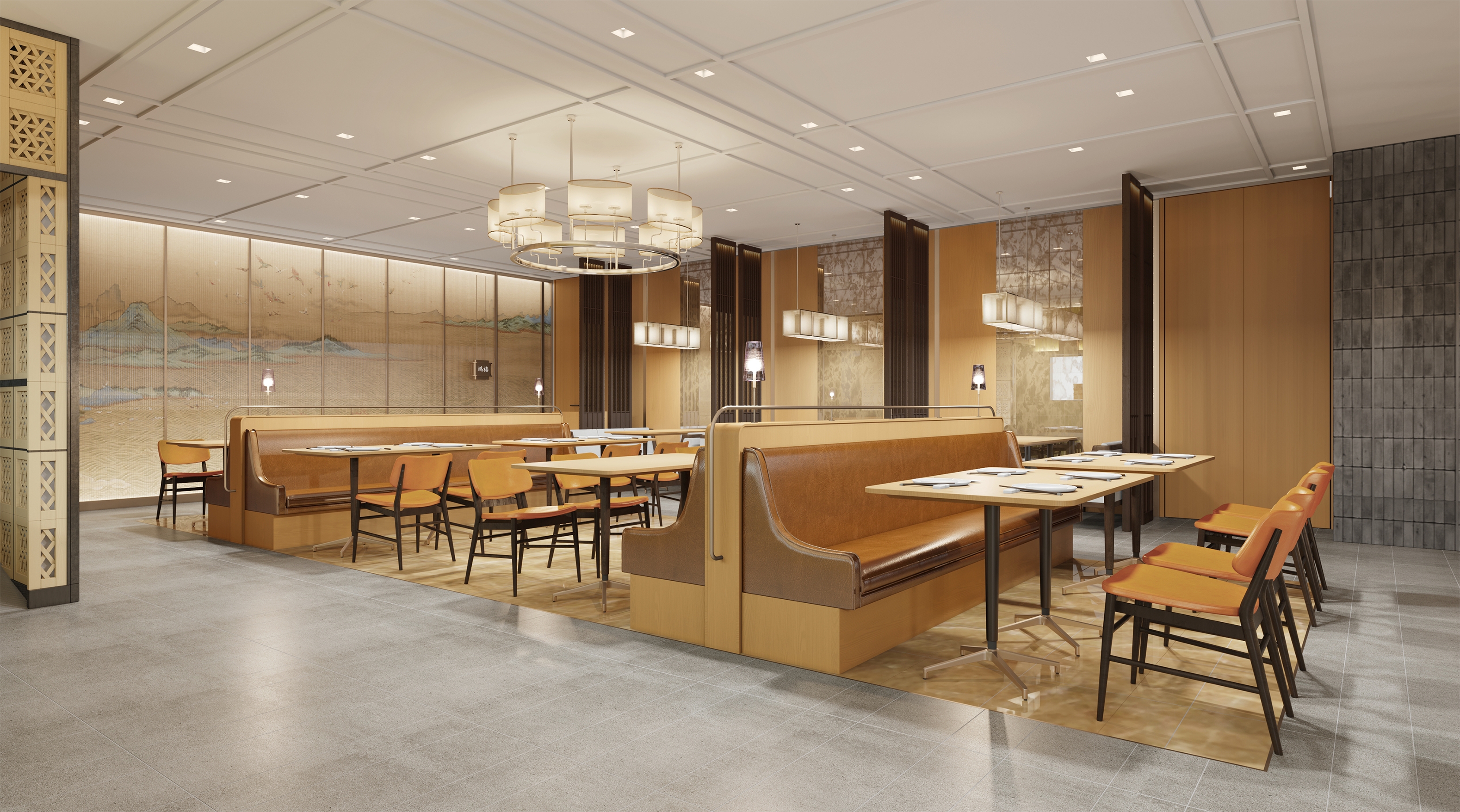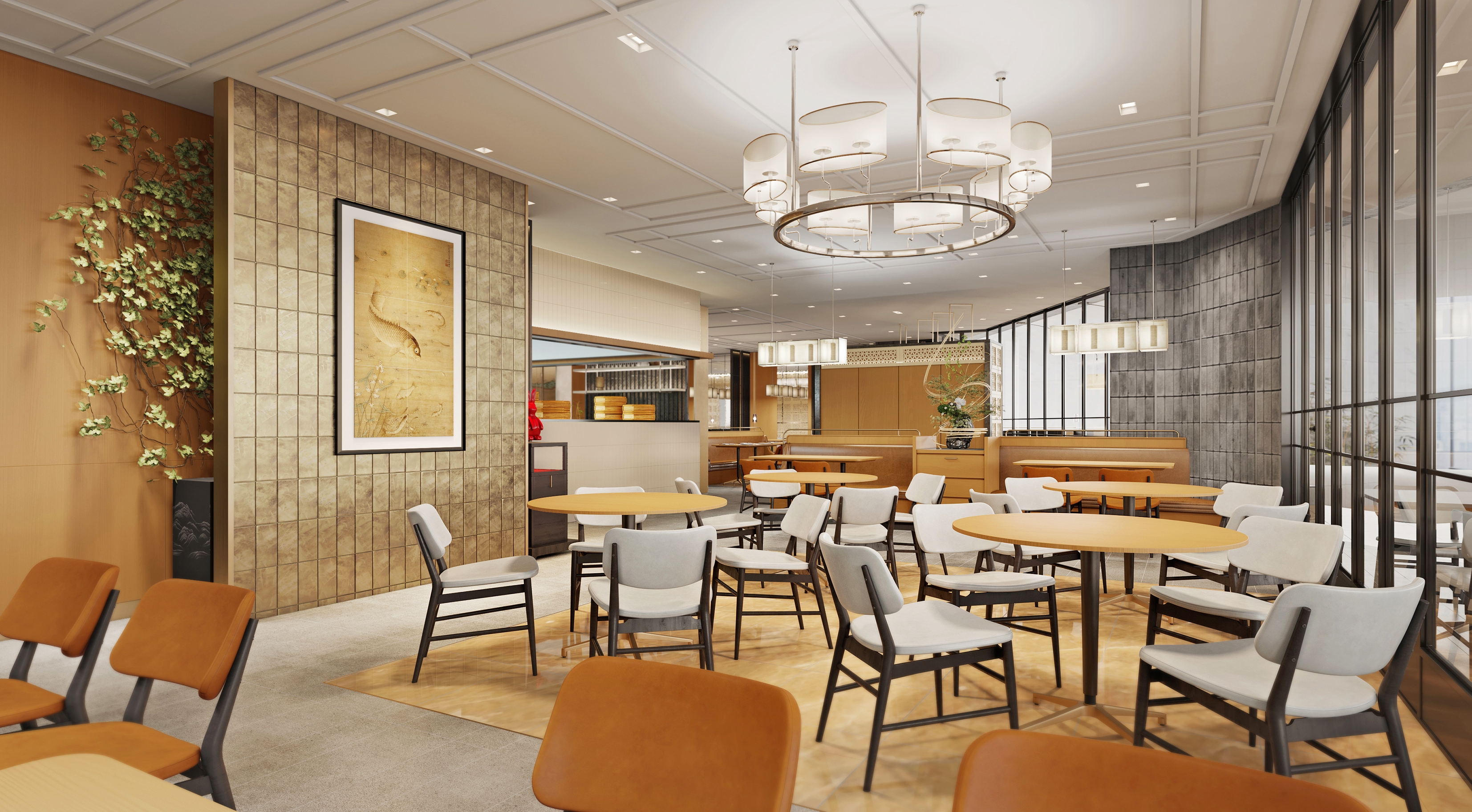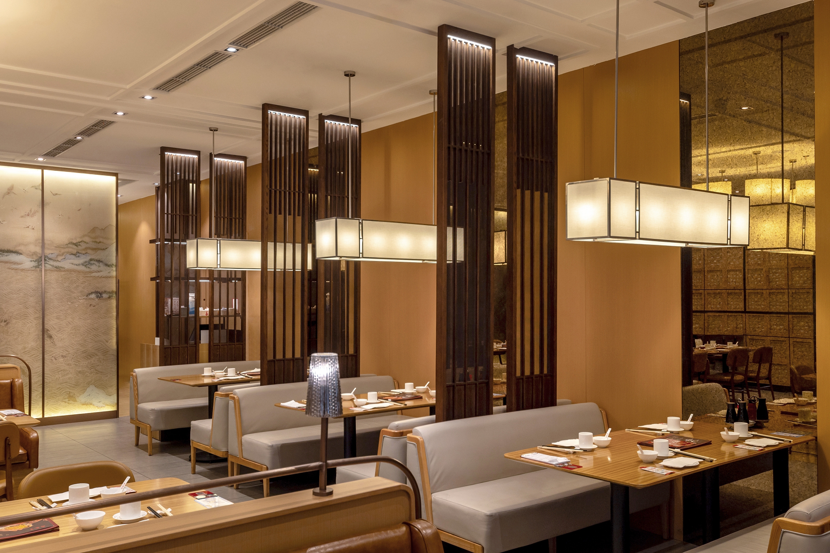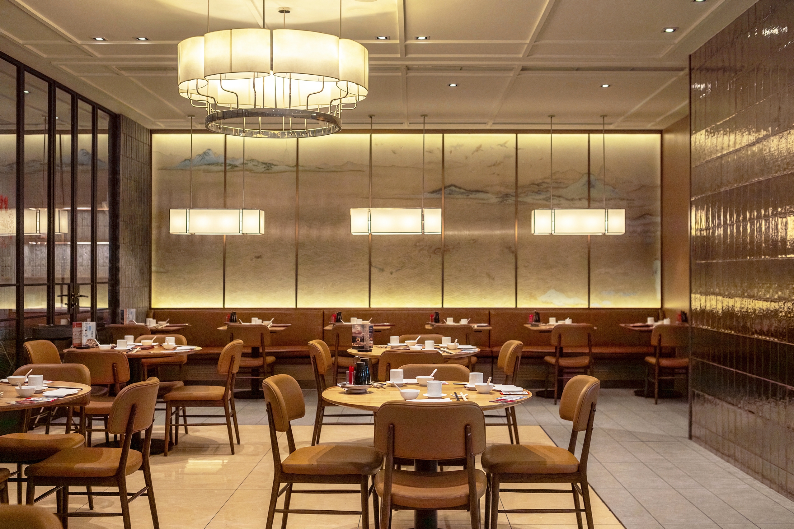 The designer has enabled an elegant and pleasing spatial atmosphere through a combined utilization of the traditional Chinese elements and the modern materials. The design vocabulary concerning rattan plaited elements has run through from the Store front and signboard toward those interior partitions, thereby injecting a refreshing and cheerful sense into the whole space. The wall surface, adopting largely a simple burly wood color as its main tone, is partially embellished with ink and wash paintings displaying green mountains and clear waters. The chairs adopt brown leather for an enhanced retro texture so as to arrange diners amidst mountains and rivers, and allow them to easily appreciate the beautiful landscape scenery and the pleasant dining atmosphere. Under the warm atmosphere set by simple and concise retro chandelier, friends and family members sitting around create a warm poetic picture that relaxes them all. Simultaneously, they can feel a sense of Chinese elegance and subtlety inside the entire space.