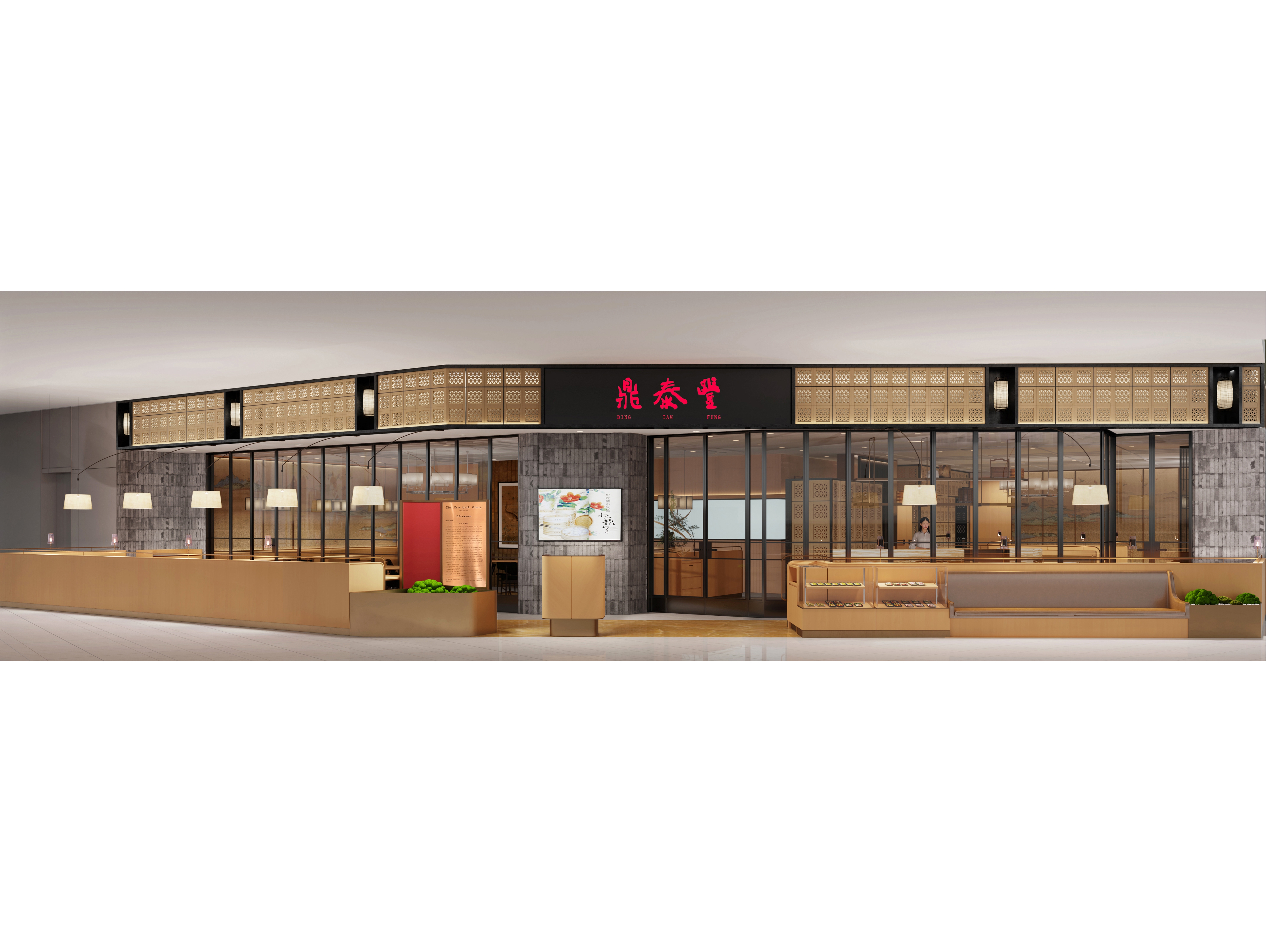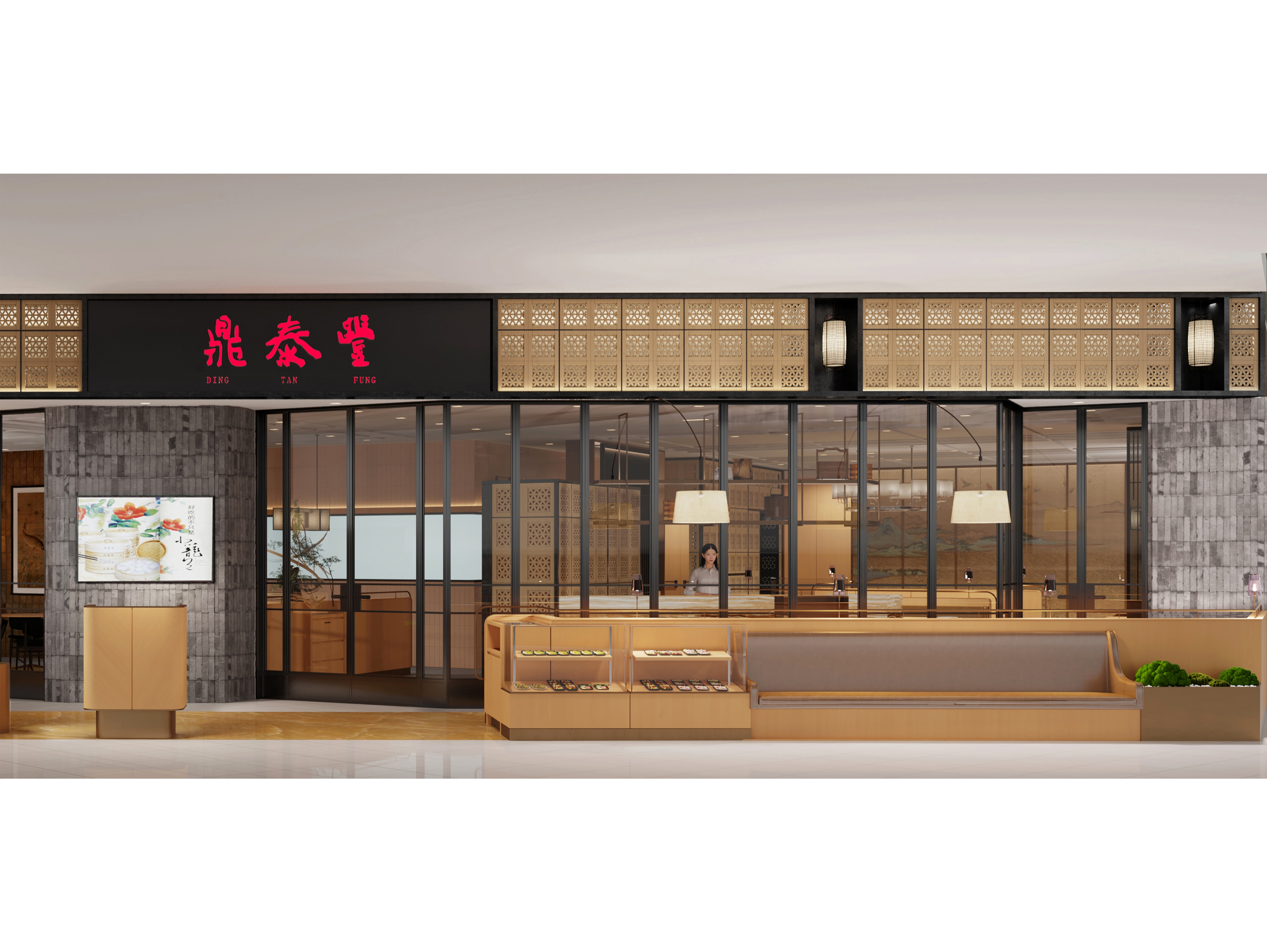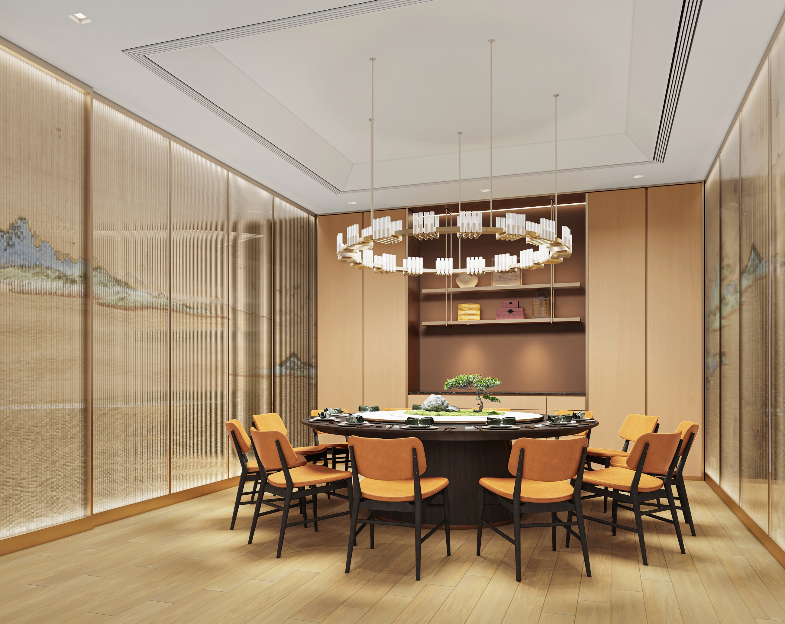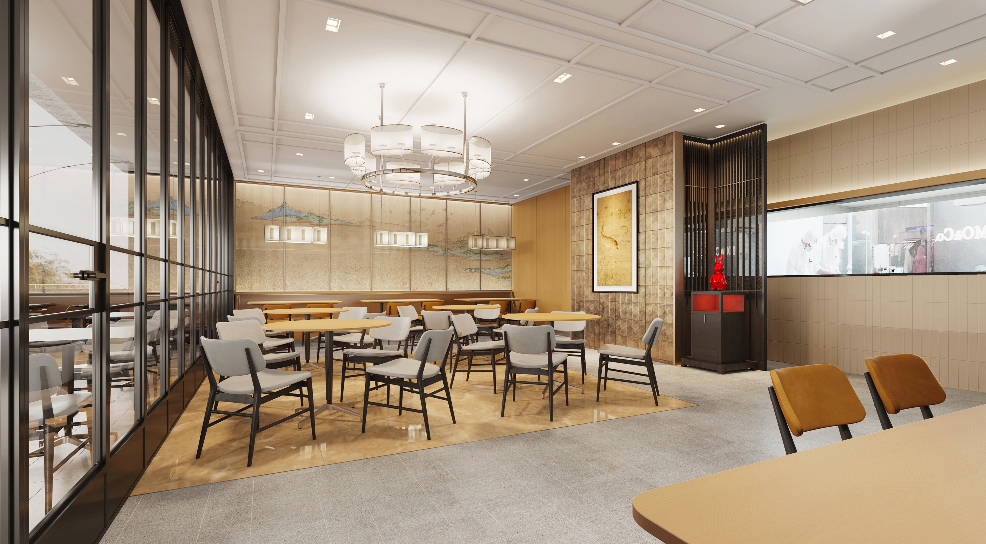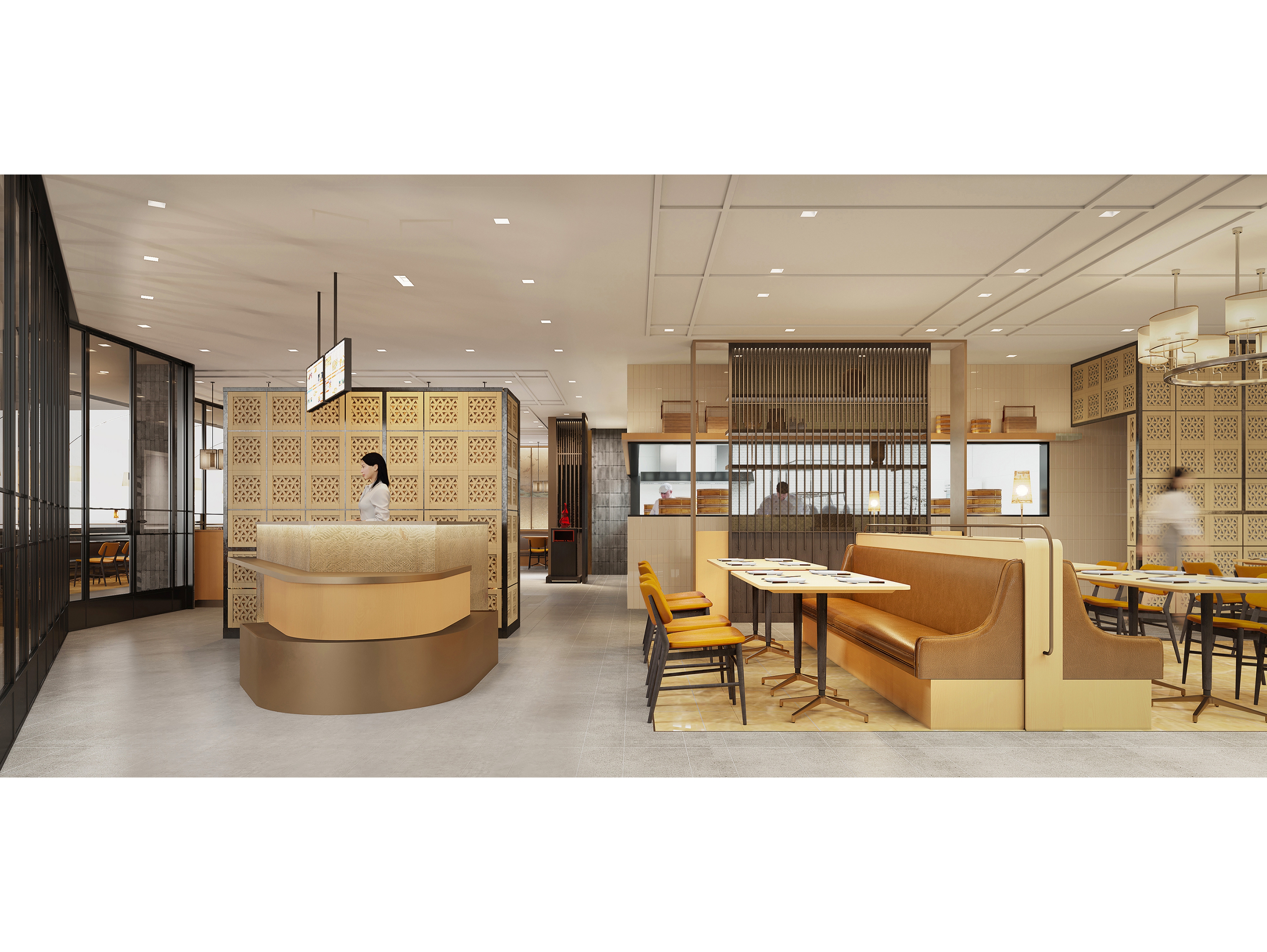 The designer has enabled an elegant and pleasing spatial atmosphere through a combined utilization of the traditional Chinese elements and the modern materials. The design vocabulary concerning rattan plaited elements has run through from the Store front and signboard toward those interior partitions, thereby injecting a refreshing and cheerful sense into the whole space. The wall surface, adopting largely a simple burly wood color as its main tone, is partially embellished with ink and wash paintings displaying green mountains and clear waters. The chairs adopt brown leather for an enhanced retro texture so as to arrange diners amidst mountains and rivers, and allow them to easily appreciate the beautiful landscape scenery and the pleasant dining atmosphere. Under the warm atmosphere set by simple and concise retro chandelier, friends and family members sitting around create a warm poetic picture that relaxes them all. Simultaneously, they can feel a sense of Chinese elegance and subtlety inside the entire space.