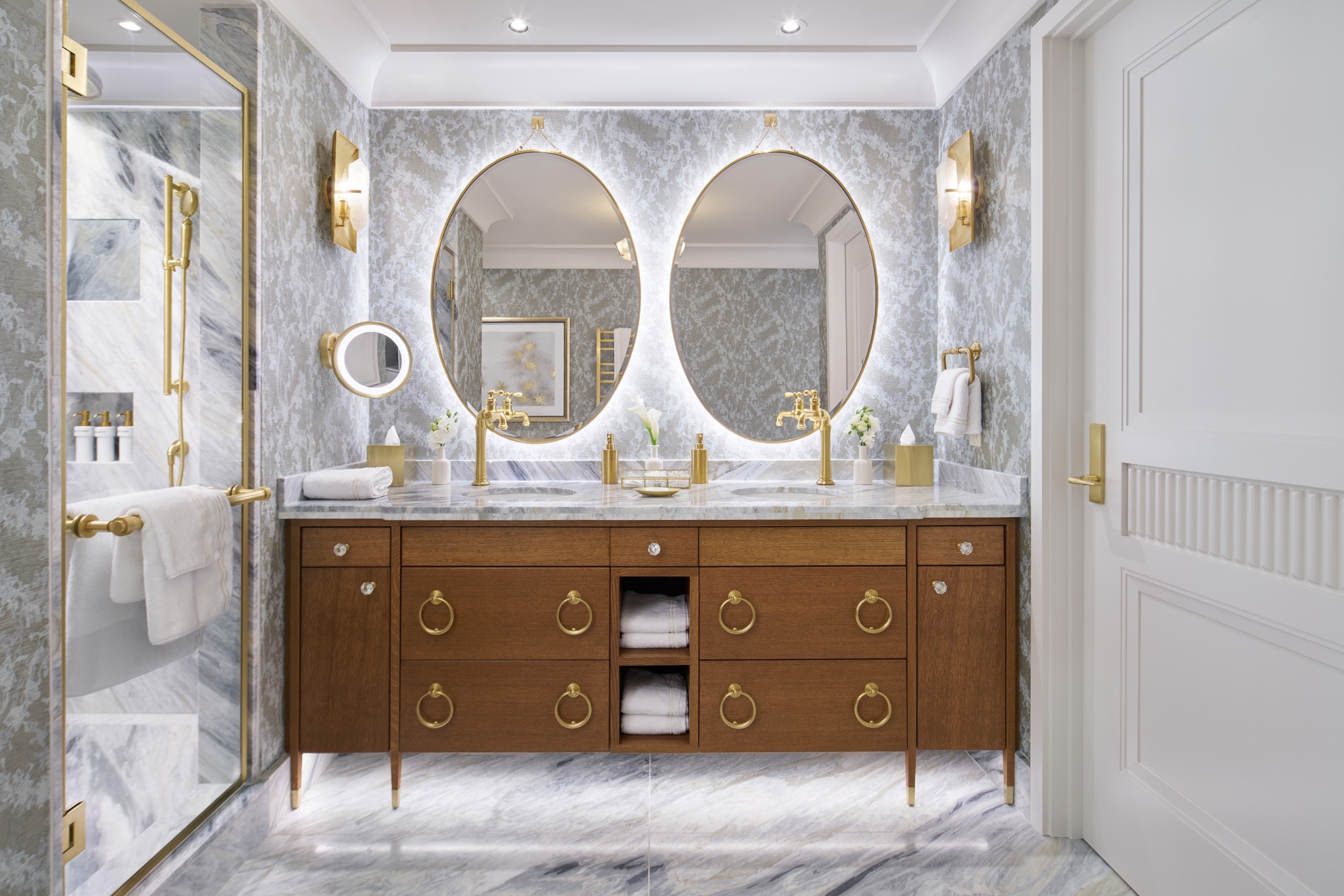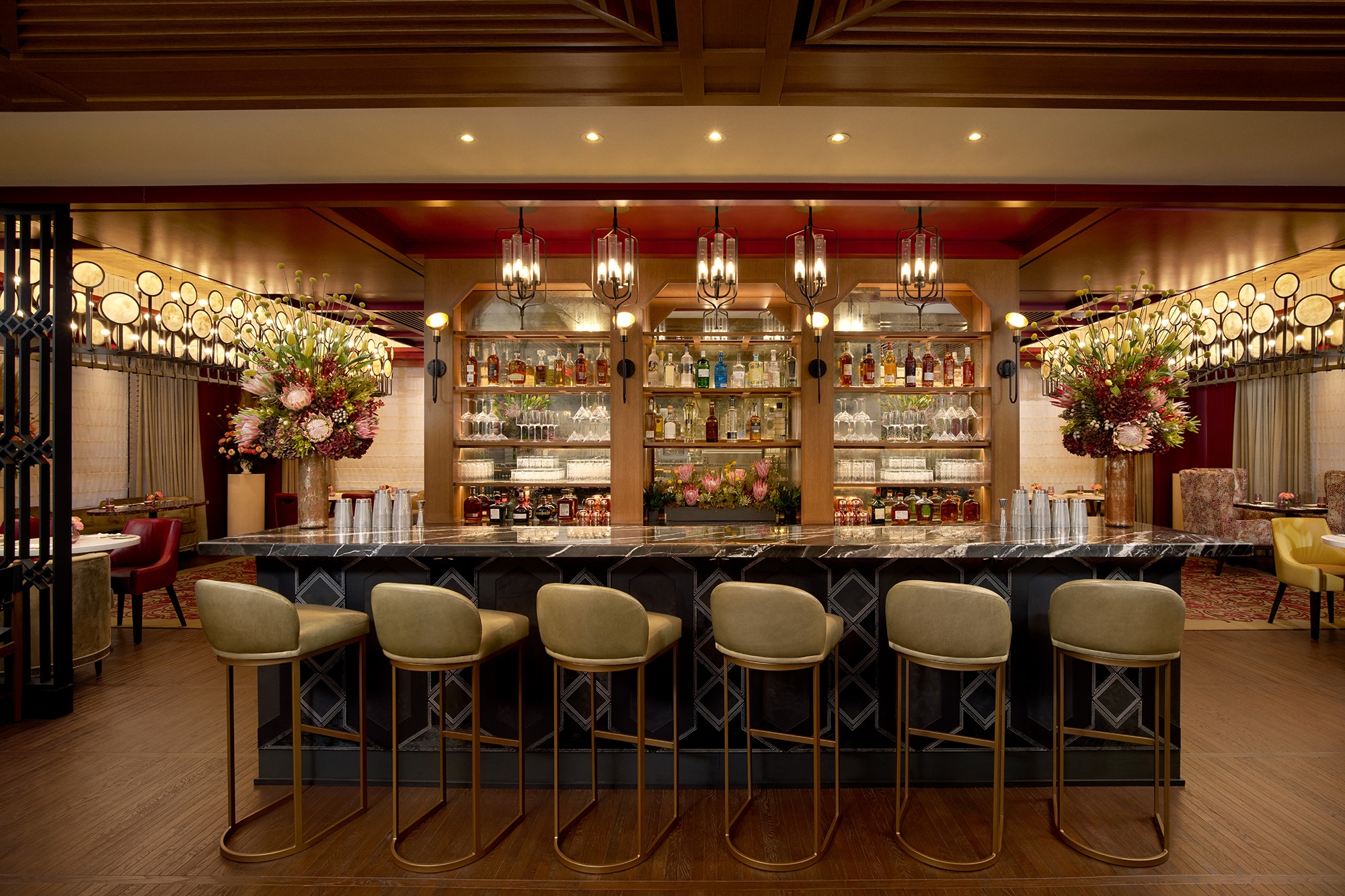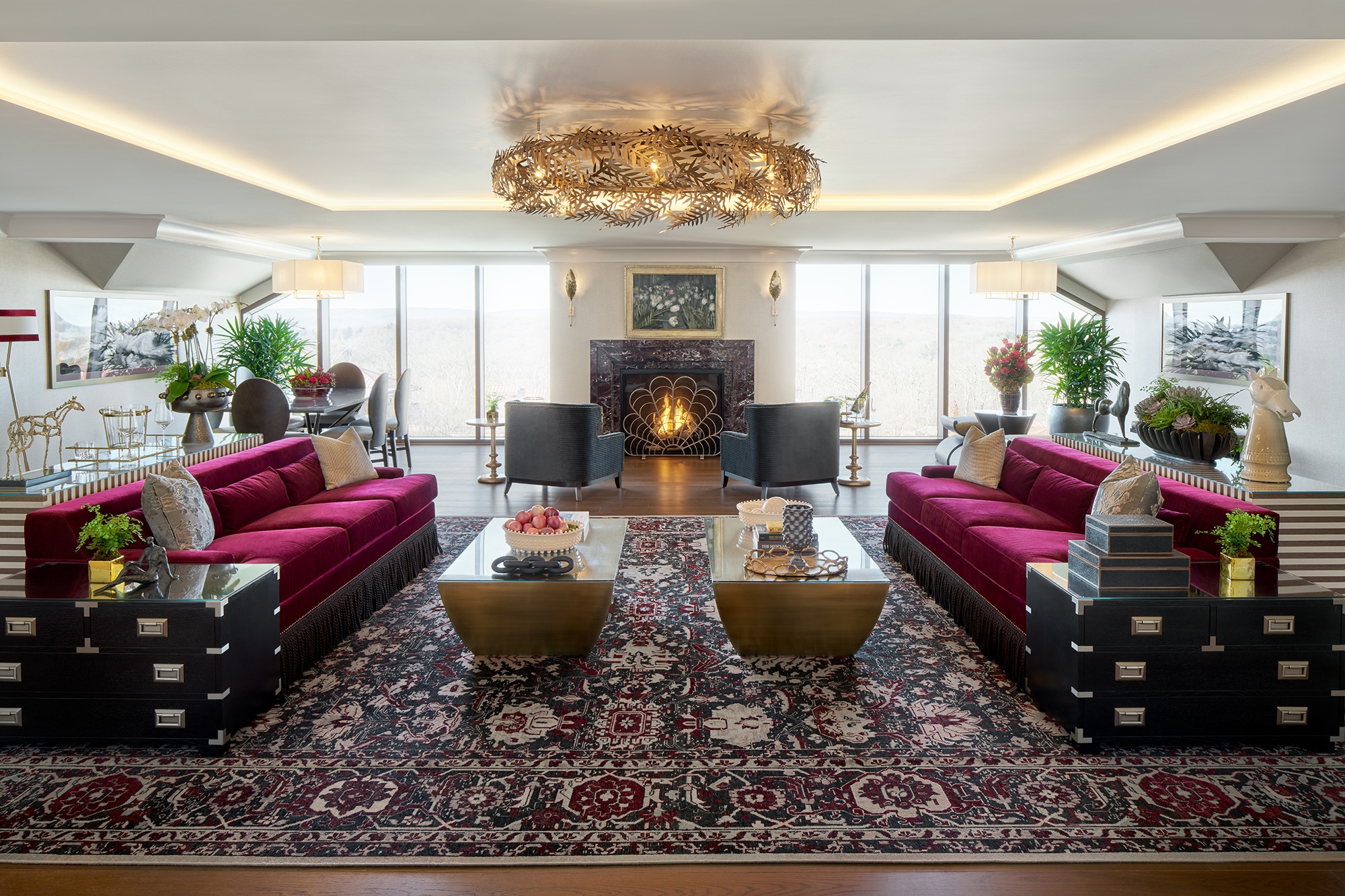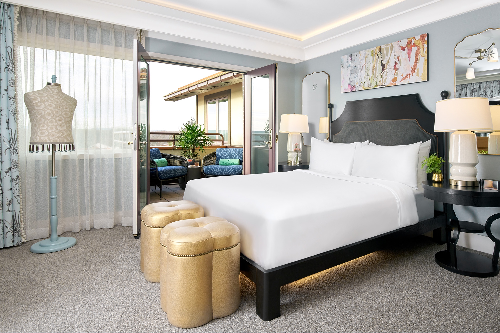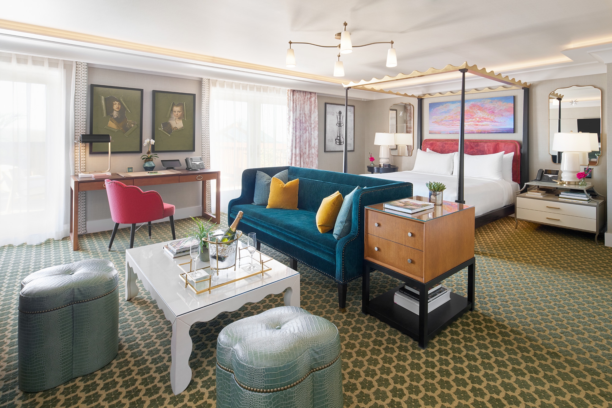 Each of the 56 suites marries woodsy charm with contemporary aesthetics to create a modern iteration of a woodland retreat with mid-century, modern decor elements including lighting, jewel tones, and gold and marble accents. Make-believe comes to life with a grand four-poster bed and a sitting area with fanciful boutique embellishments. Large bathrooms, many with freestanding soaking tubs, feature Italian marble countertops and flooring, chandeliers, and elegant gold and brass accents that create a relaxing atmosphere where guests can unwind after an activity-filled day. After a soak, guests can sip a beverage overlooking stunning panoramic views of the Laurel Highlands. Select suites feature an in-room fireplace or a private balcony.