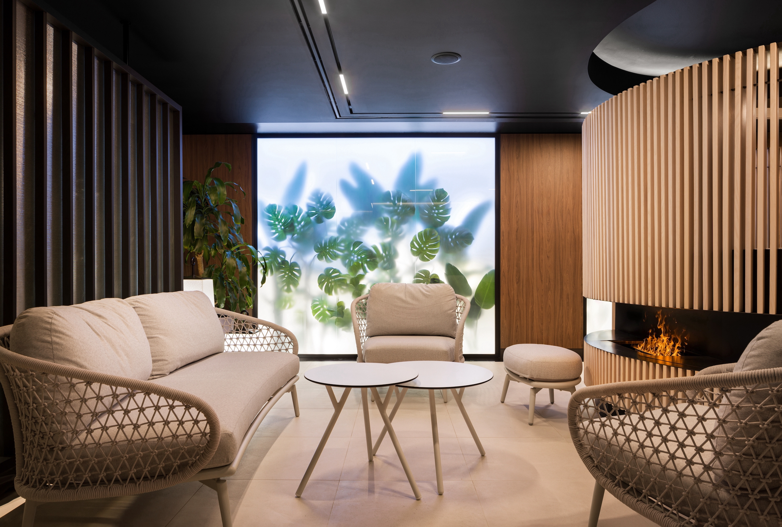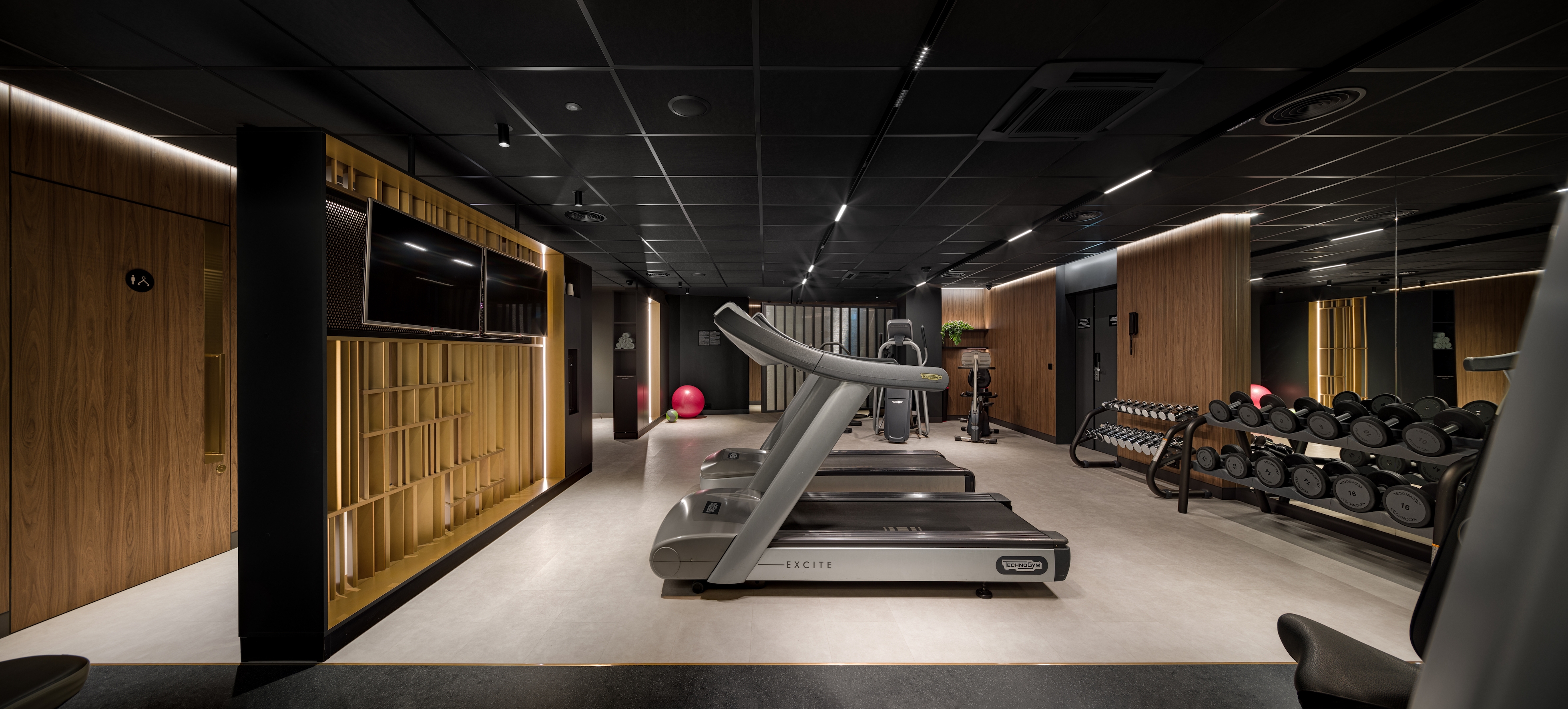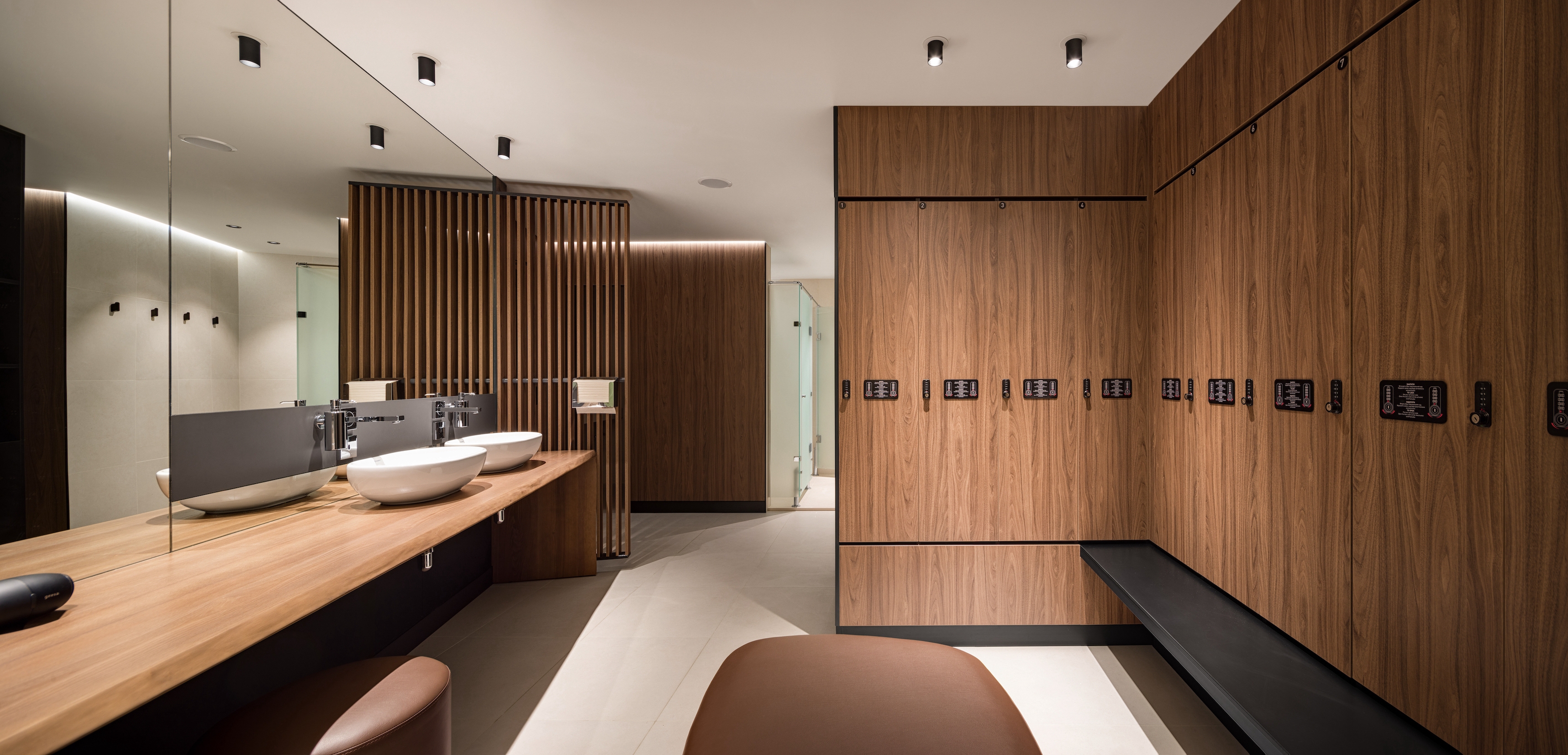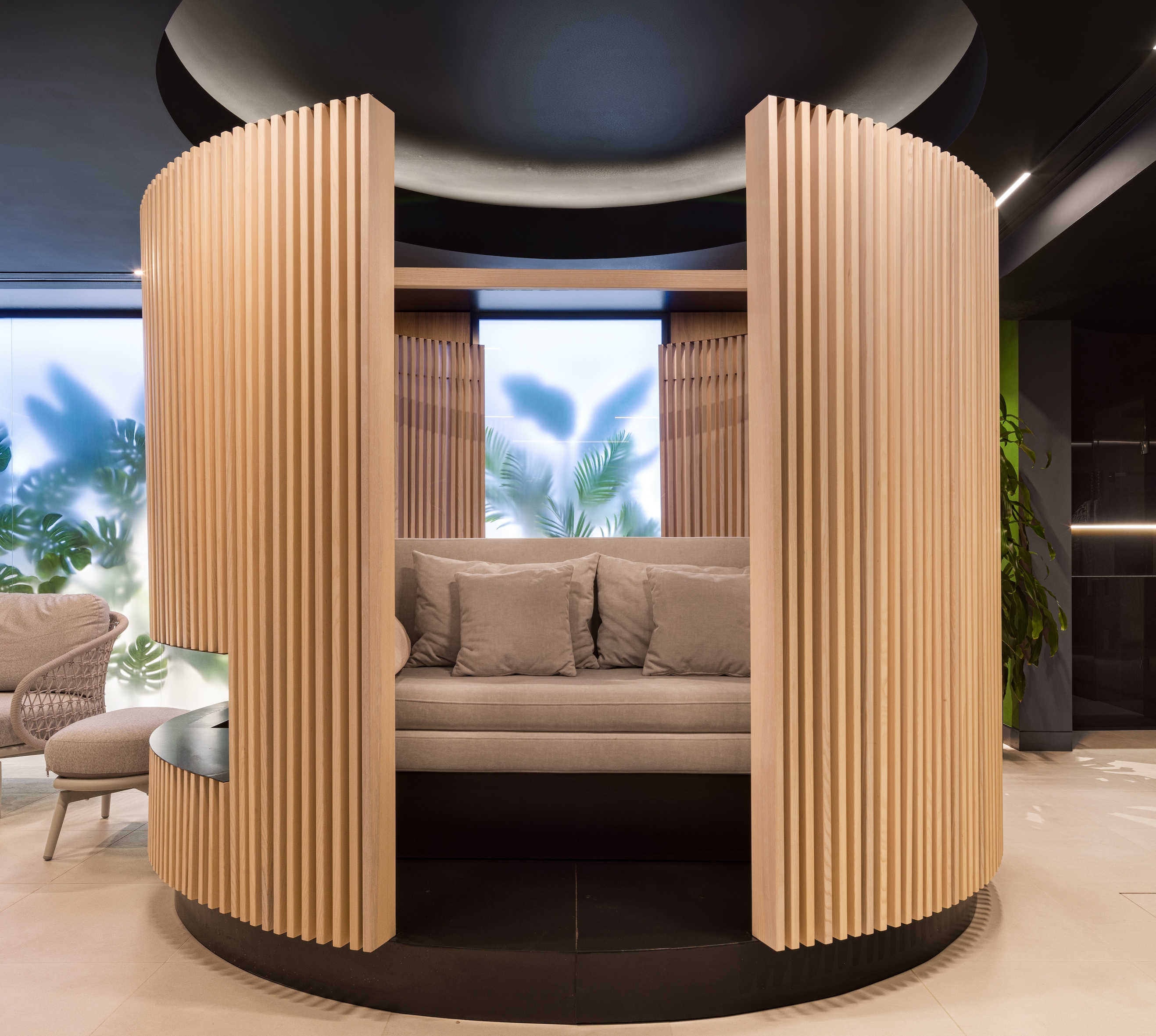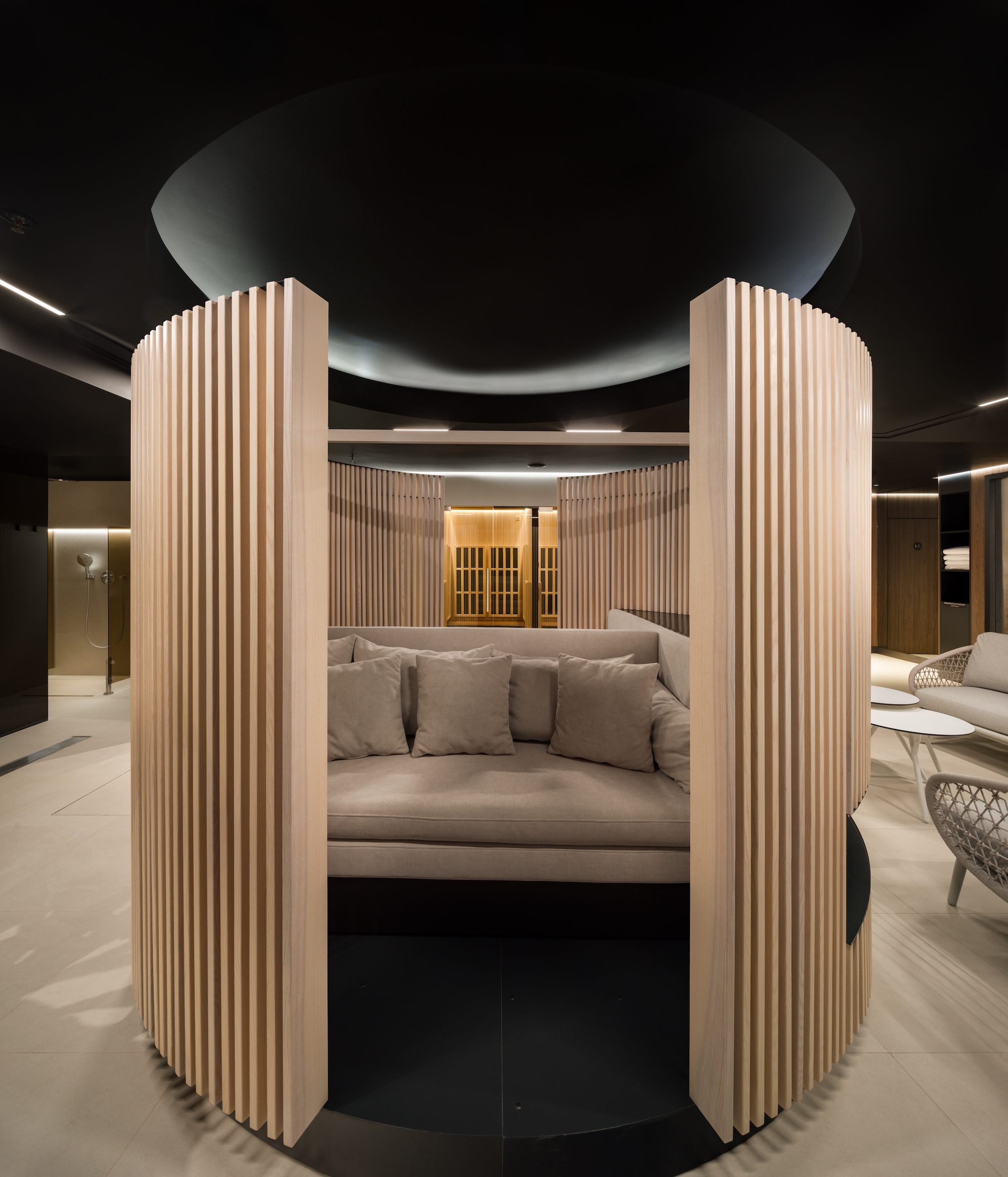 Every element of this carefully crafted space serves a specific purpose: the black ceiling addresses the challenge of low height by adding perceived depth, while reflections subtly mimic the elemental nature of water. Mirrors are strategically placed to enhance depth and ensure continuity. The semi-secluded lounges and individual mini-saunas, born from pandemic necessity, offer private nooks for relaxation and introspection.