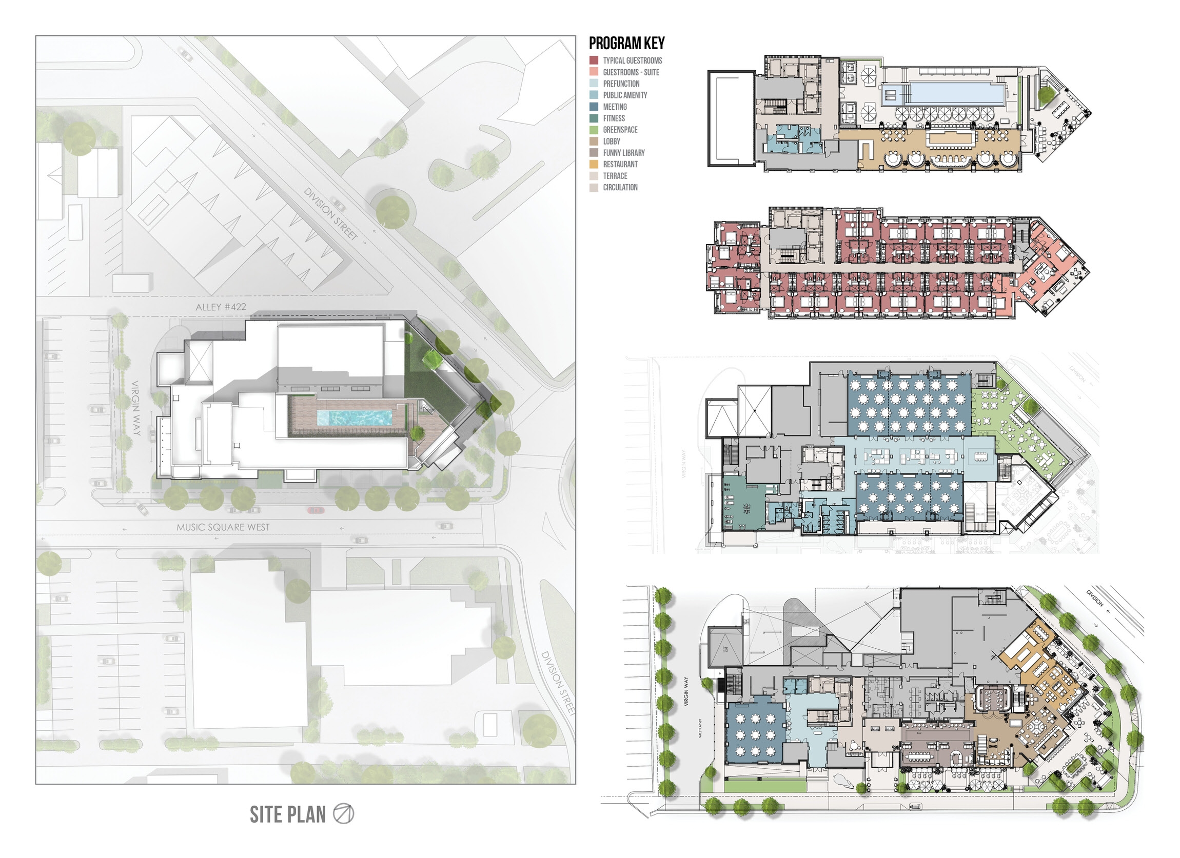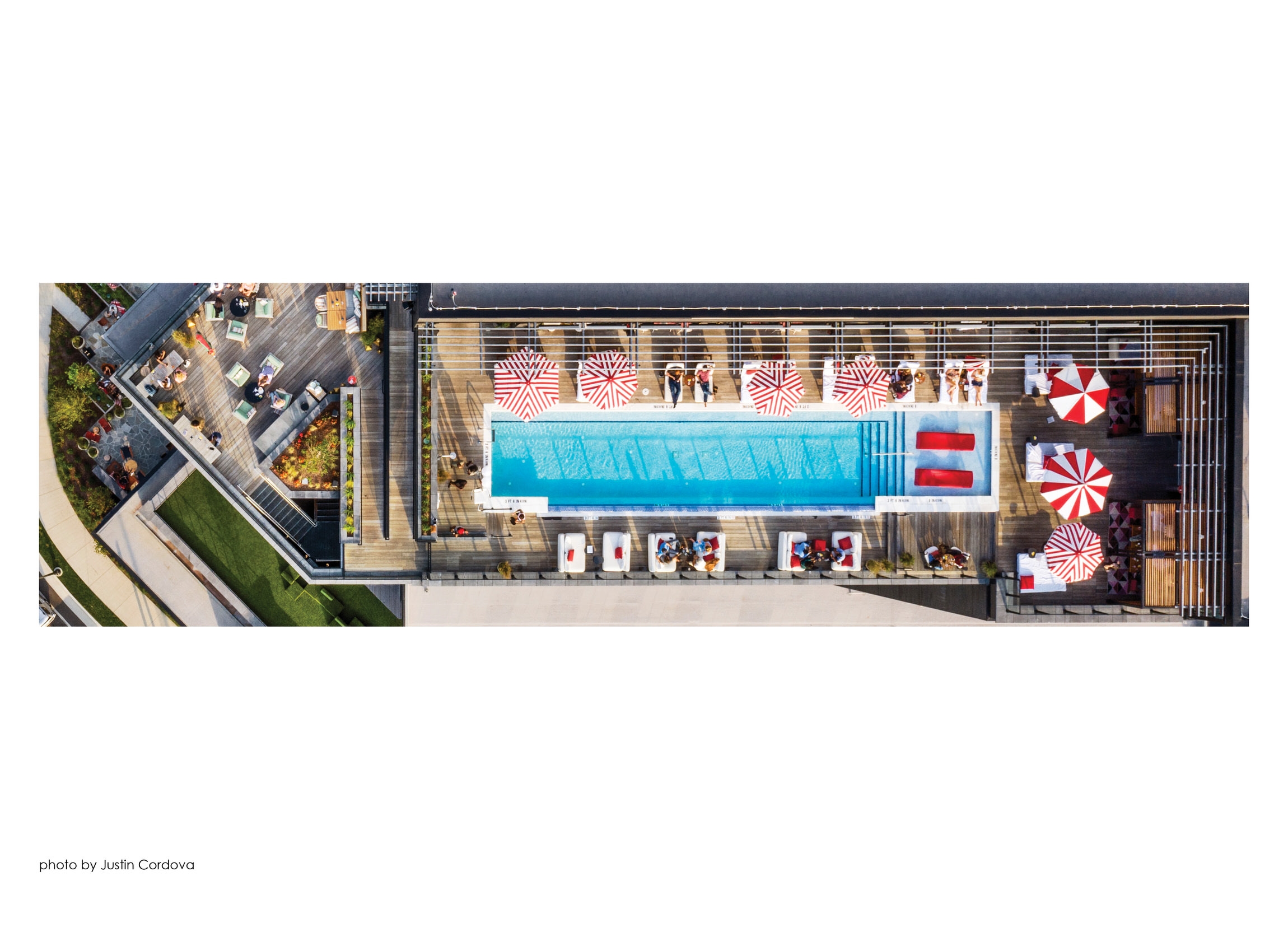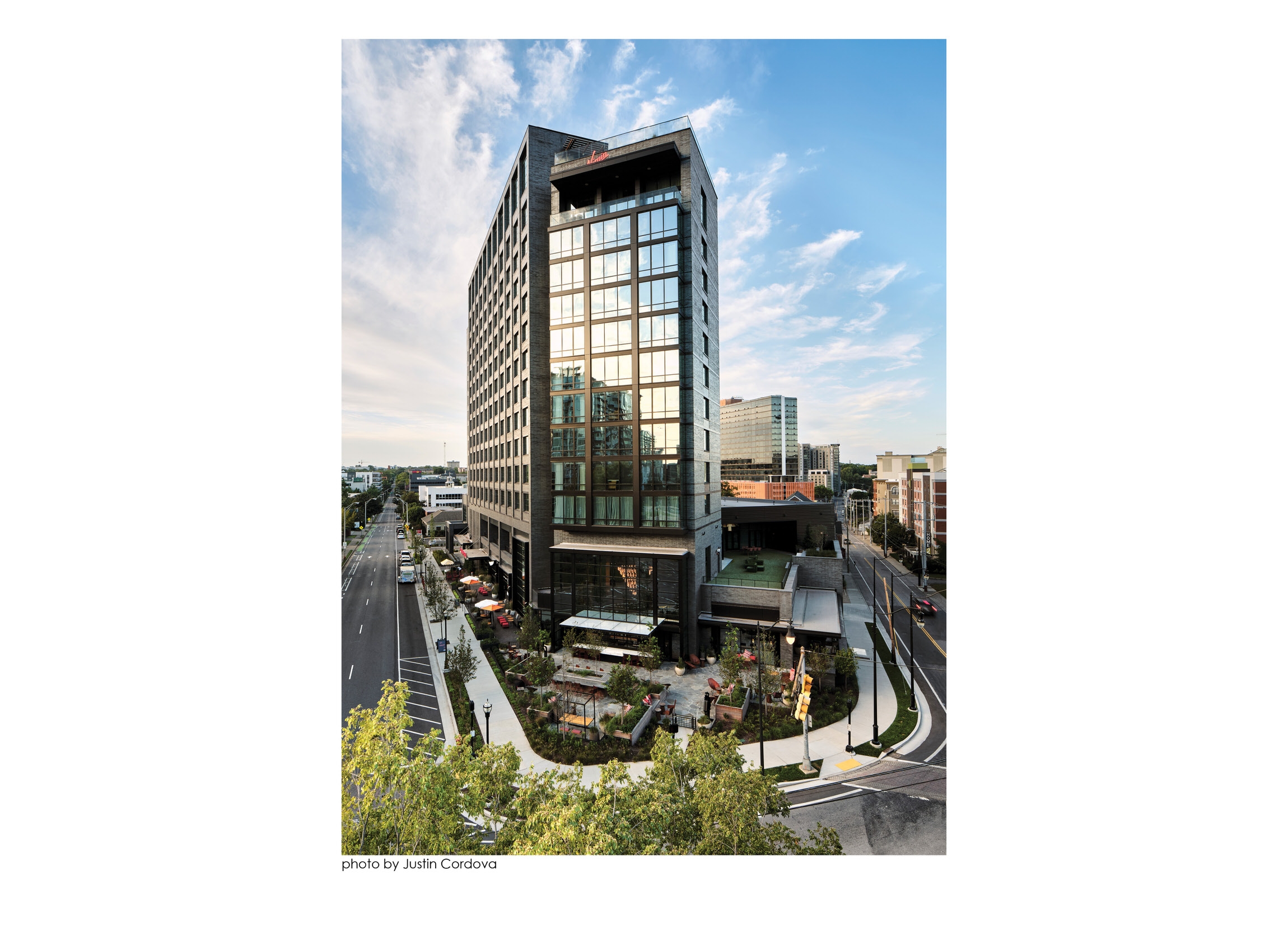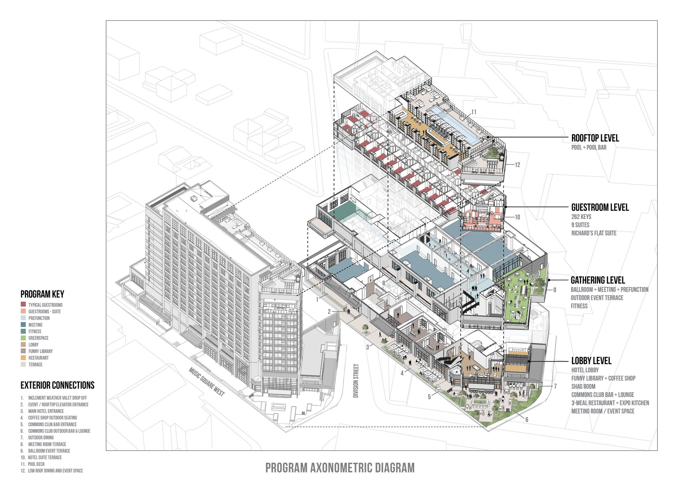 Albeit on the edge of a famous district, the site lacked substantial foot traffic to support our diverse program. We saw this as a challenge to draw in Nashville’s downtown hustle via an architectural solution. That solution laid in activating the entire length of building frontage with a series of different indoor/outdoor experiences. The hotel borders two public streets, Division Street and Music Square West. The visual prominence of this intersection was ample reason to extend the Commons Club outdoors, further activating the street. This exterior extension features lush plantings which create intimate seating groups along the perimeter while a large, communal tree table occupies the center the space.