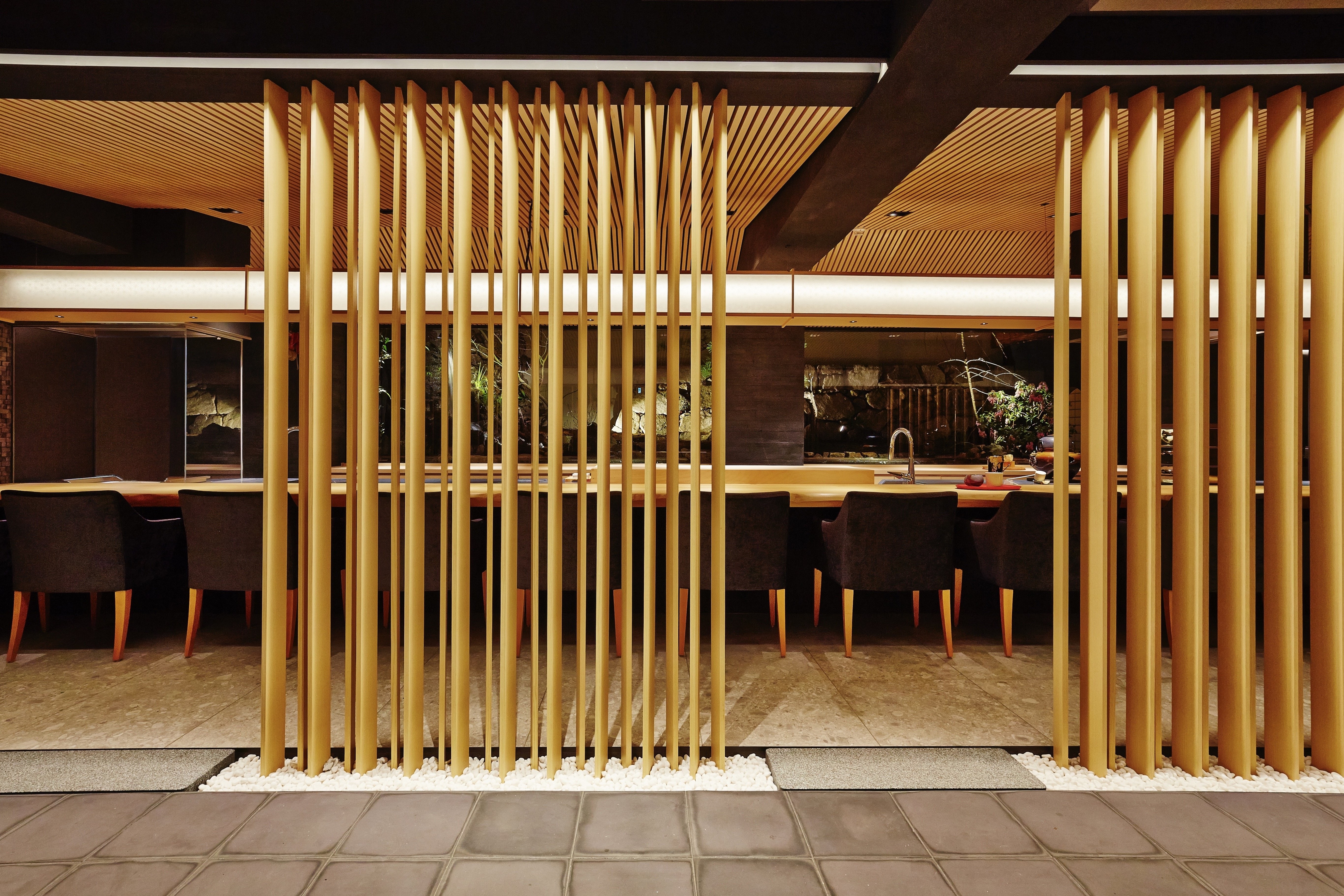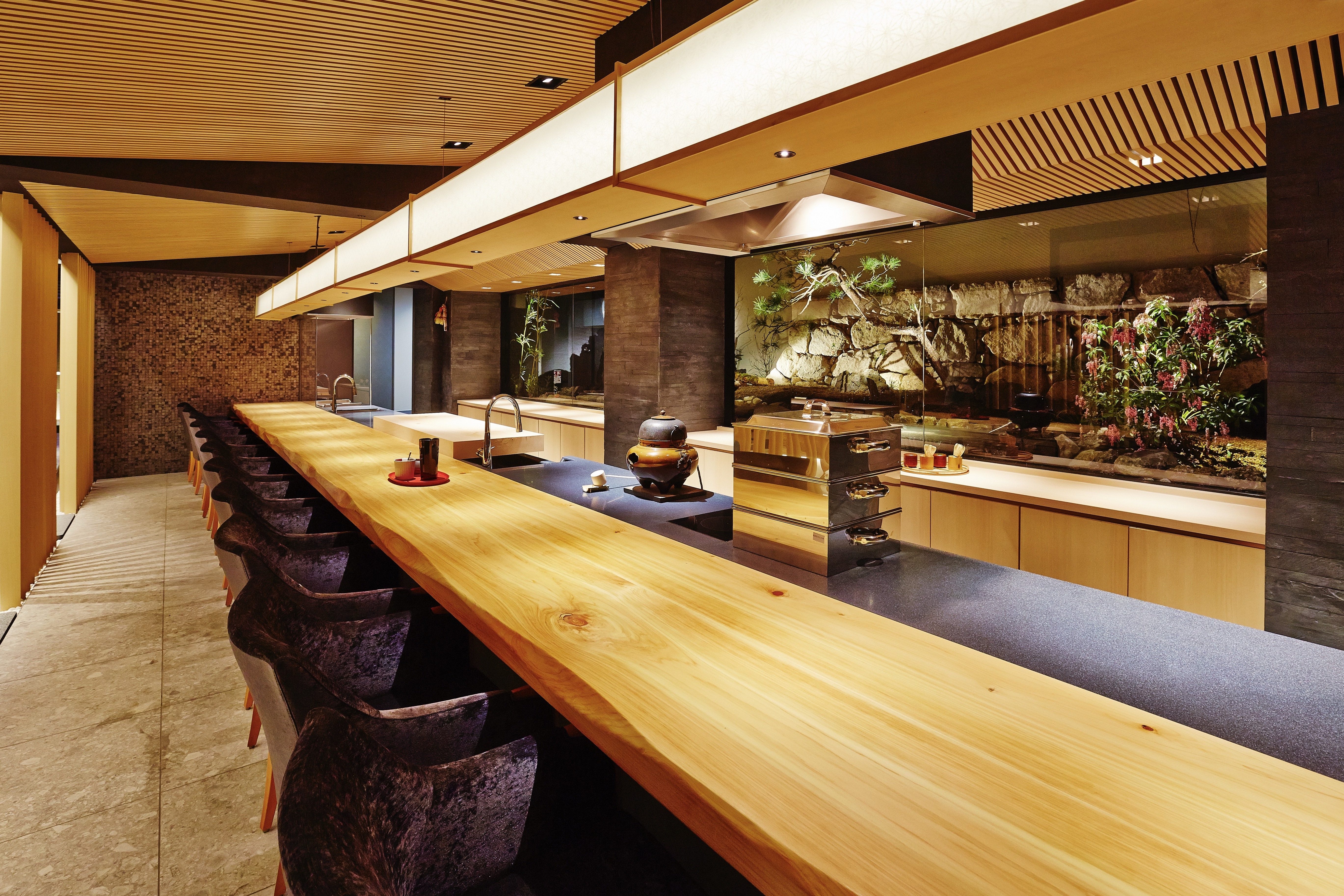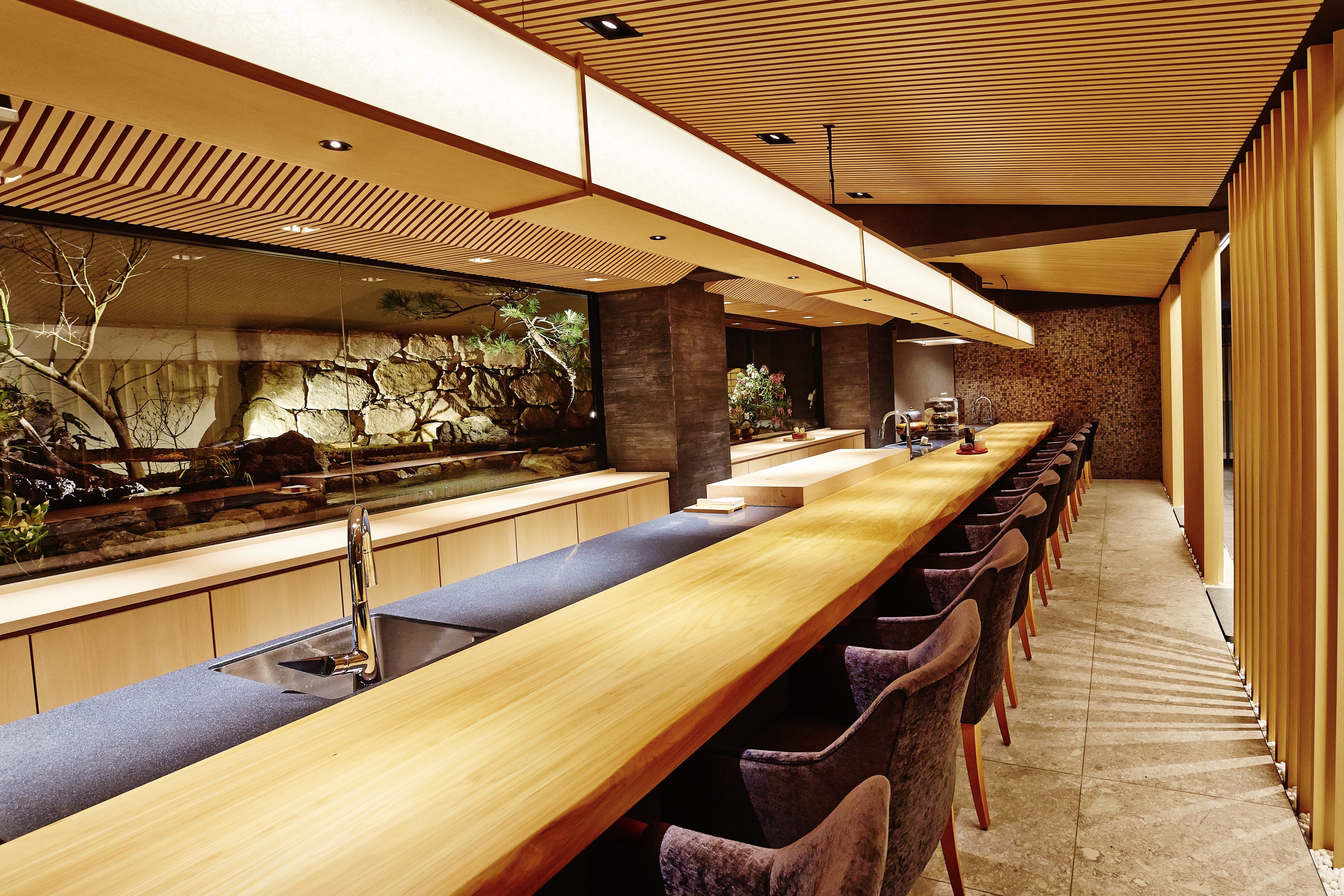 The place mainly consists of a Japanese garden, three guest areas (including counter height seats, semi-private rooms, and private rooms), a bar corner.