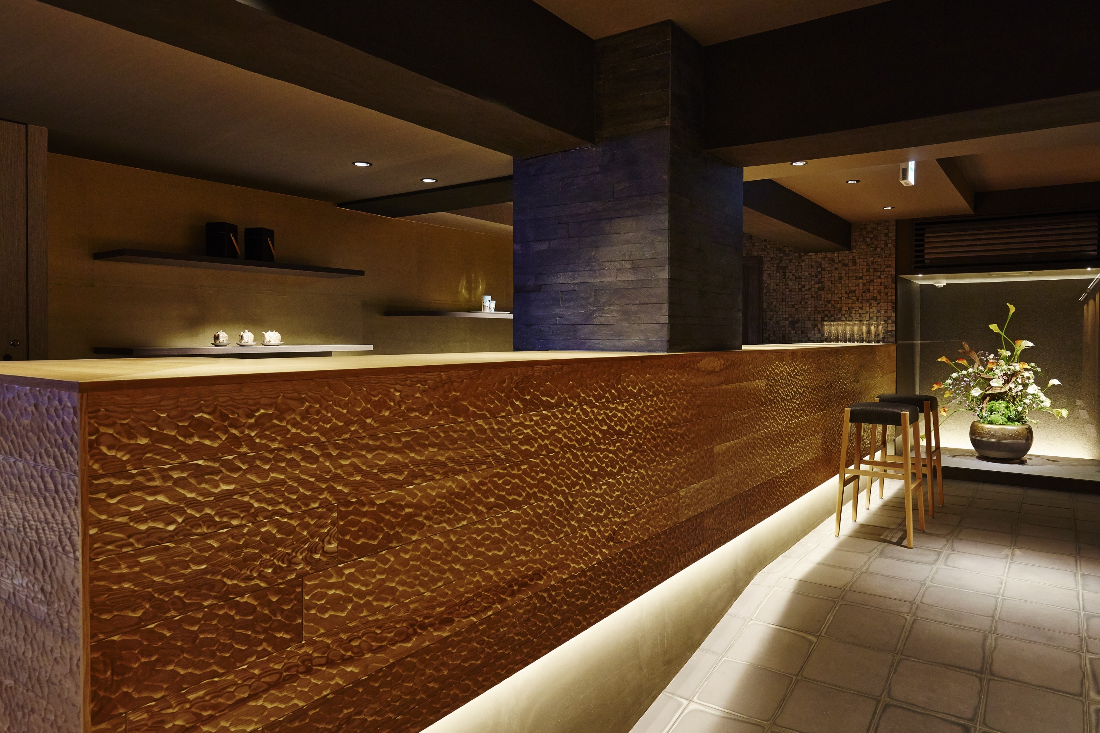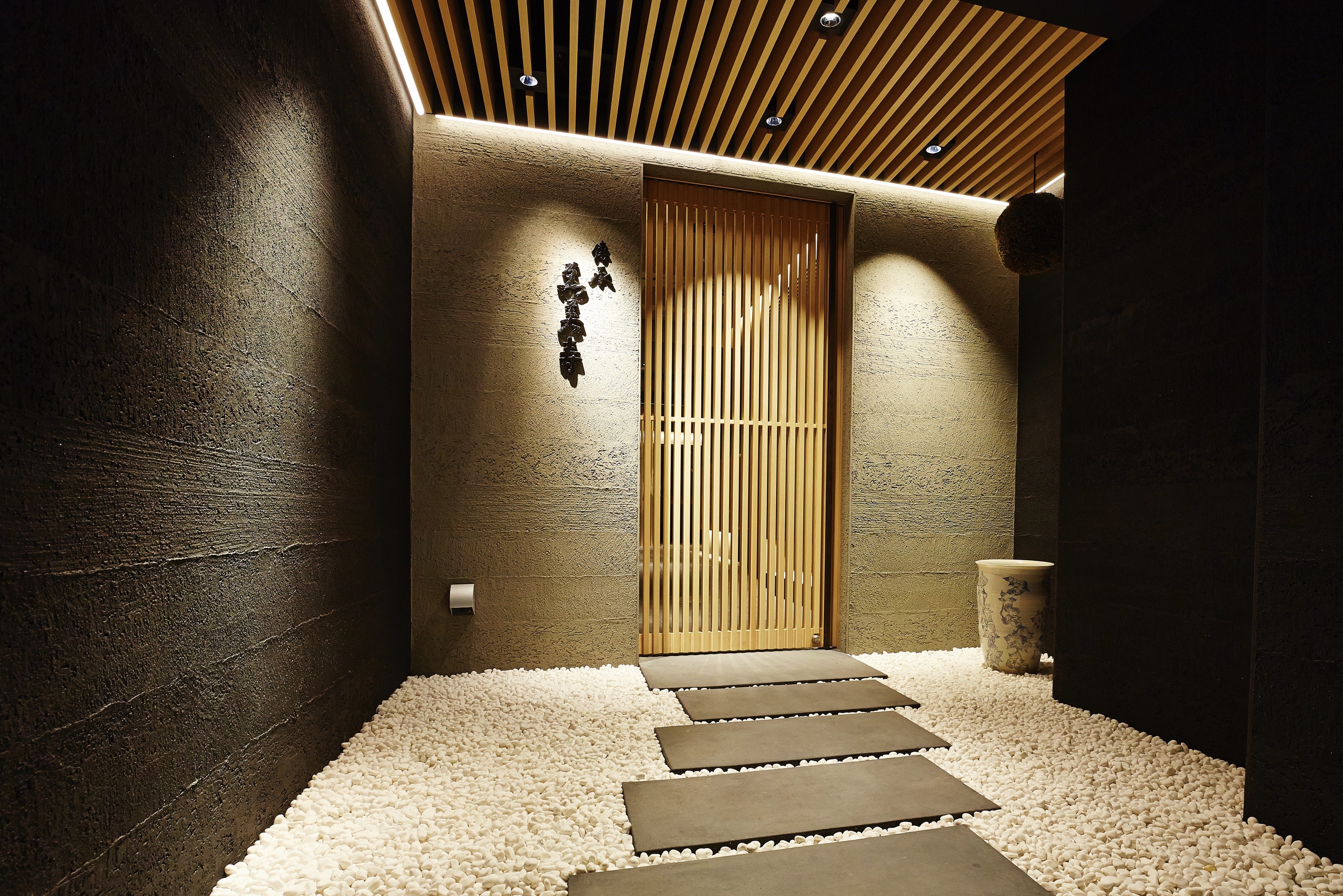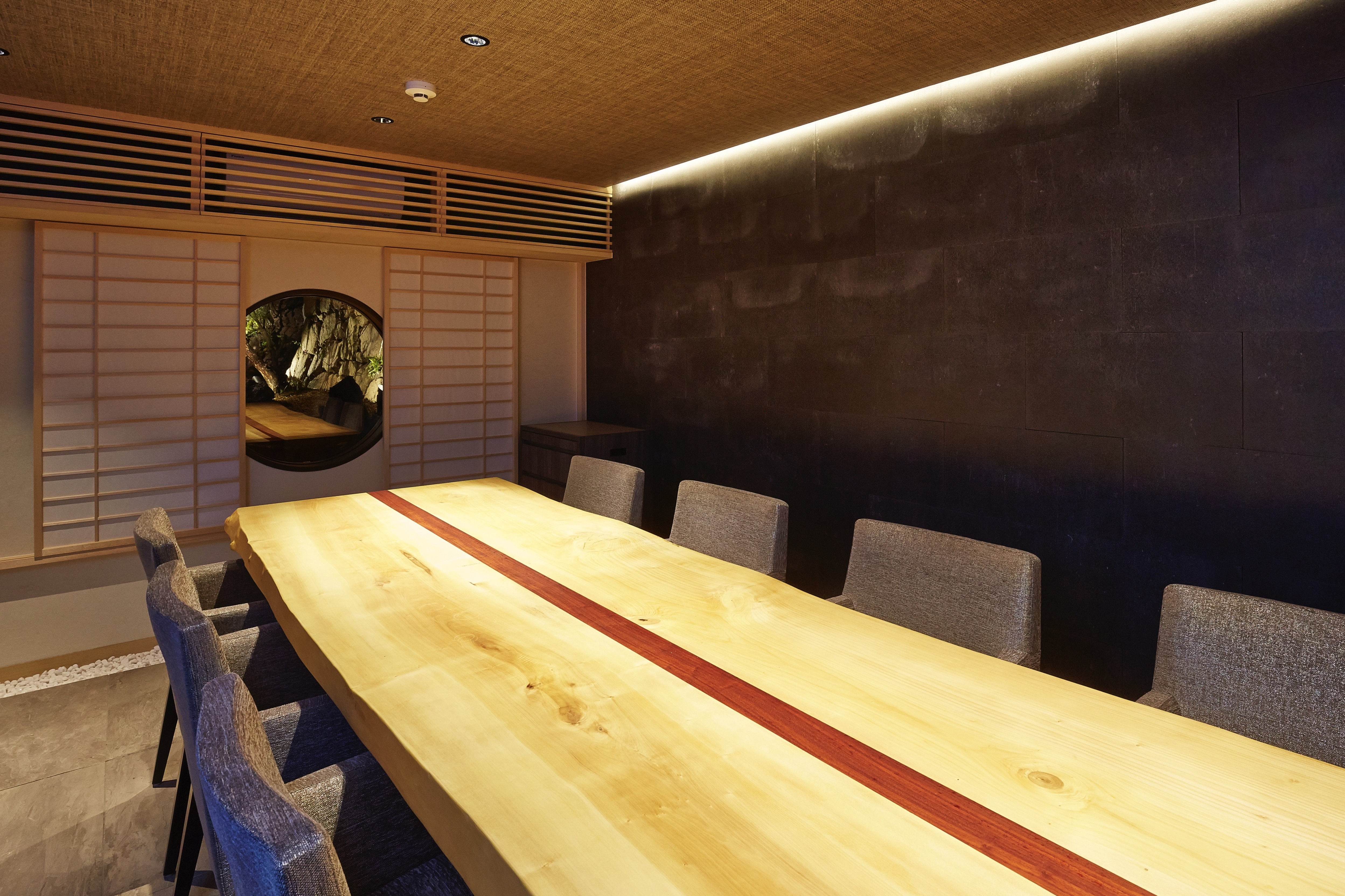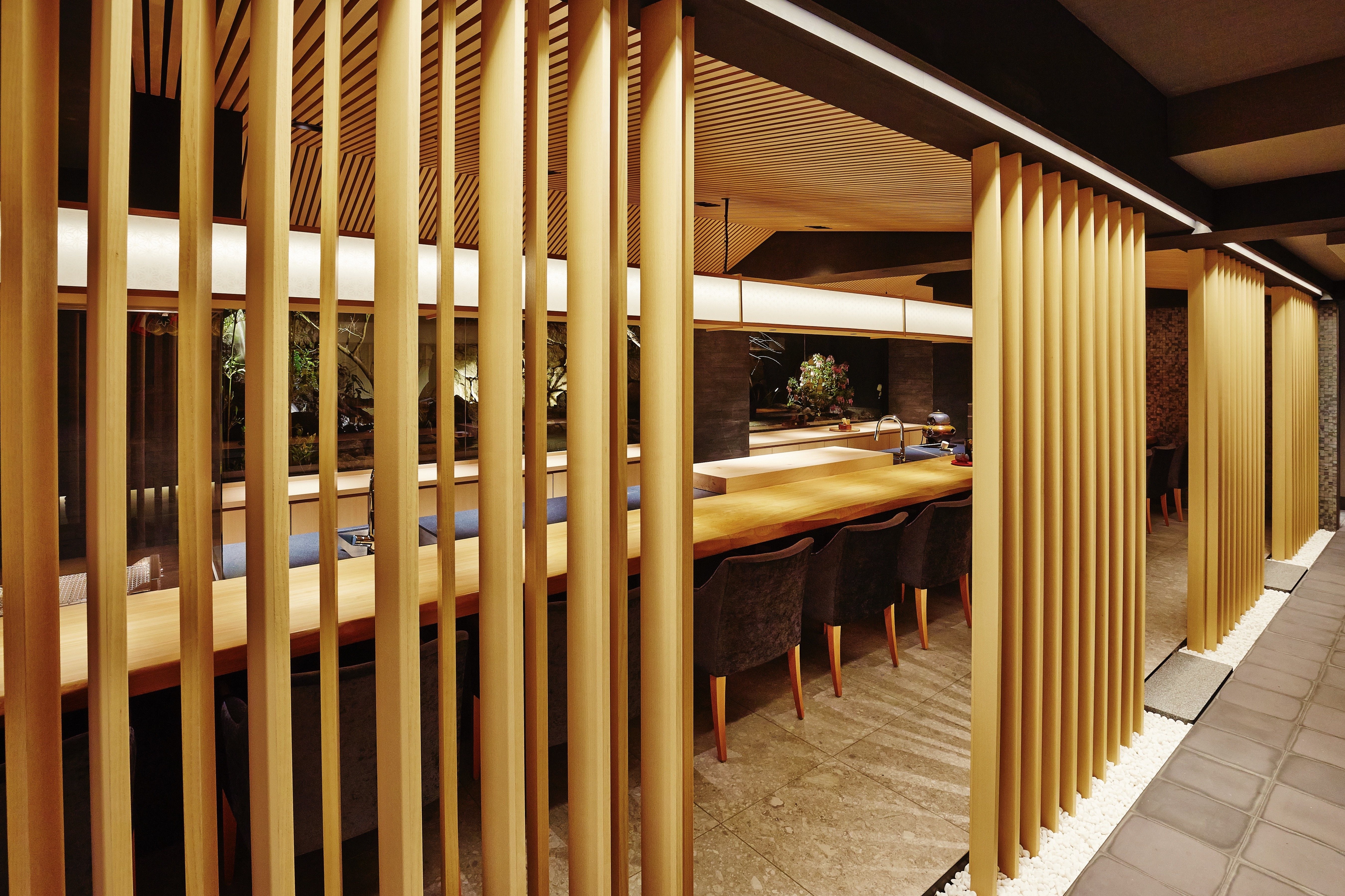 The place mainly consists of a Japanese garden, three guest areas (including counter height seats, semi-private rooms, and private rooms), a bar corner.
