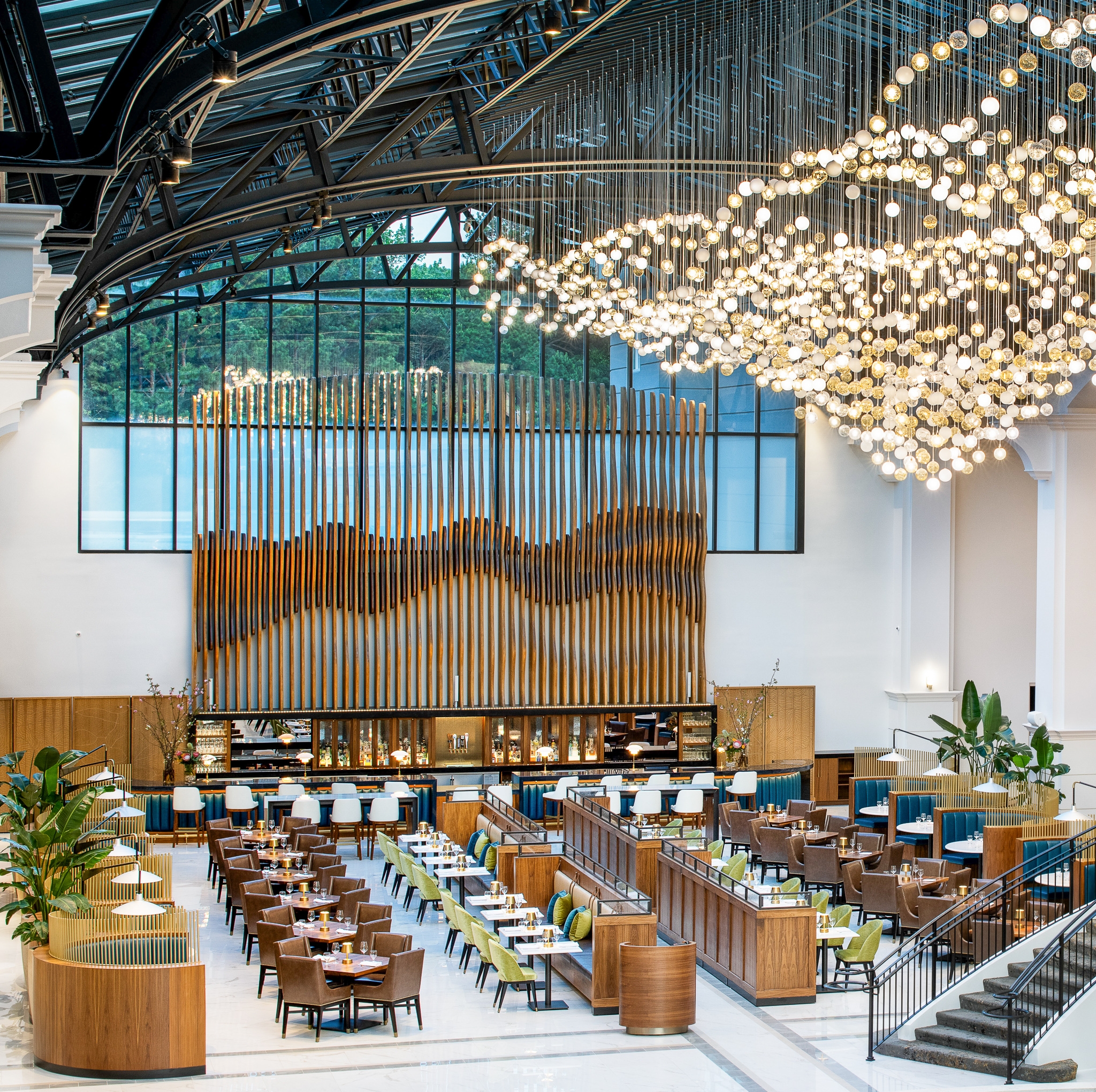 The hotel restaurant is the main anchor of the atrium, with a 45-foot wood sculpture by a local artist, rising above the newly introduced hotel bar. The sculpture is an abstract interpretation of the area: the rolling foothills of the Appalachians. Banquettes, that appear to be built in, are actually movable to allow the space to be used for large events. The sports bar was rebranded and modelled after an old-world library and game room pulling the rich horse farm history of the area.