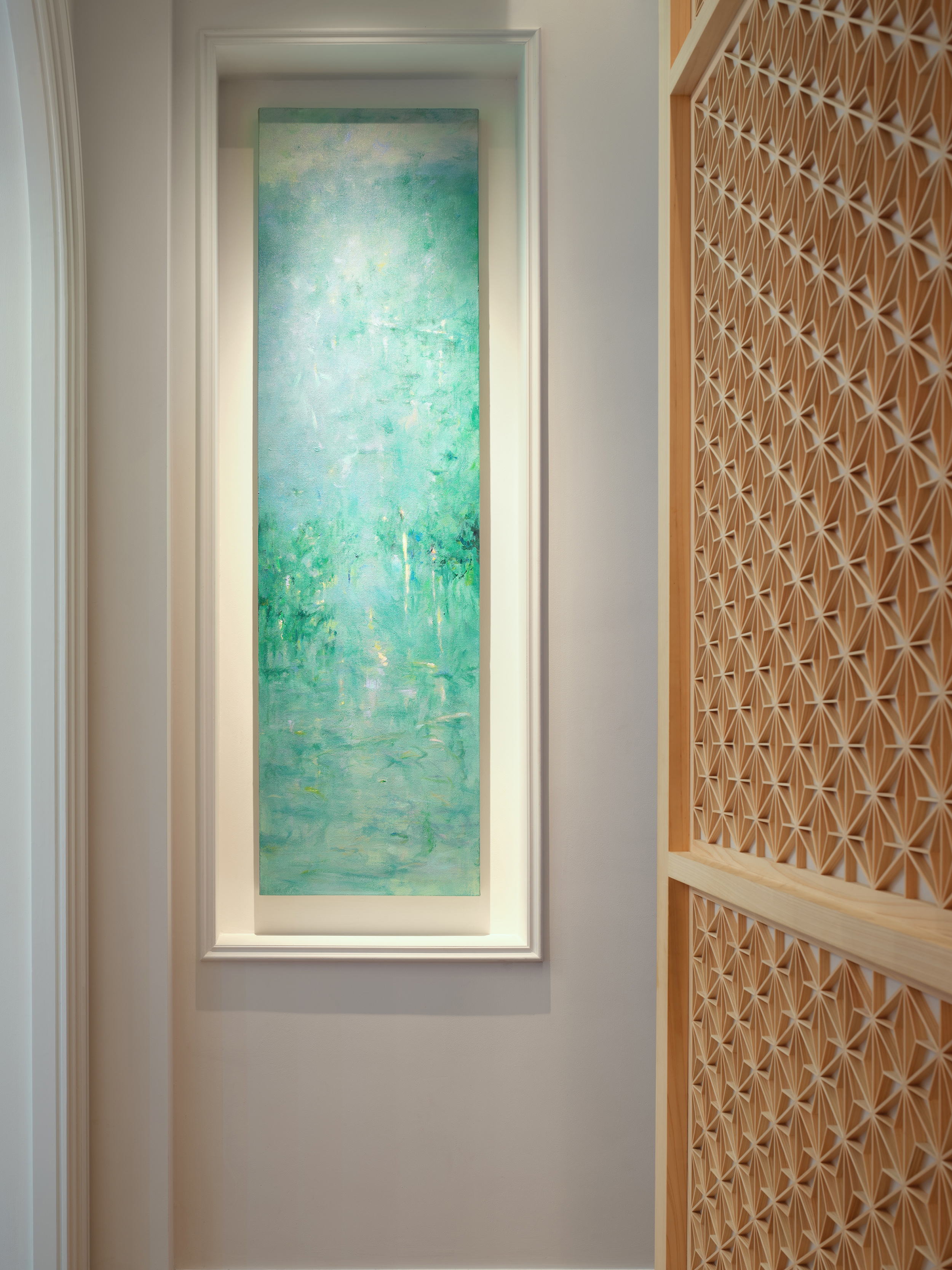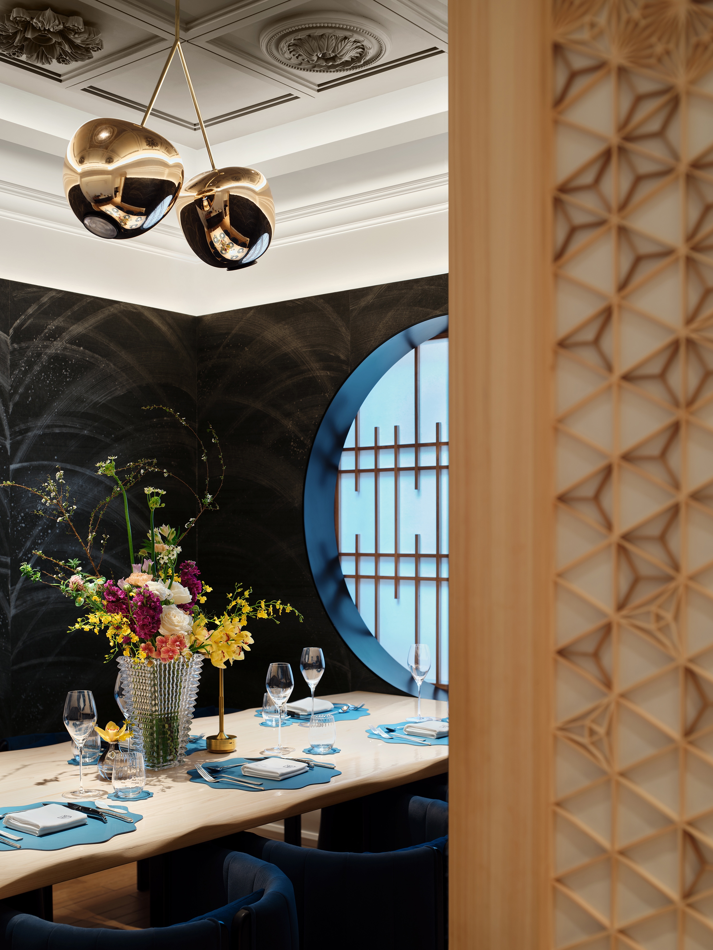 The interior doors and partial partitions are embellished with Senbom-koushi as an element, whose delicate artistic combination and veins are interwoven throughout the space, always giving people a touch and surprise.