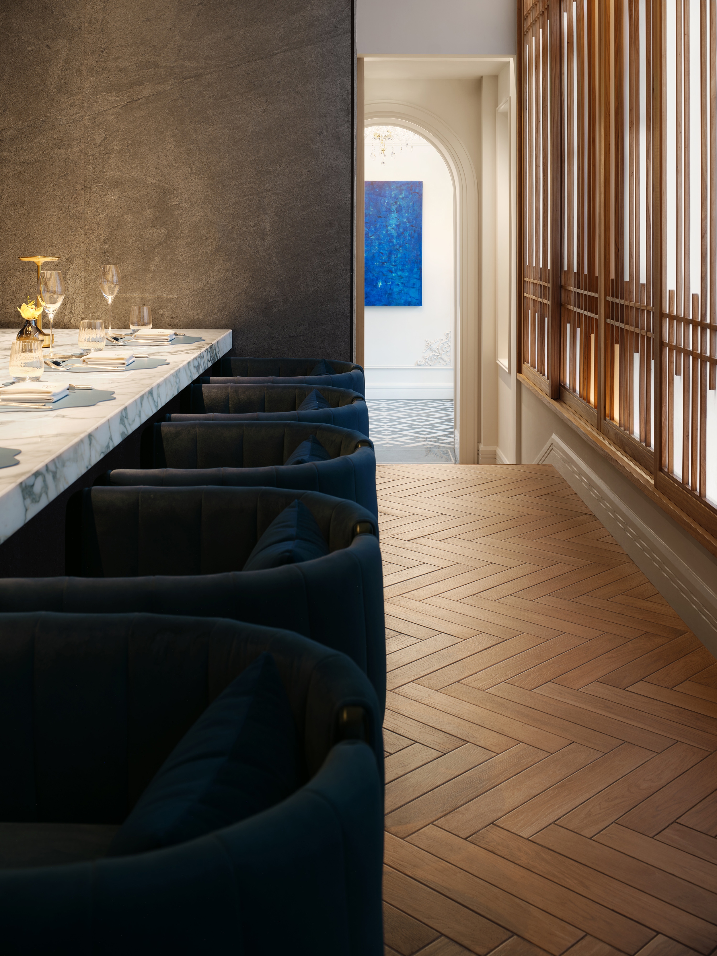 The front area of the board is high-end and warm, embellished with French carved lines, combined with wooden lattice window decorations and light films, meanwhile the selection of Bulgari stone on the tabletop, fully depicting the style of Shanghai, blending the essence of Eastern and Western culture.