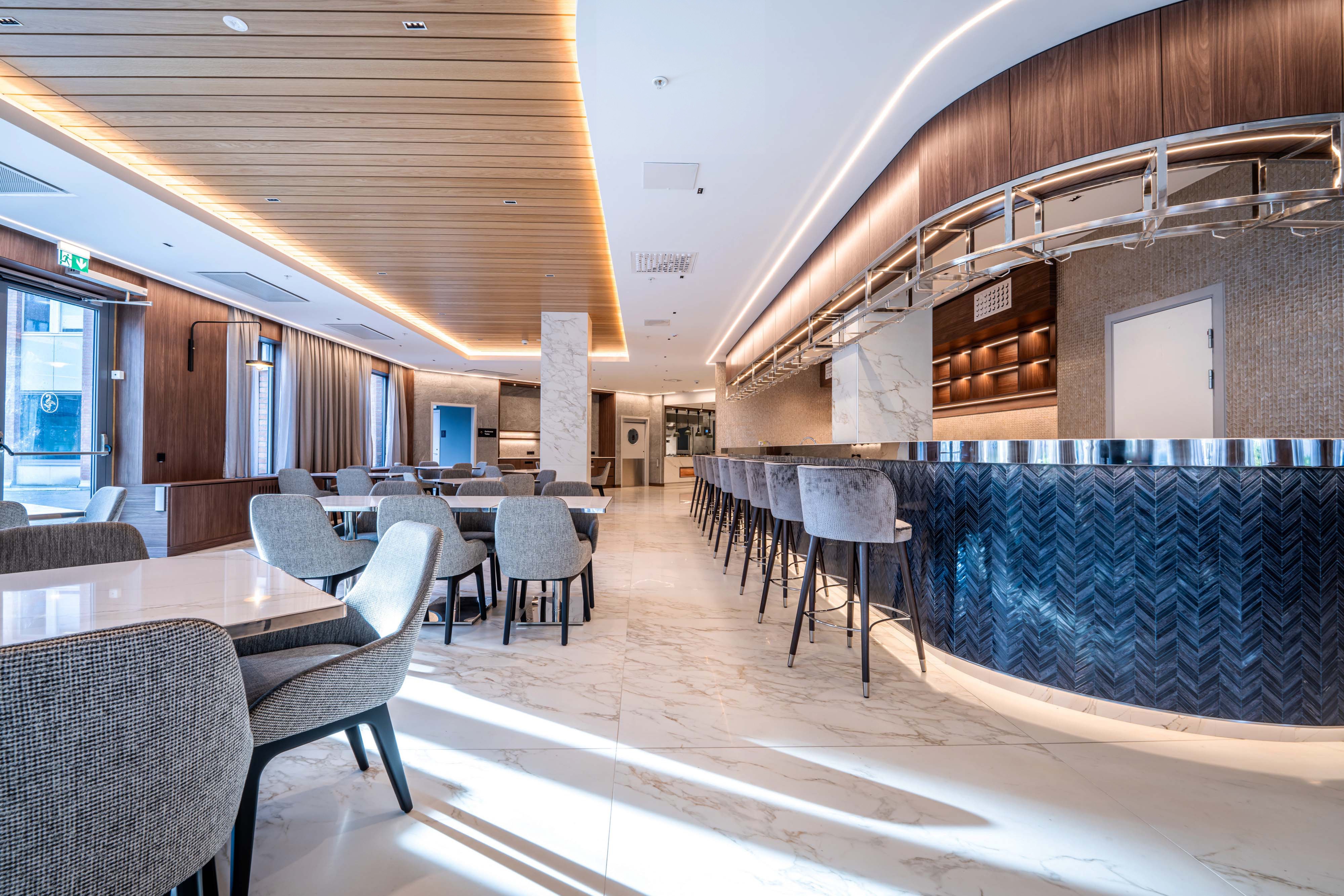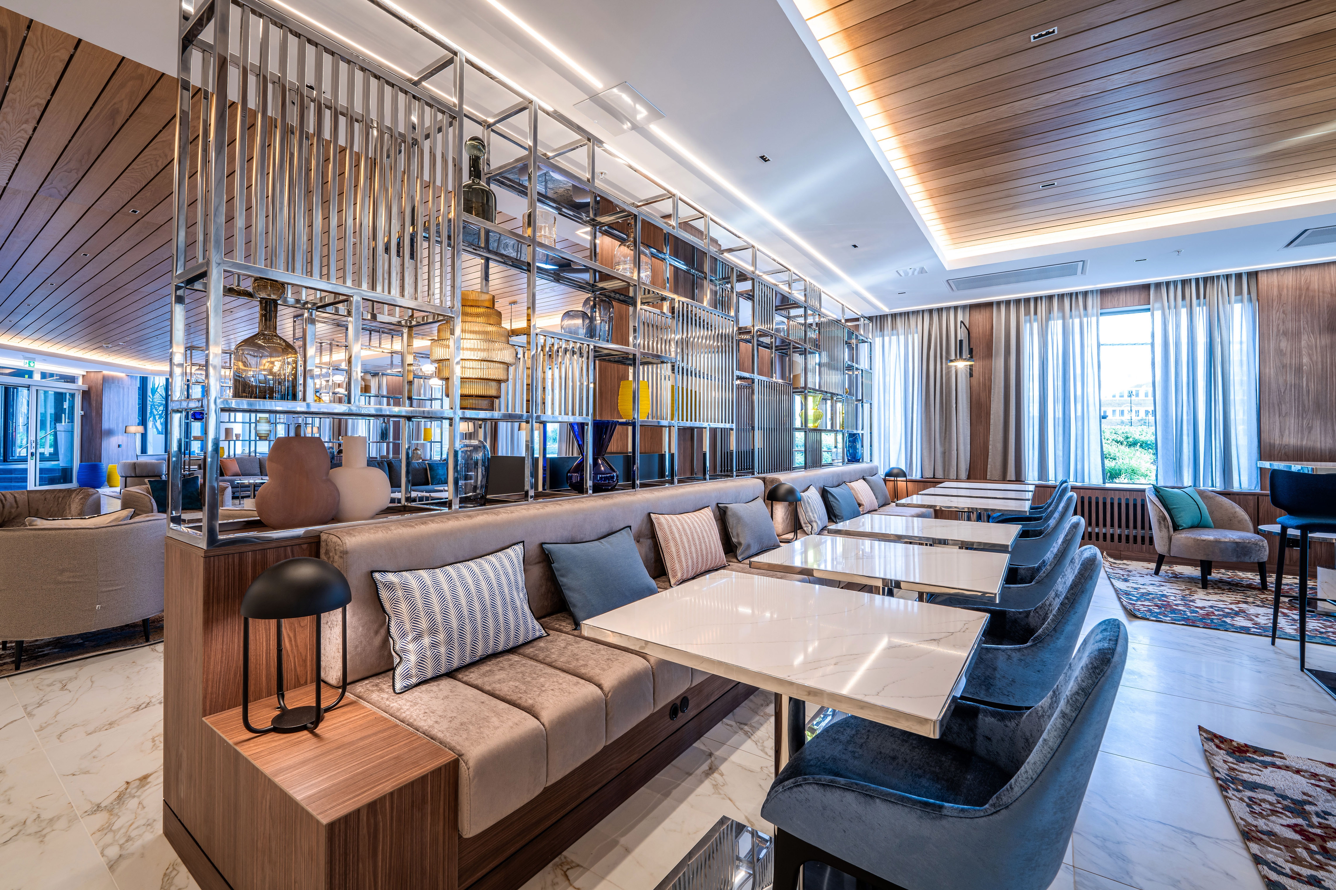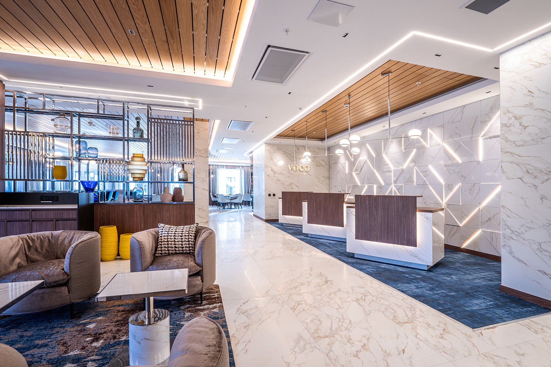 Crafted with a harmonious modern design principles, the hotel's interior features a palette of colors that evoke a professional ambiance, enriched by the signature Voco touch. The ambiance of the dining and lounge areas is a balance of sophistication and warmth, achieved through the use of wooden accents, stone, and curated libraries filled with artifacts that create a comforting, 'second home' atmosphere. The hotel's design philosophy is a reflection of today traveler's lifestyle, offering a versatile, open-plan layout that caters to both the need for personal space and for social interaction, all within a space that is adaptable and stylish. The strategic use of shelving as both a design and functional element subtly divides the area, maintaining an open feel.