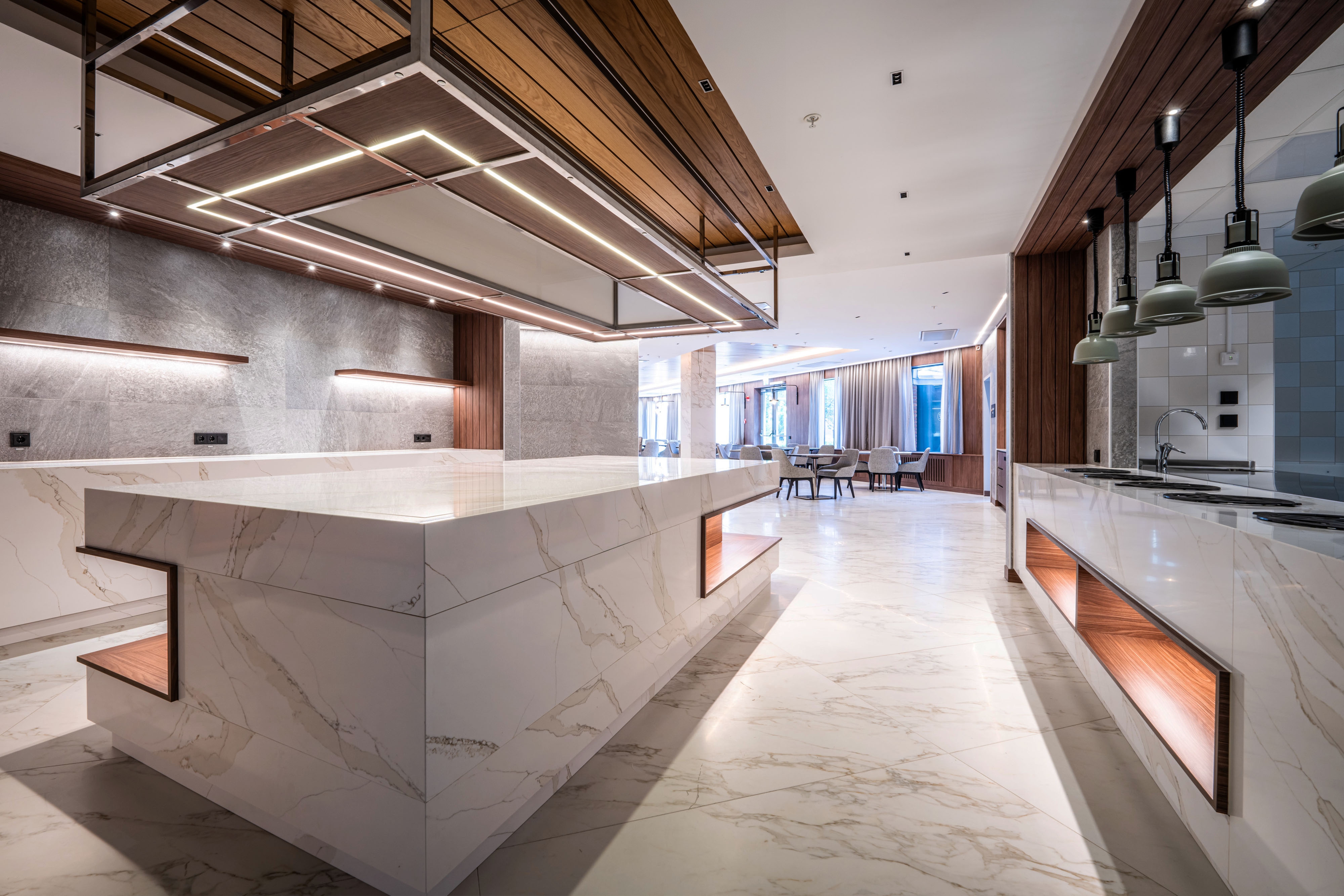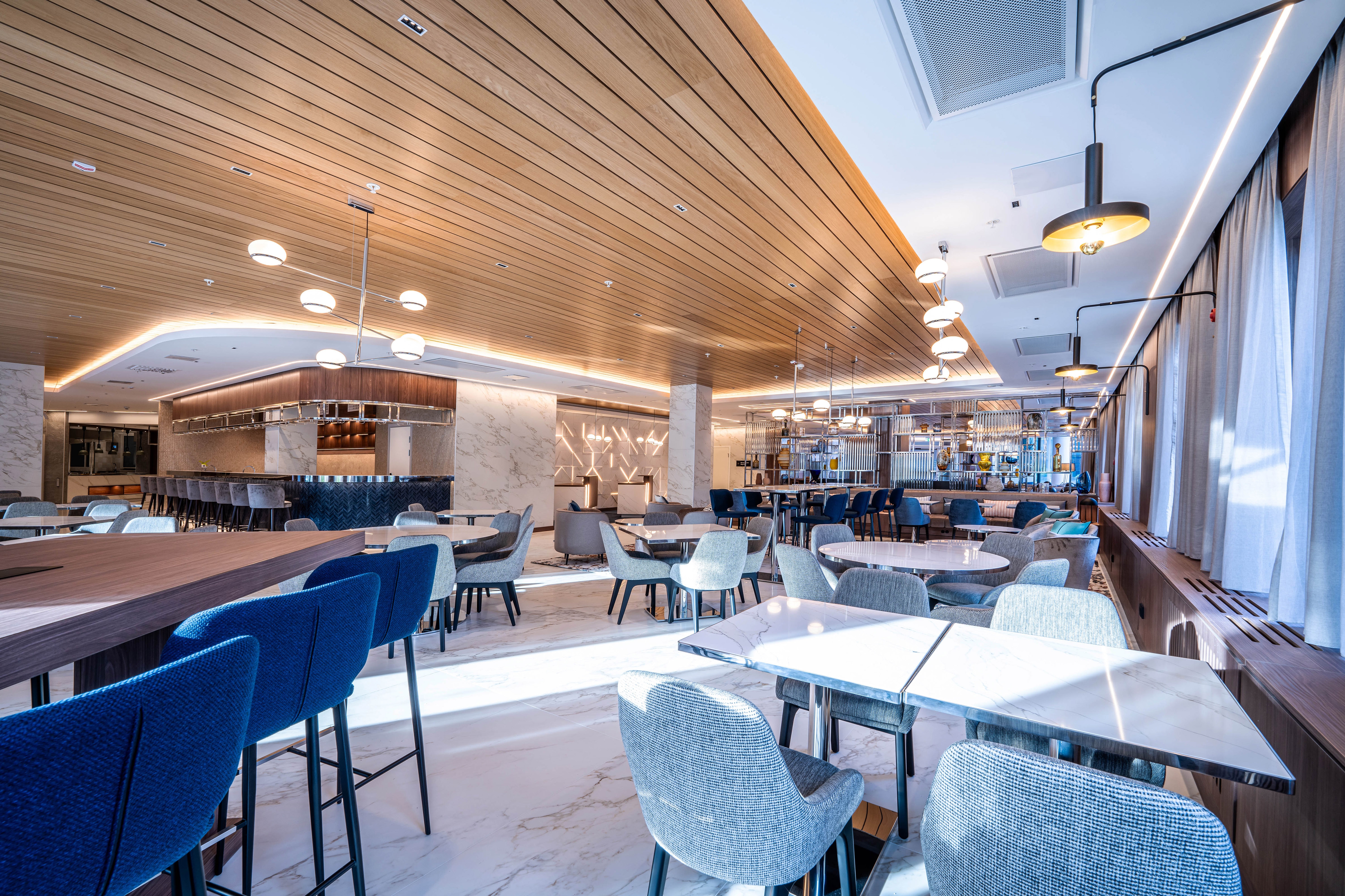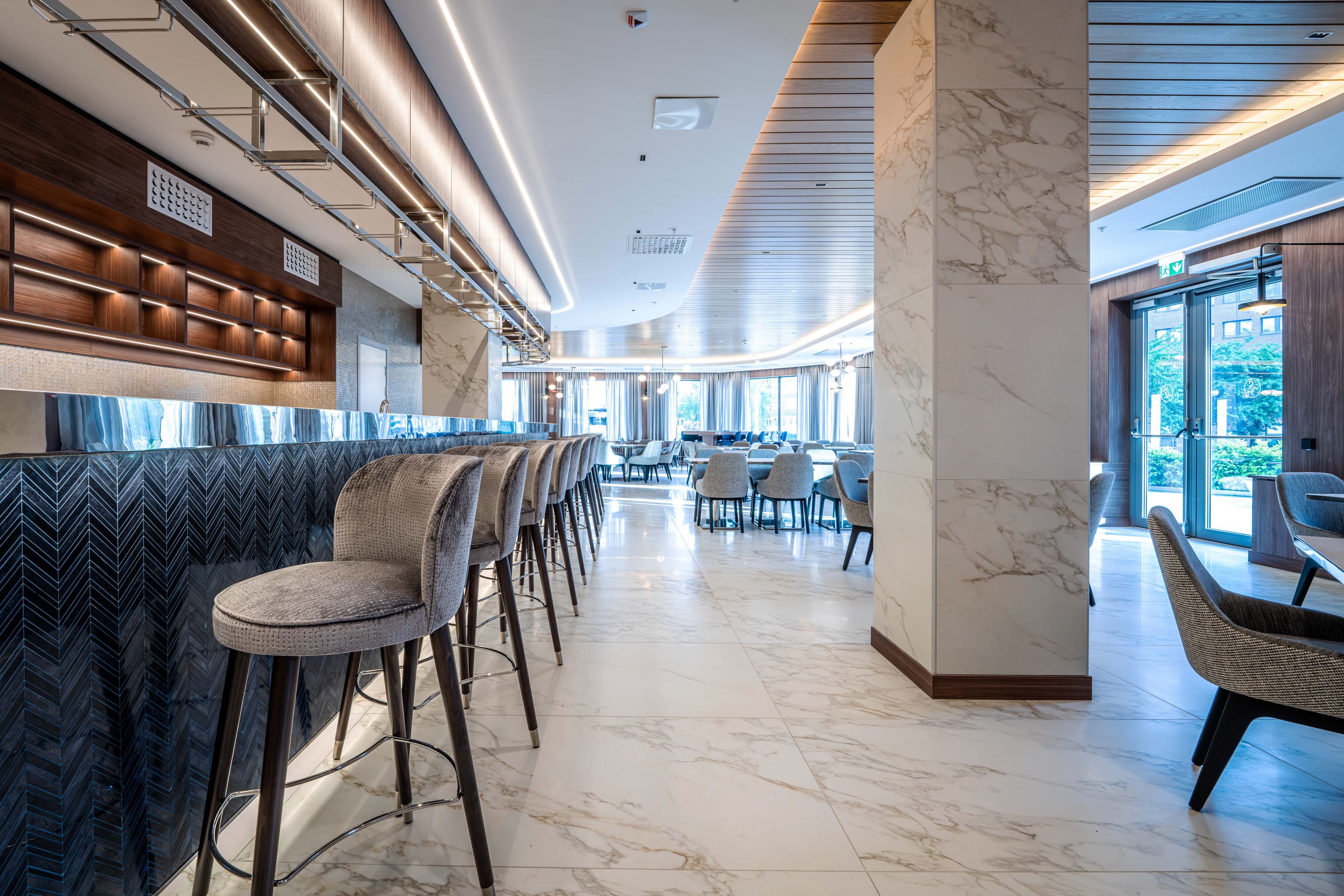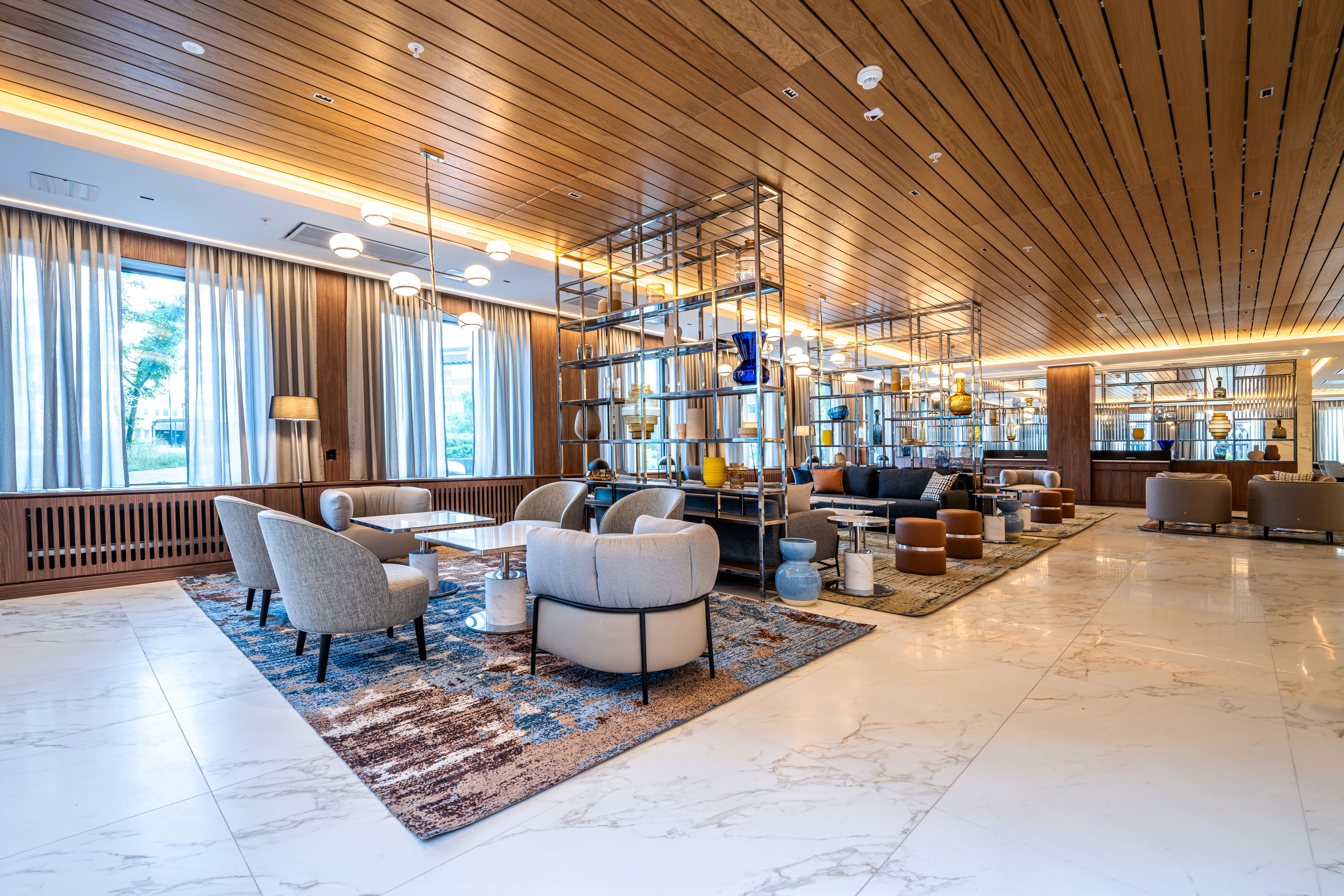 Crafted with a harmonious modern design principles, the hotel's interior features a palette of colors that evoke a professional ambiance, enriched by the signature Voco touch. The ambiance of the dining and lounge areas is a balance of sophistication and warmth, achieved through the use of wooden accents, stone, and curated libraries filled with artifacts that create a comforting, 'second home' atmosphere. The hotel's design philosophy is a reflection of today traveler's lifestyle, offering a versatile, open-plan layout that caters to both the need for personal space and for social interaction, all within a space that is adaptable and stylish. The strategic use of shelving as both a design and functional element subtly divides the area, maintaining an open feel.
