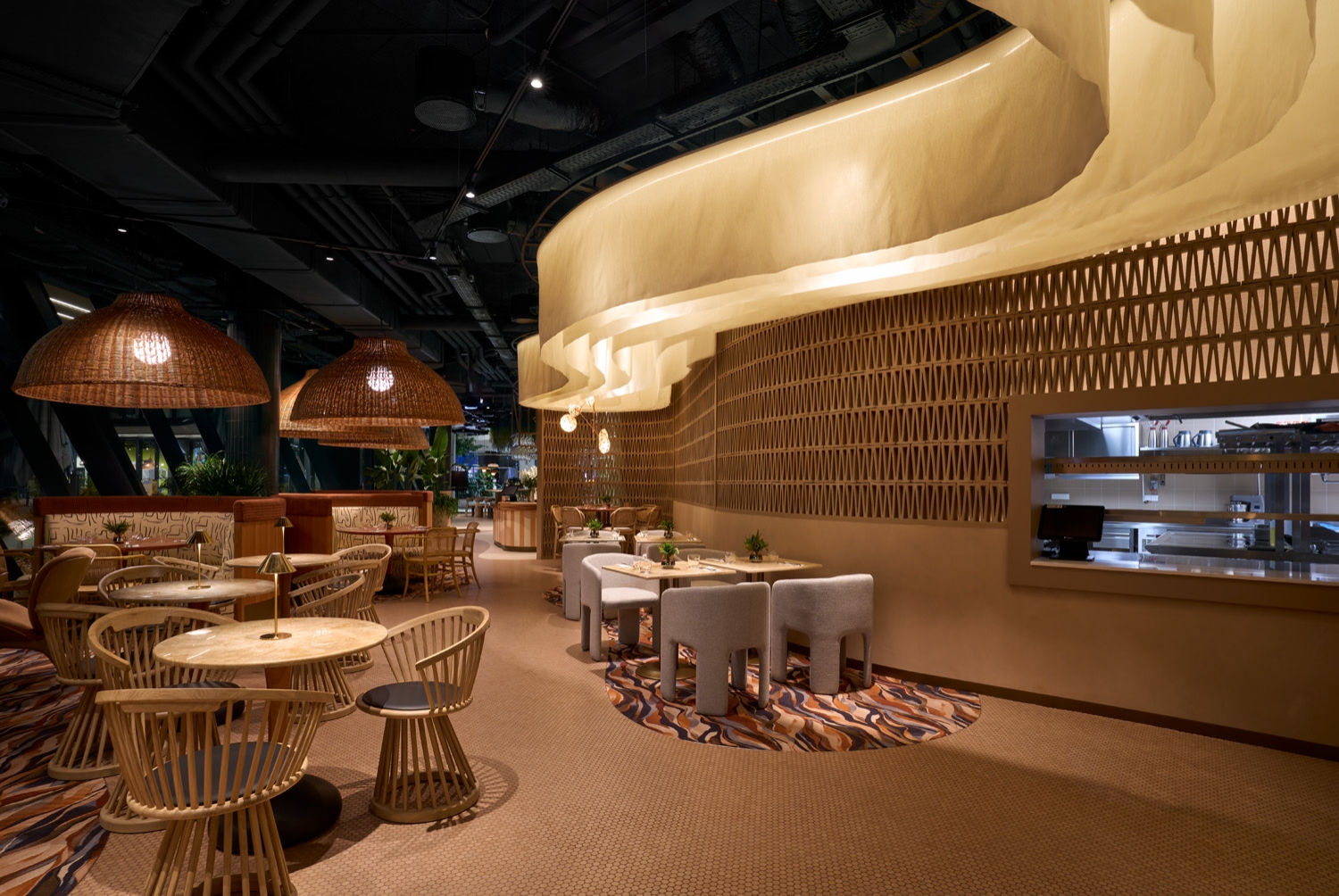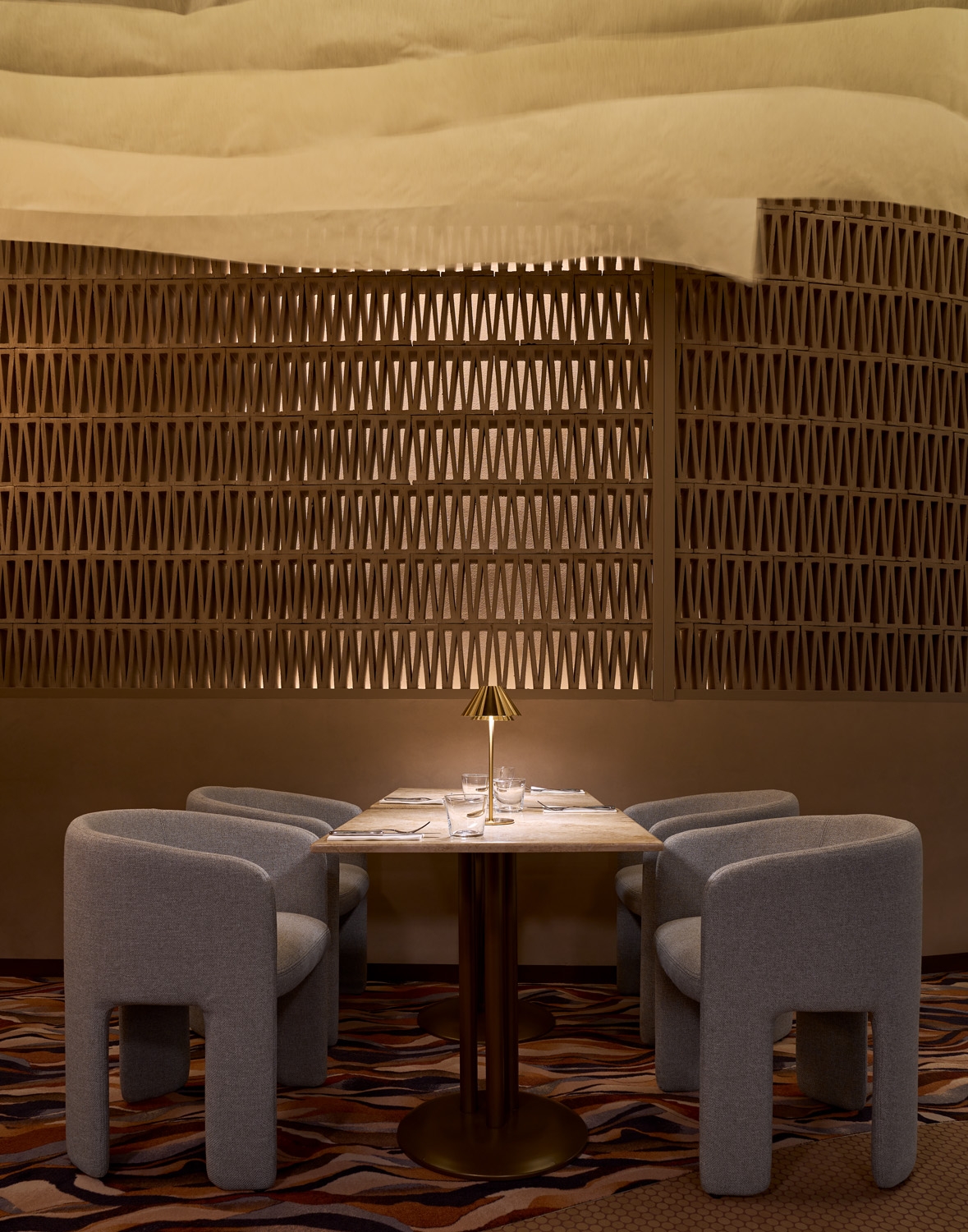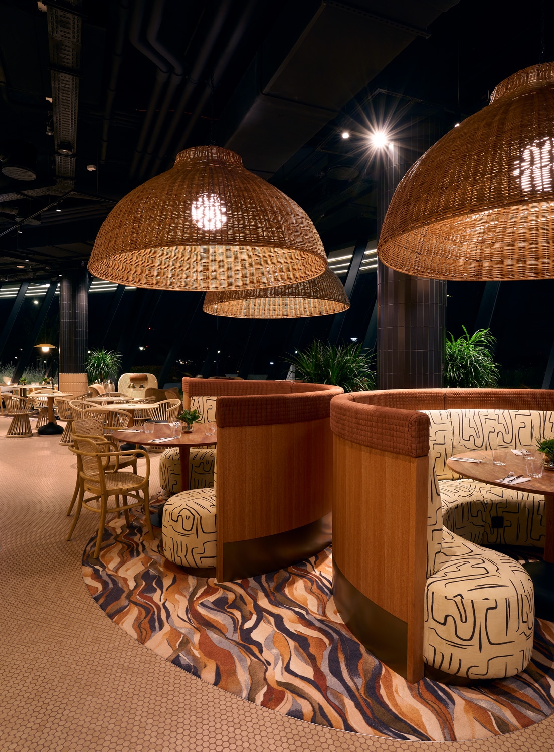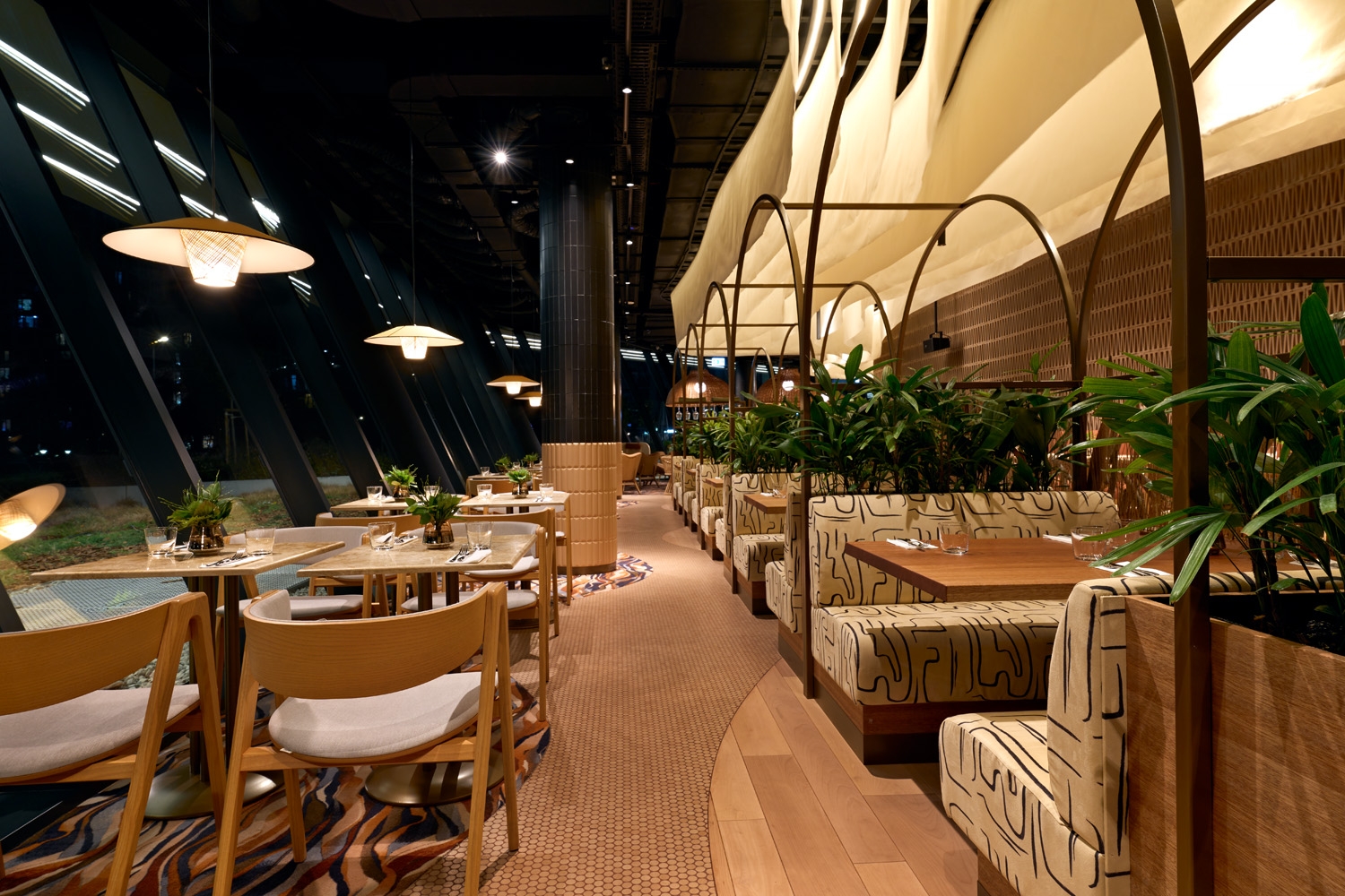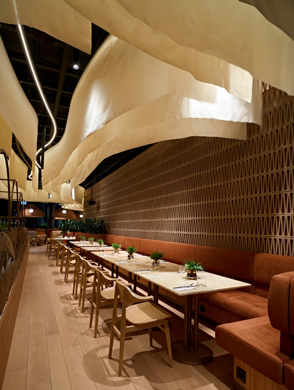 The interior design team was inspired by the experience of rowing on the Danube: the feeling when the river flows under you with a soothing slowness, you enter and exit the reeds and new, small worlds open up everywhere. They aimed to translate this into the language of design with a space that calms, shows comfort, yet invigorates, depending on the time of day you arrive. A decorative burnt brick wall, the textile design curtain floating from the ceiling above, the unique design of carpets and textiles of the restaurant era mix sophisticated contemporary solutions and a flow of nature.