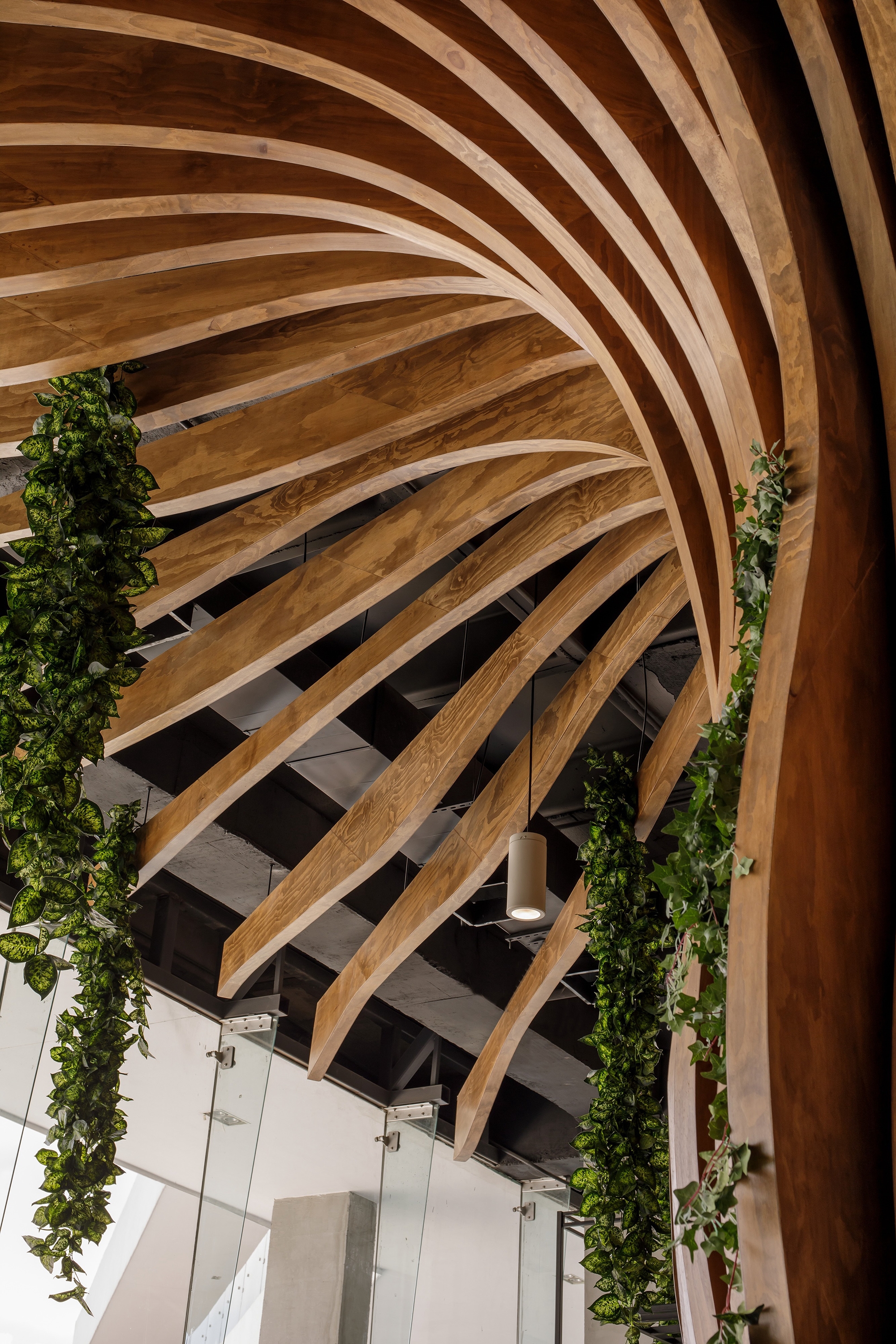 The concept is based on the idea of a tree, an oasis within the hectic neighborhood. The stereotomic weave of wood, starting from the trunk of this tree, is distributed throughout the space like branches, welcoming the users and forgetting that they are inside a corporate building.