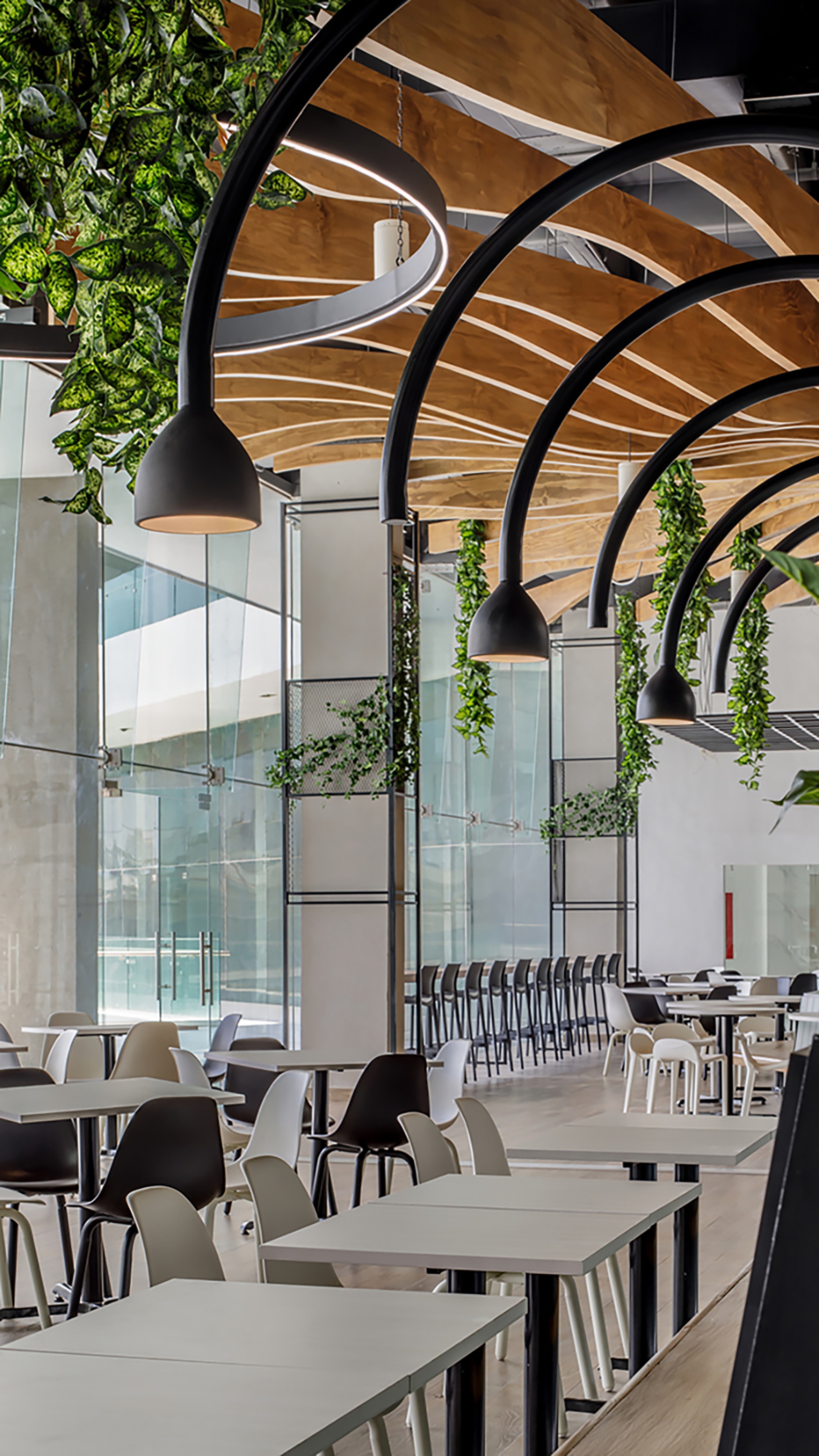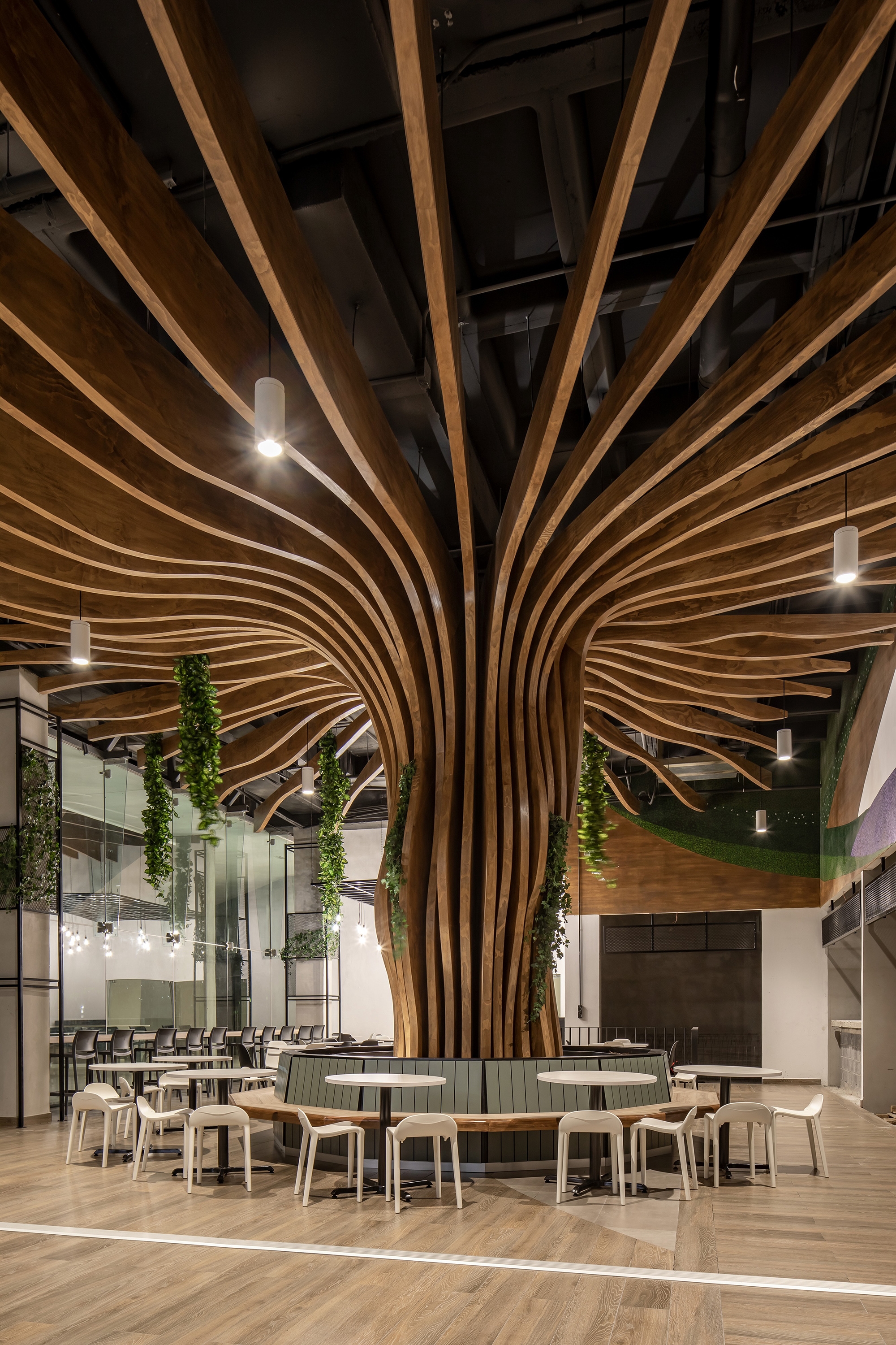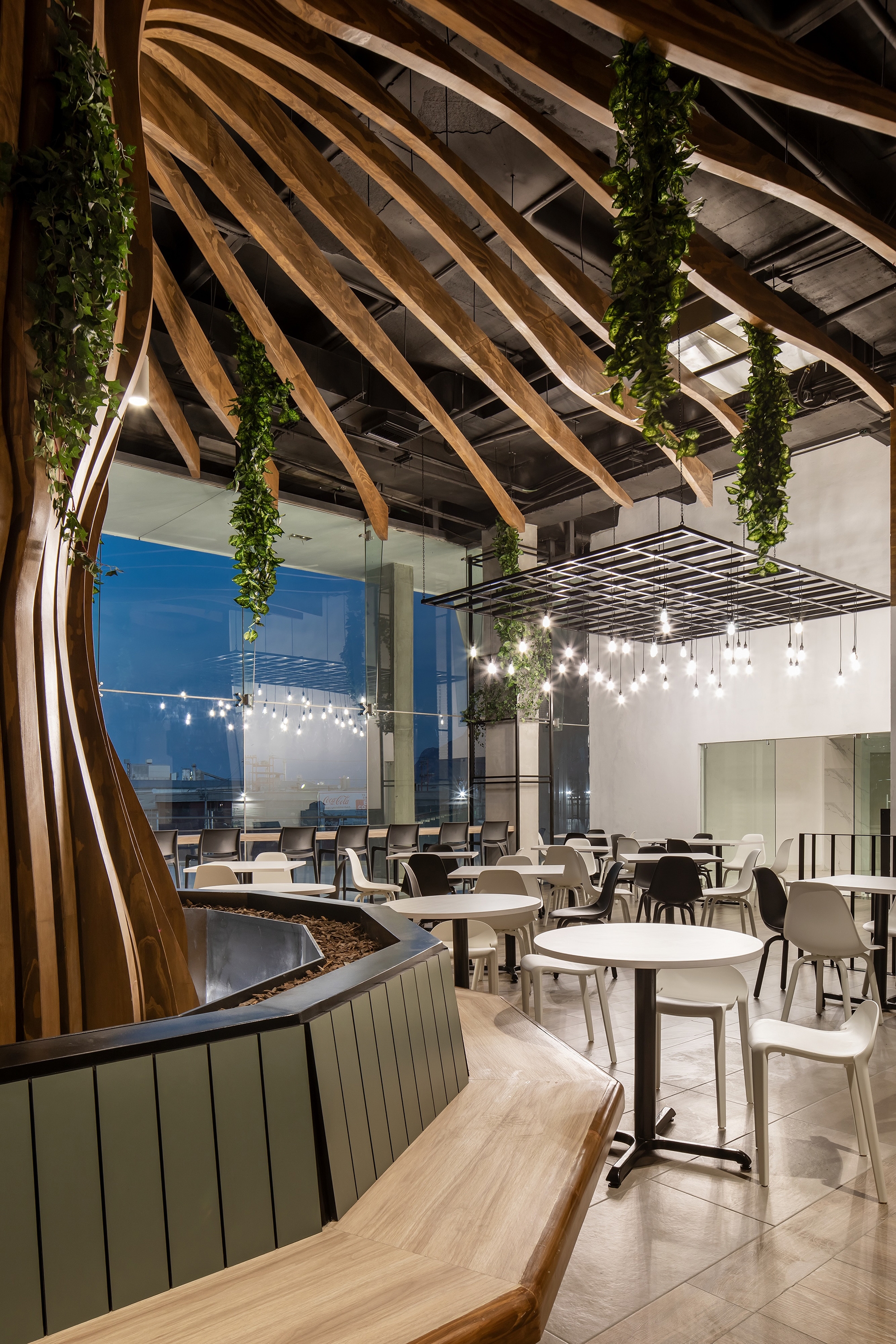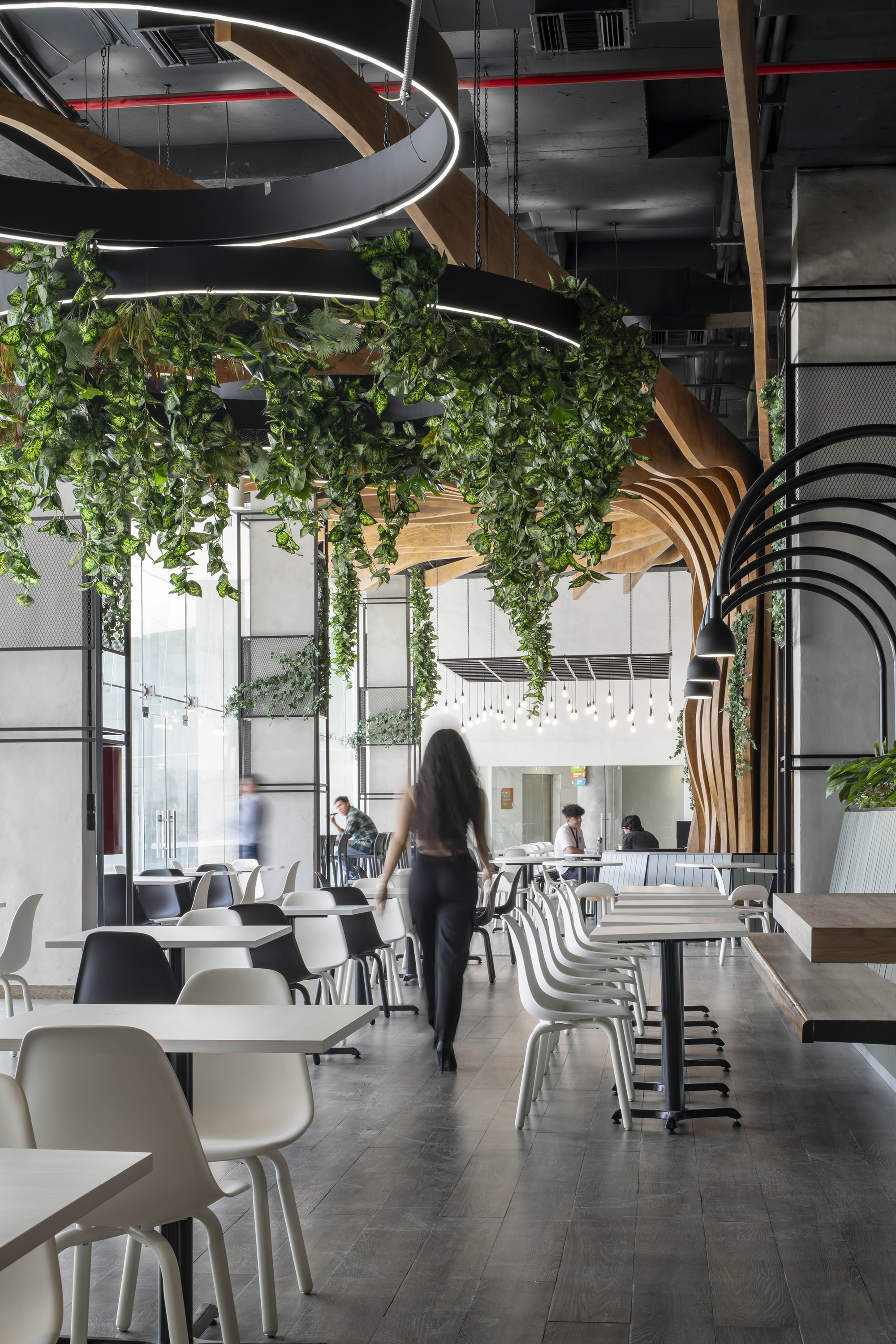 The lighting design complements and softens the design of the tree, both on the ceilings, with circles that also support natural vegetation, as well as those that are born from planters and fall with a half circle on the tables, generating a biophilic space.