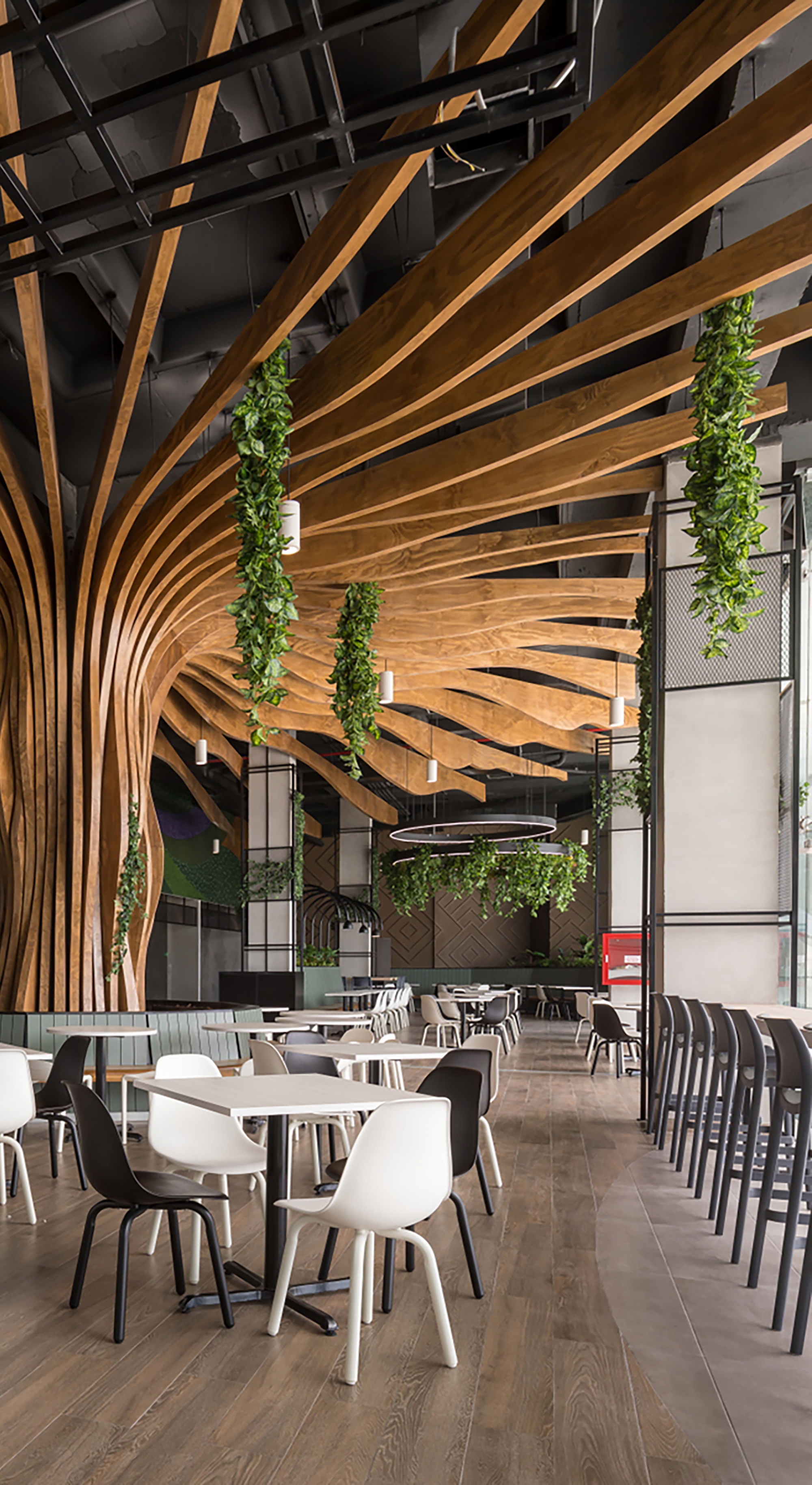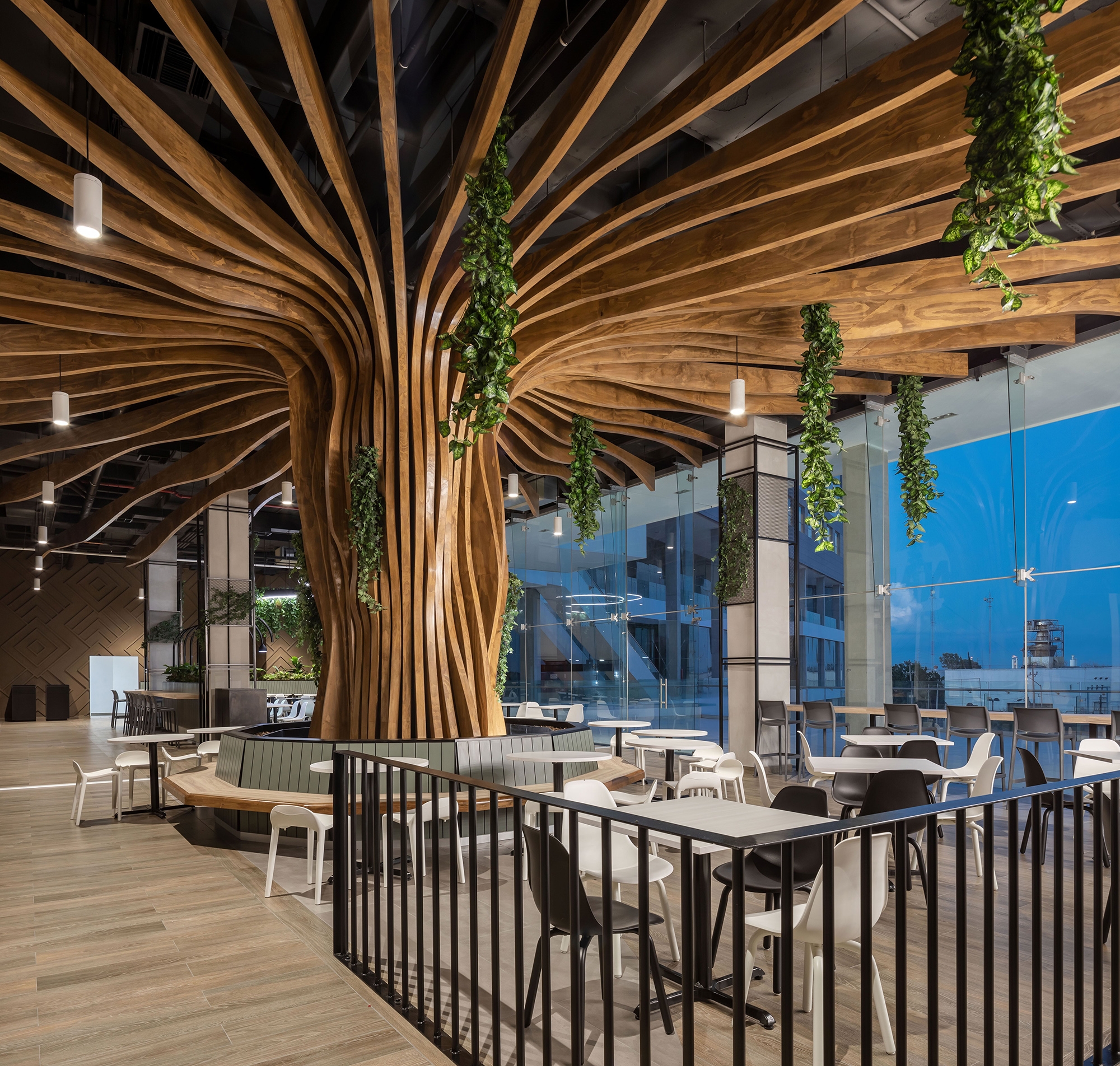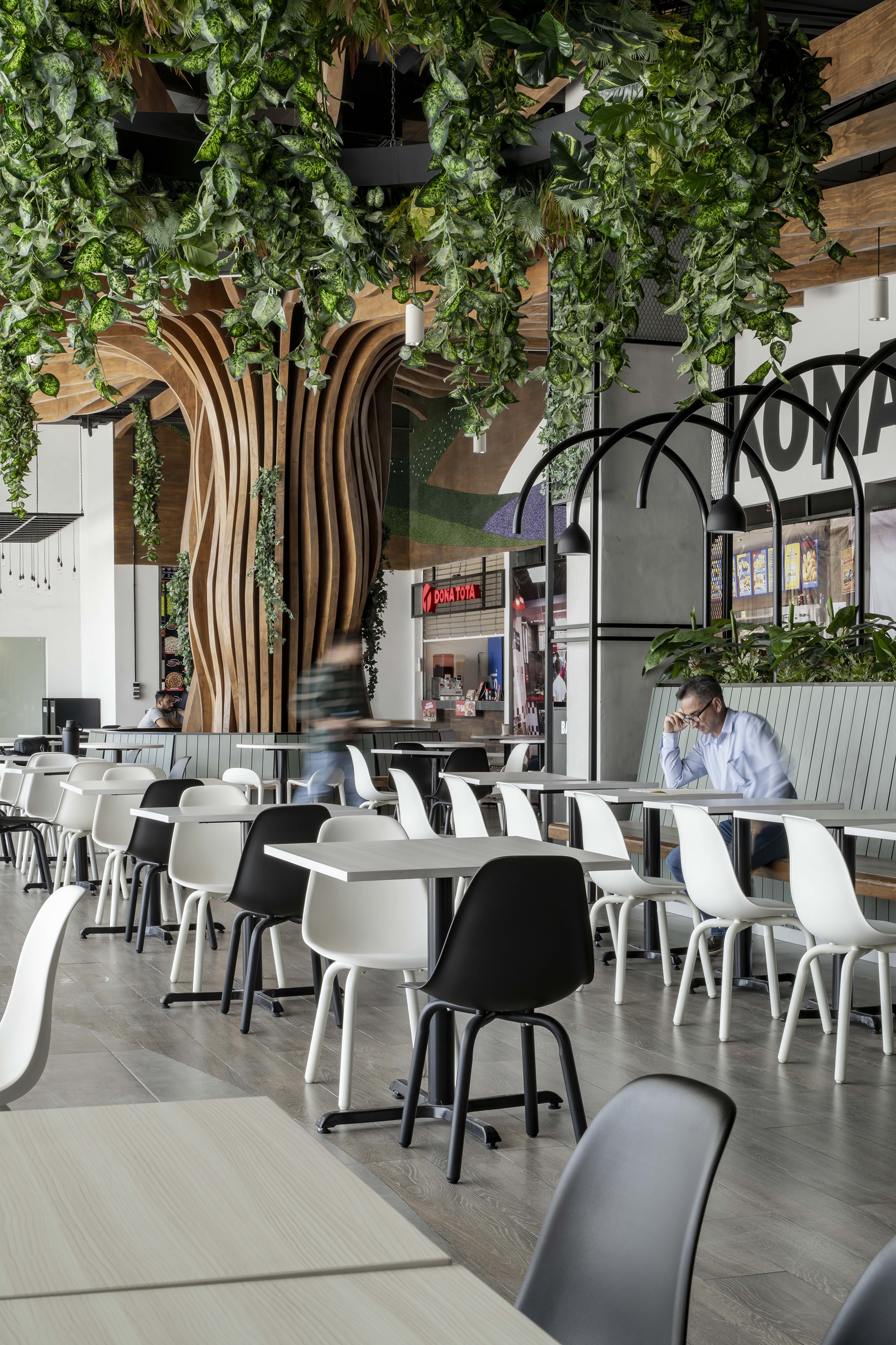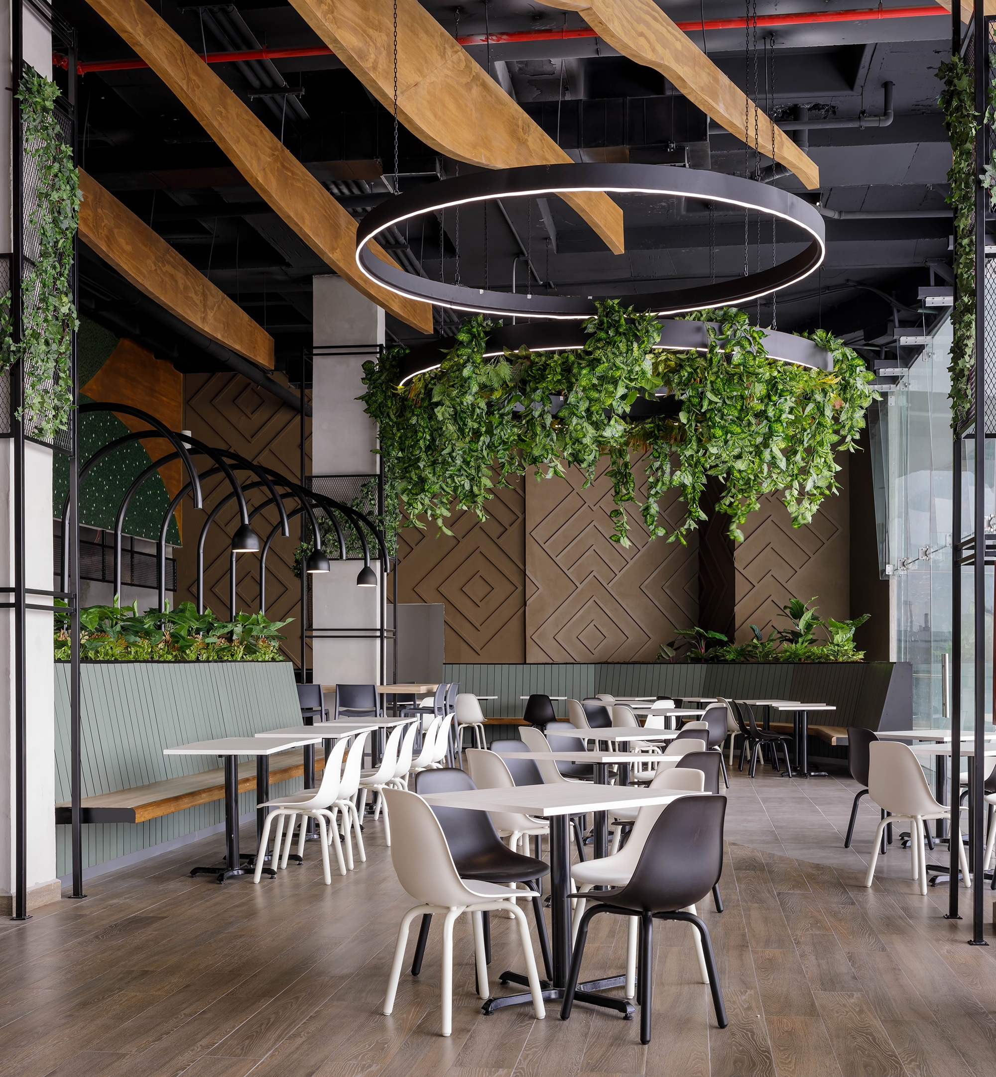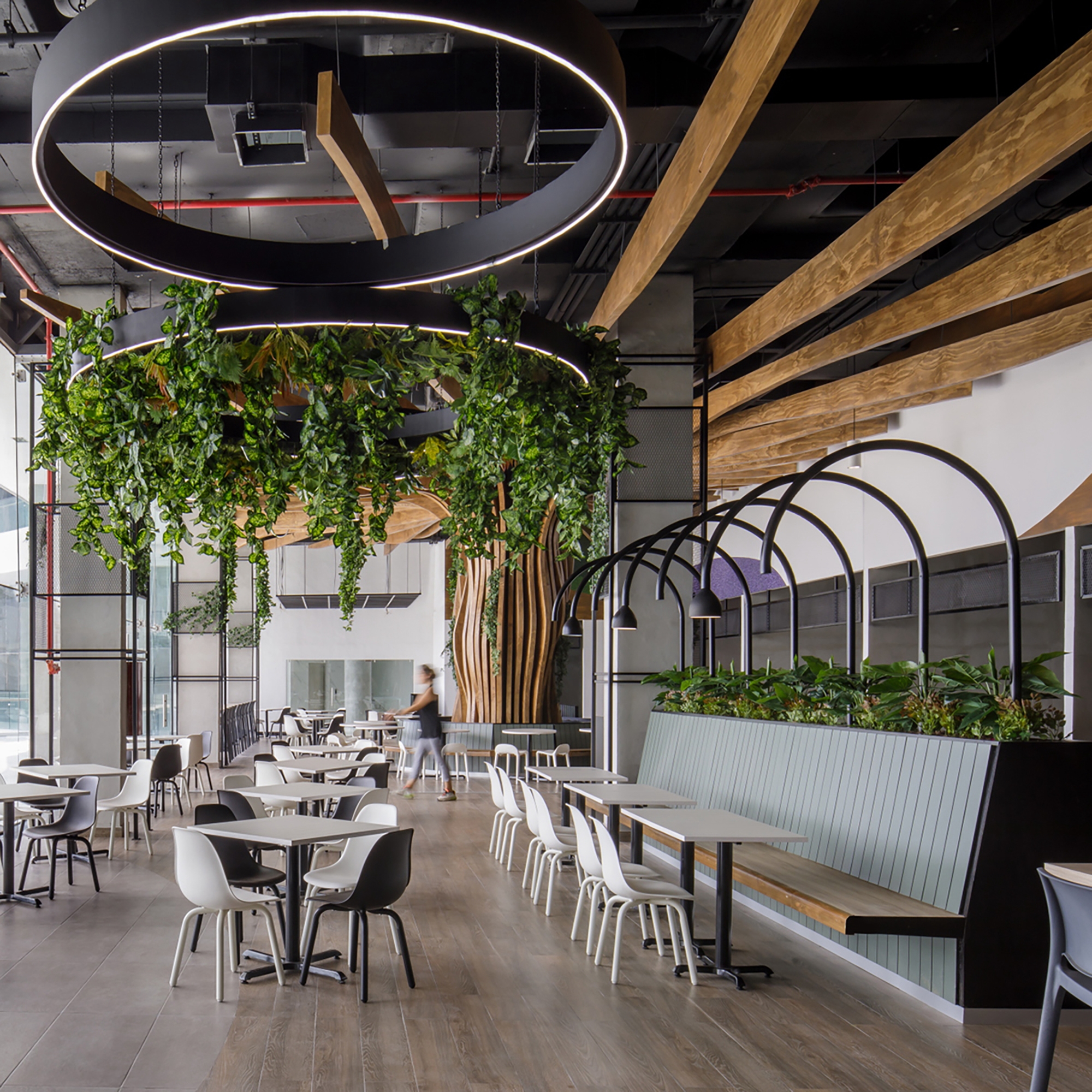 The lighting design complements and softens the design of the tree, both on the ceilings, with circles that also support natural vegetation, as well as those that are born from planters and fall with a half circle on the tables, generating a biophilic space.