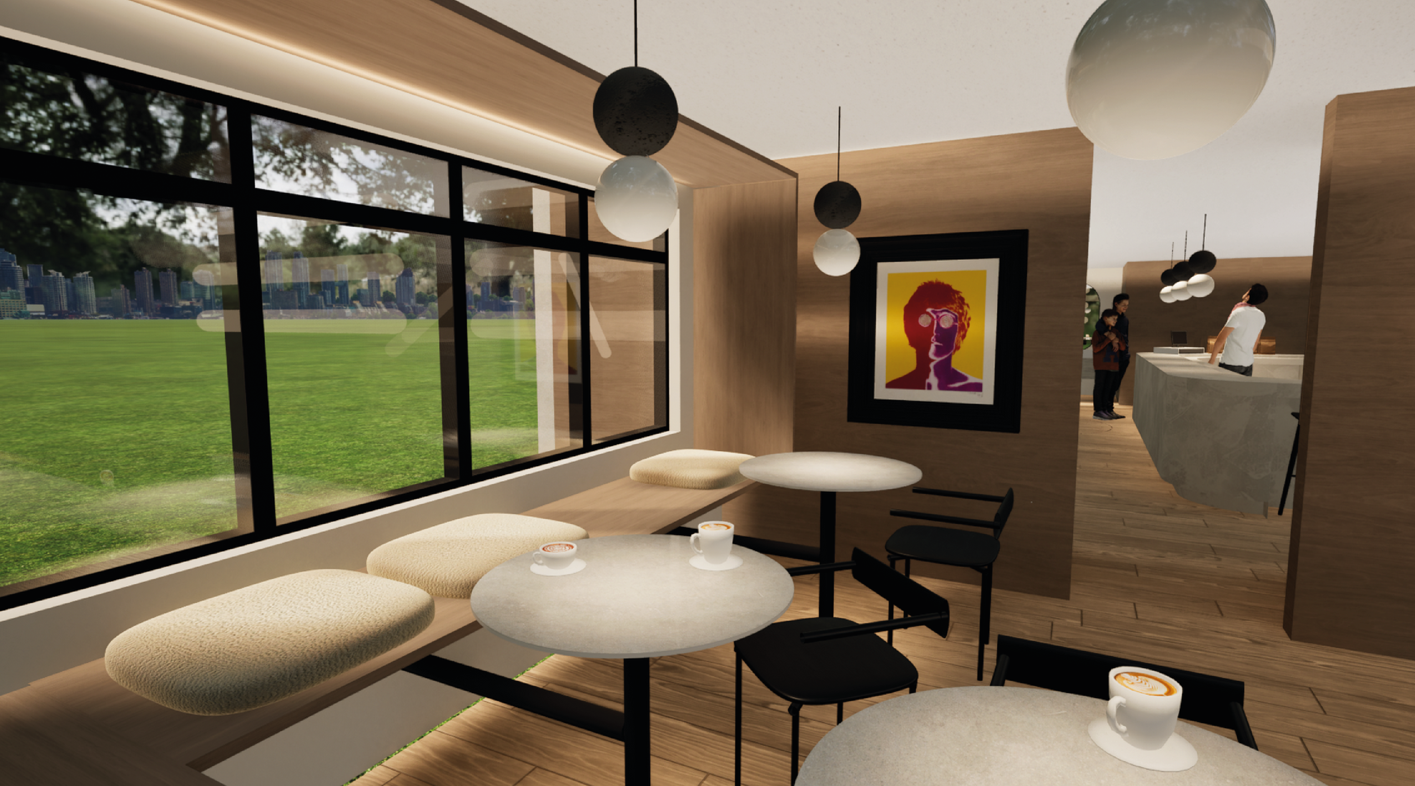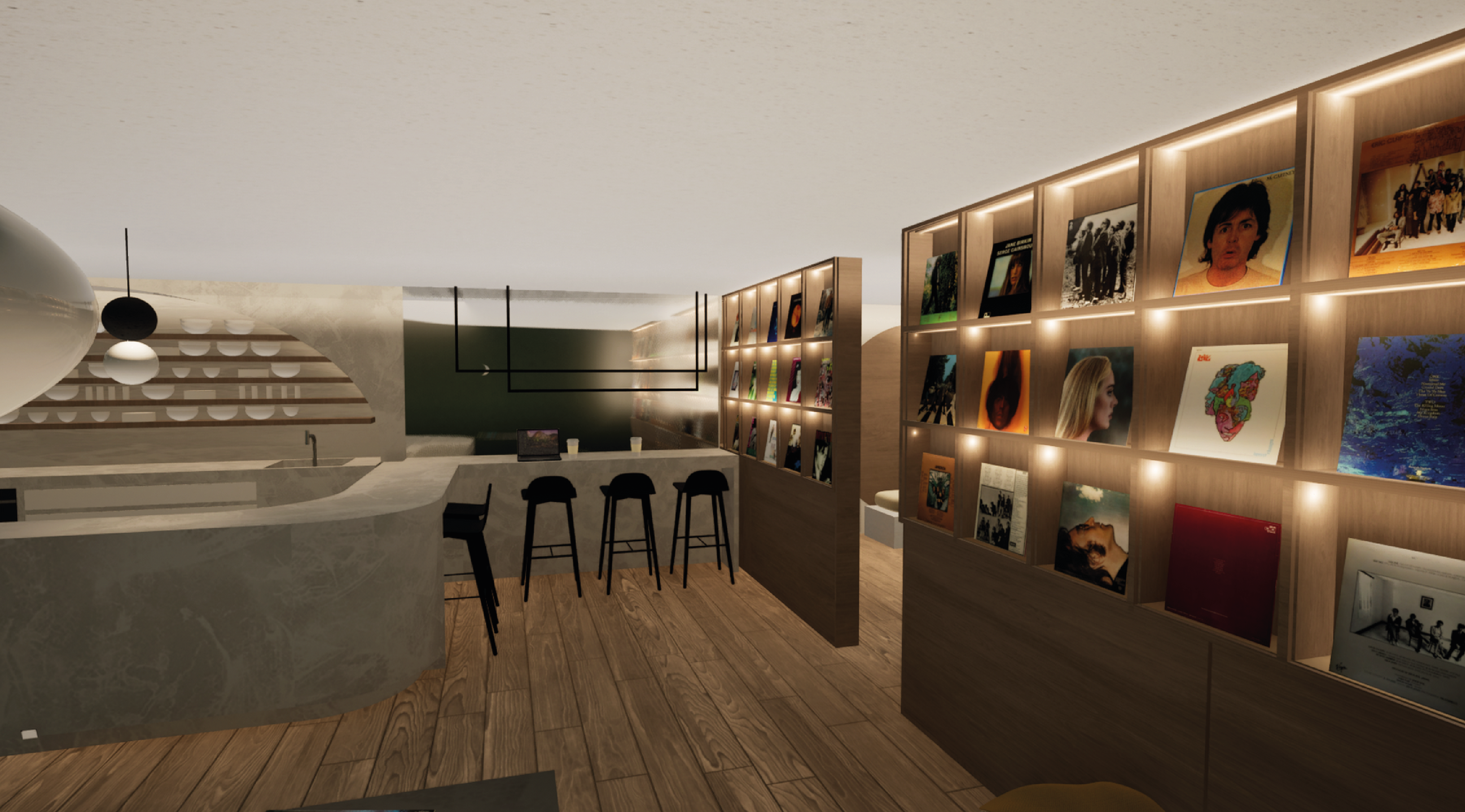 The space is thoughtfully divided into distinct zones, including a café, bar, seating areas, a coffee shop section, a turntable and record store, and restrooms. The design focuses on creating a seamless flow between these areas, providing both privacy for longer stays and convenient access for quick visits.