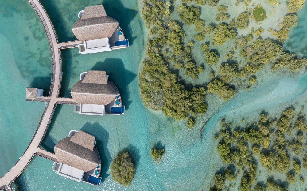 The interiors blend modernity and traditional Arabesque details. Floor-to-ceiling windows frame expansive views of the sea and mangroves, while the use of Mashrabiya patterns, intricate wood carvings, and locally inspired motifs seamlessly blends tradition and innovation.
