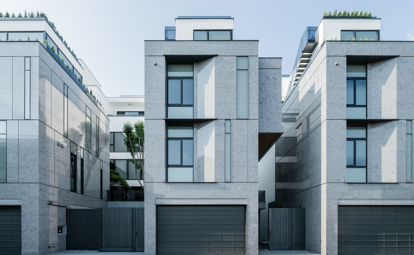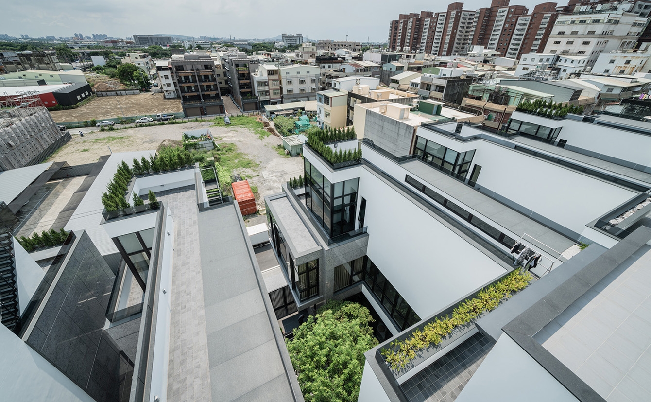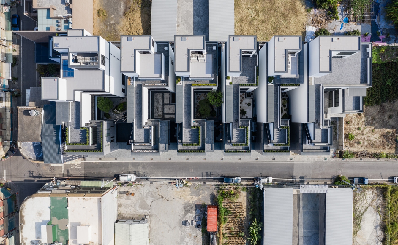 The site, bordered by a 7-meter lane to the south, is divided into six plots with widths of 8.5 to 14.8 meters and a depth of about 29 meters. Addressing privacy concerns in urban residences, a 2-meter setback eases road scale. A 2nd-floor central green courtyard serves as the primary window for each unit, ensuring privacy with interior stairs on one side and overhead windows. Additionally, a backyard with a cascading waterfall, rooftop gardens, and outdoor stairs harmonizes with the natural environment.