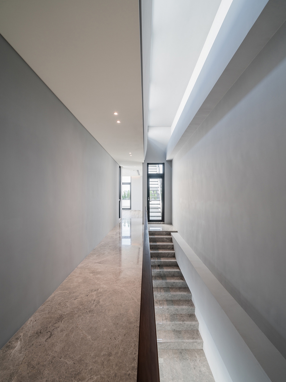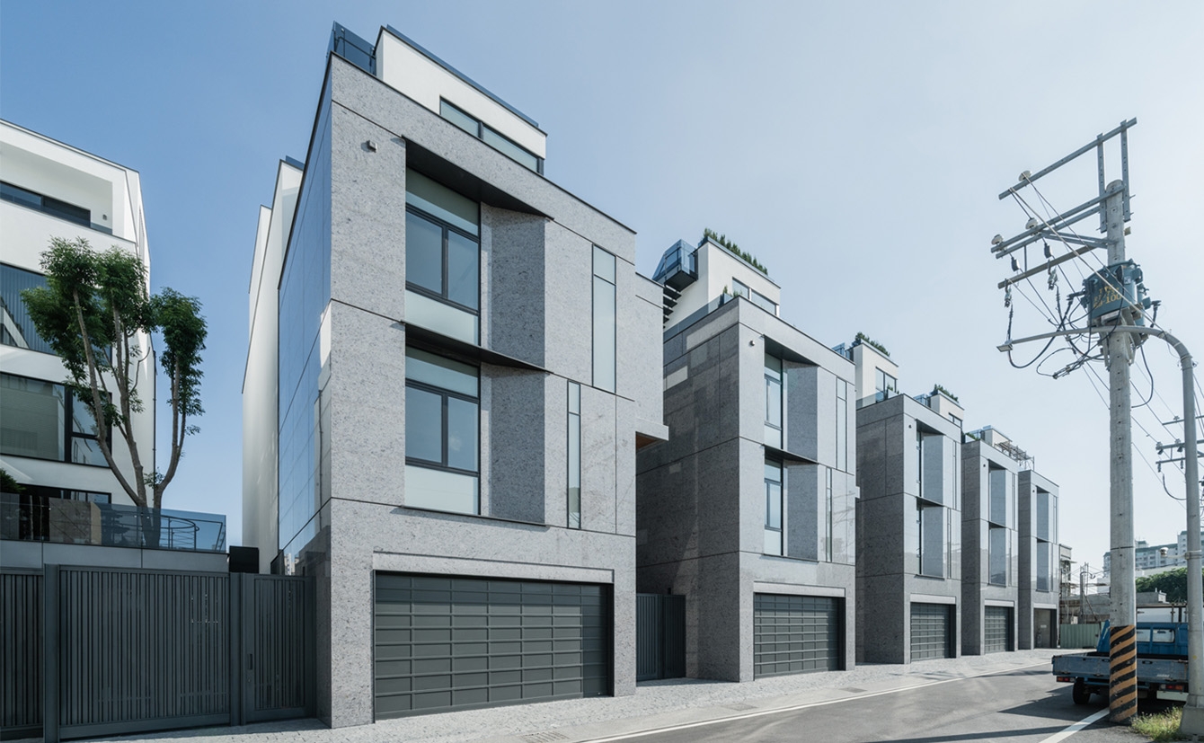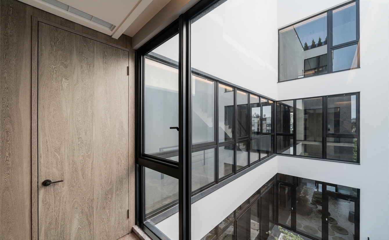 The site, bordered by a 7-meter lane to the south, is divided into six plots with widths of 8.5 to 14.8 meters and a depth of about 29 meters. Addressing privacy concerns in urban residences, a 2-meter setback eases road scale. A 2nd-floor central green courtyard serves as the primary window for each unit, ensuring privacy with interior stairs on one side and overhead windows. Additionally, a backyard with a cascading waterfall, rooftop gardens, and outdoor stairs harmonizes with the natural environment.