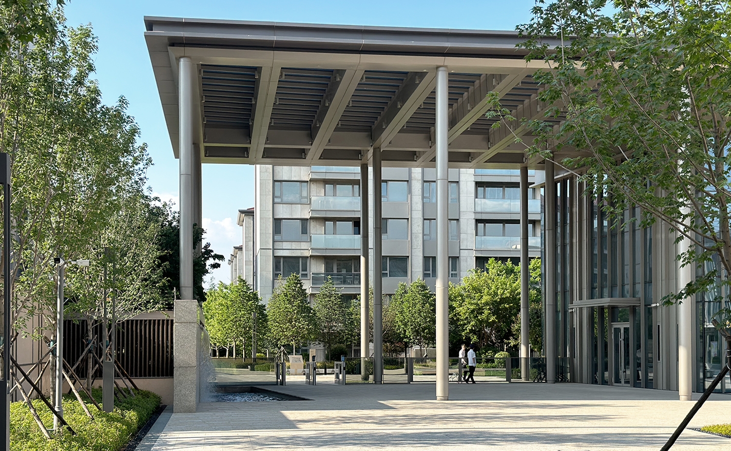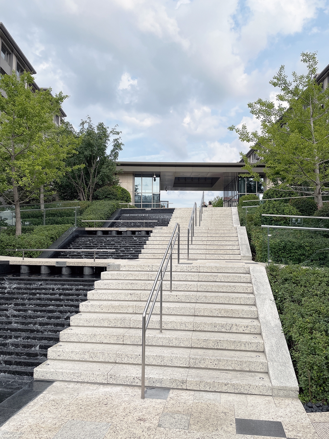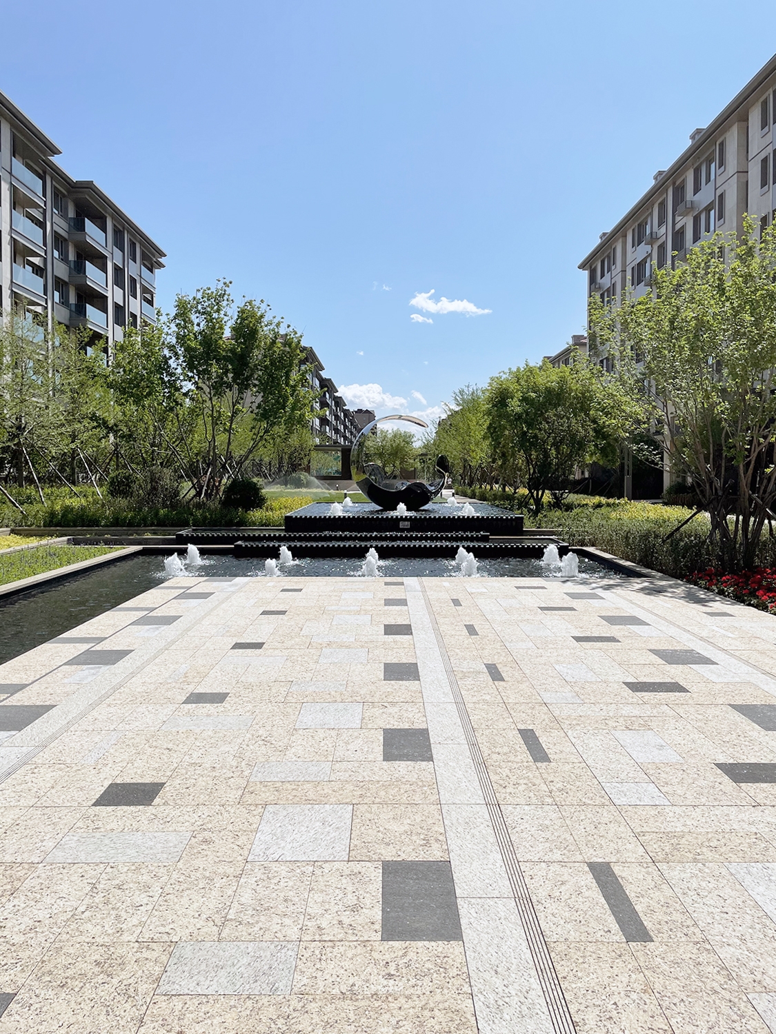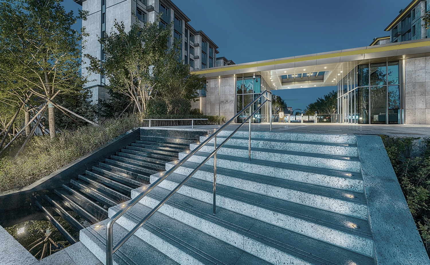 Nestled in the lush greenery of Jingyue District in the southeastern corner of the city, this community is set amid rolling hills, with Juyue Commercial Street on the south side providing a transition space between the community and the main roads. From the Sakura East Street green belt, a pathway extends northward, leading to a plaza and through a three-story high canopy, accompanied by the soothing sound of cascading water, arriving at the southern entrance and connecting the main north-south axis of landscaped greenways. On the western side, a grand staircase, flanked by flowing water, ascends the slope, while a zigzagging accessible ramp gently bridges the terrain differences and provides sweeping views of the community.