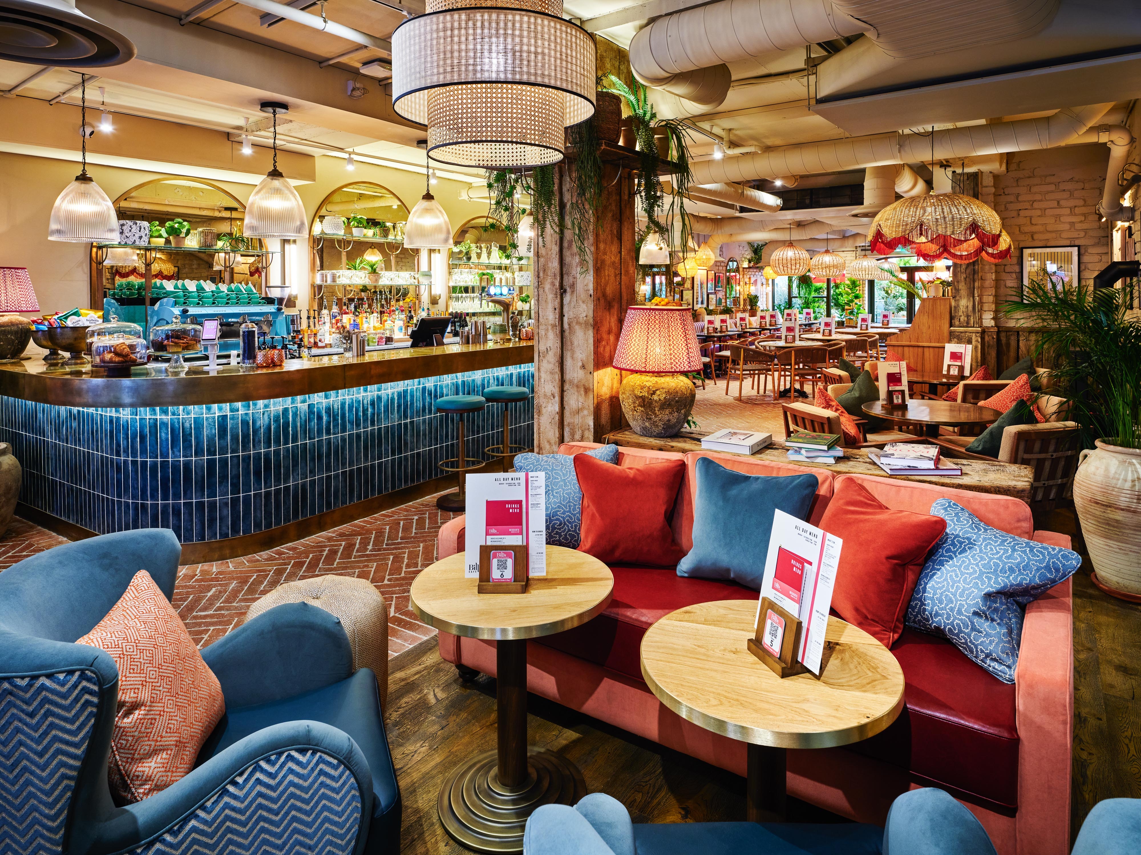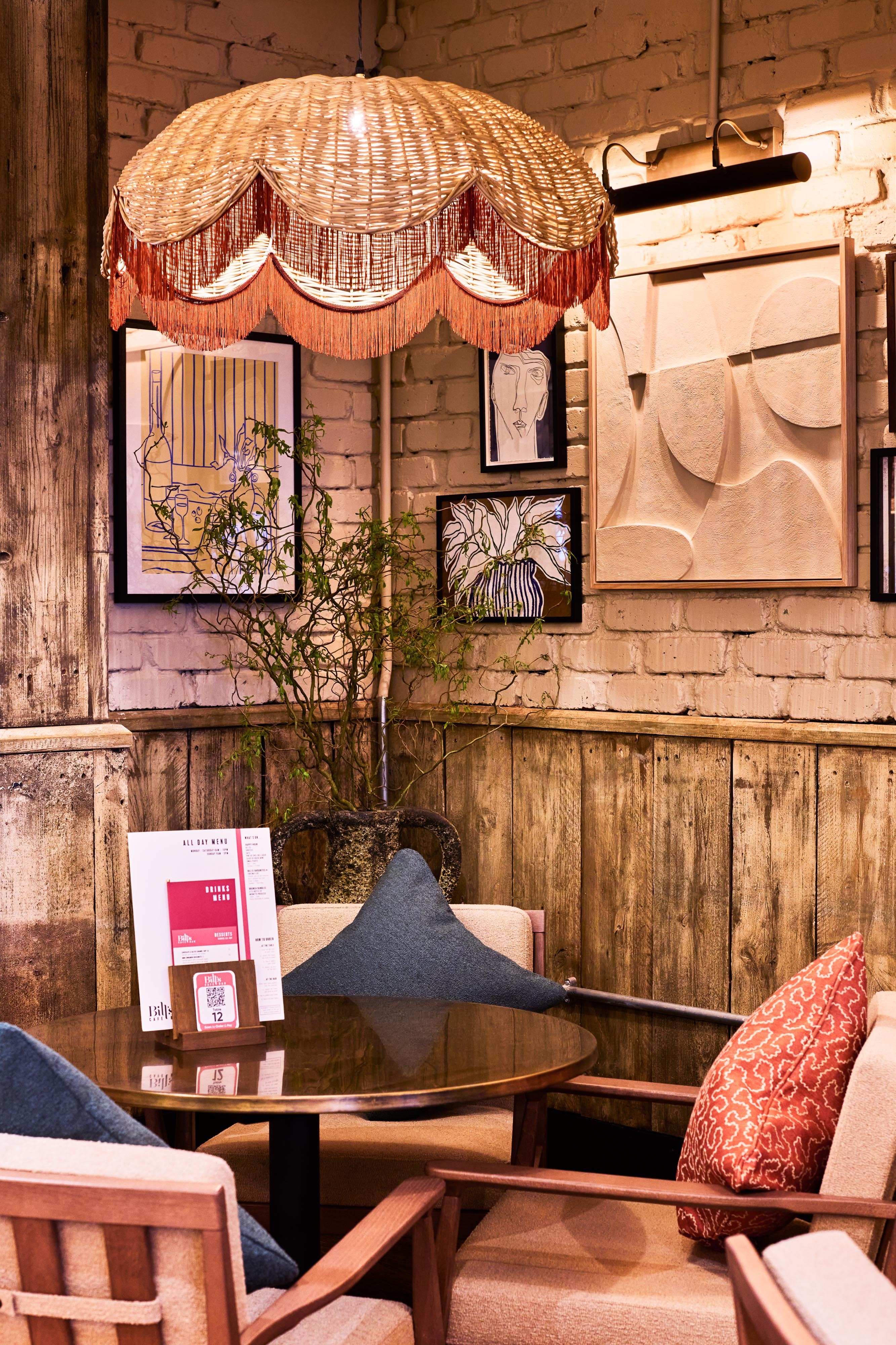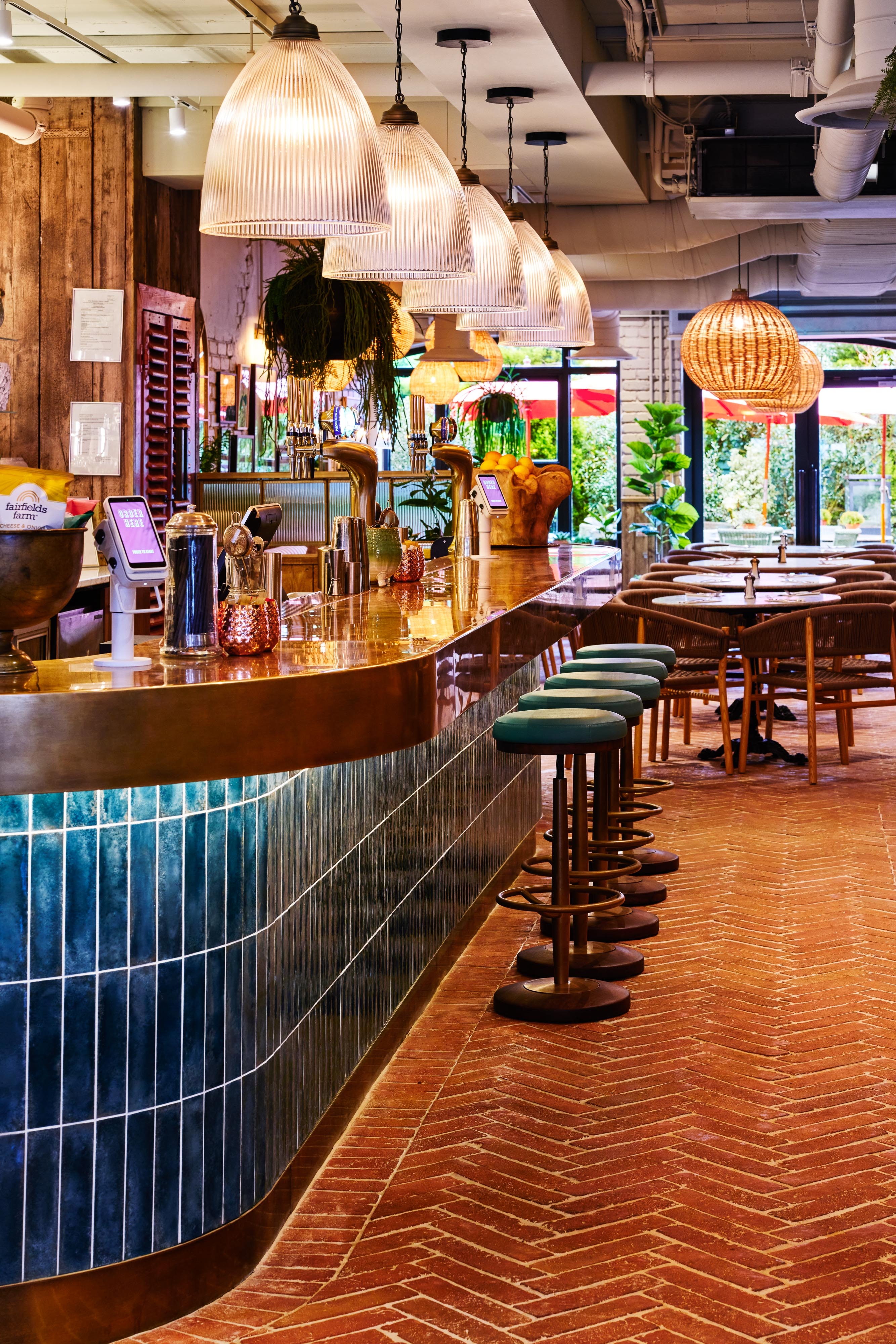 Bill’s Restaurant’s redesign embraces an eclectic, colourful aesthetic that aligns seamlessly with our brand proposition. Each space feels like a room in Bill’s own home, bursting with personality: the Conservatory showcases bold terracotta-striped banquettes, woven seating, and rattan lampshades; the Bar features an eye-catching azure blue-tiled counter with a brass top and bespoke tasseled lights; and the Lounge blends deep reds and coastal teals across soft seating, highlighted by layered drum lights and rich timber floors.