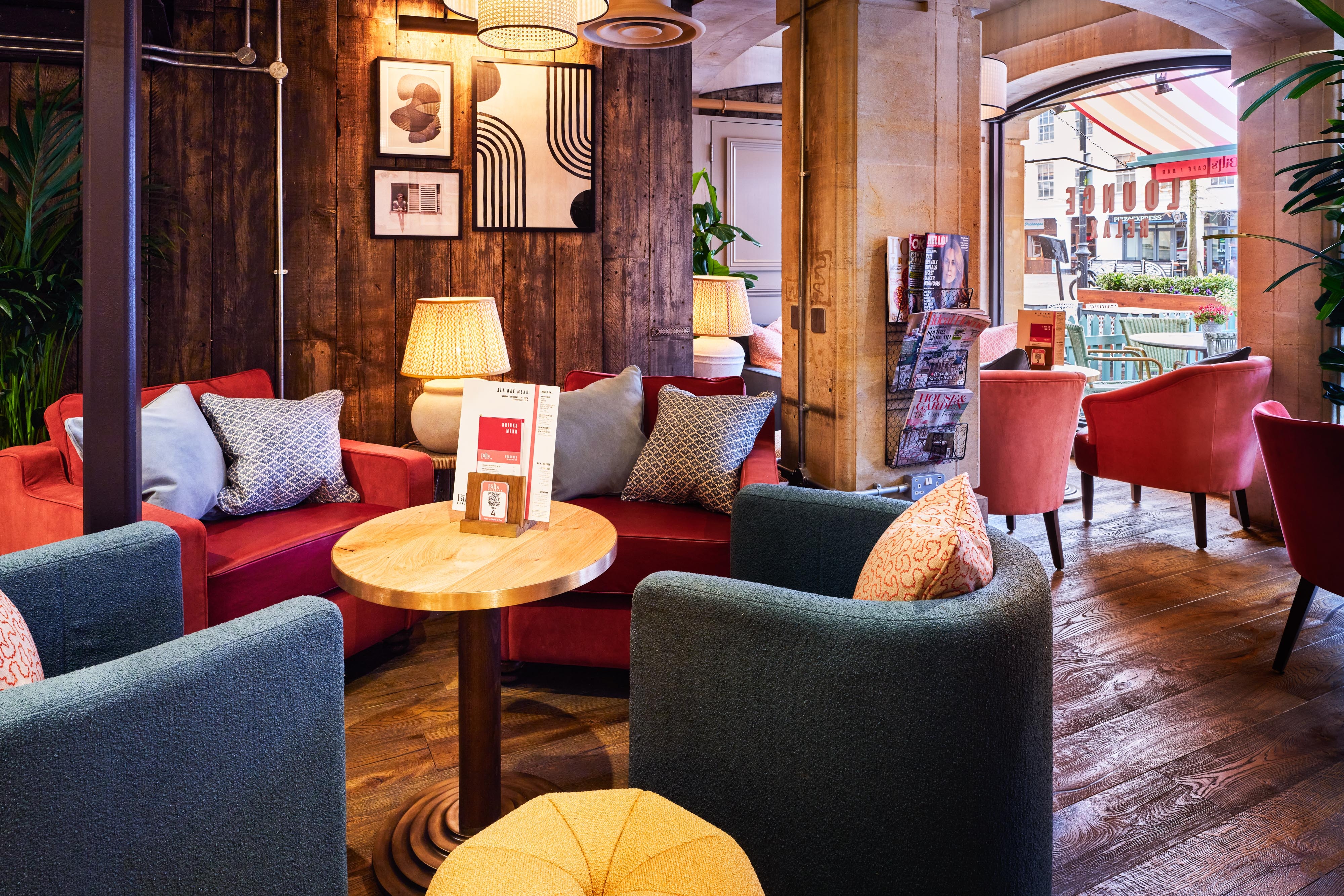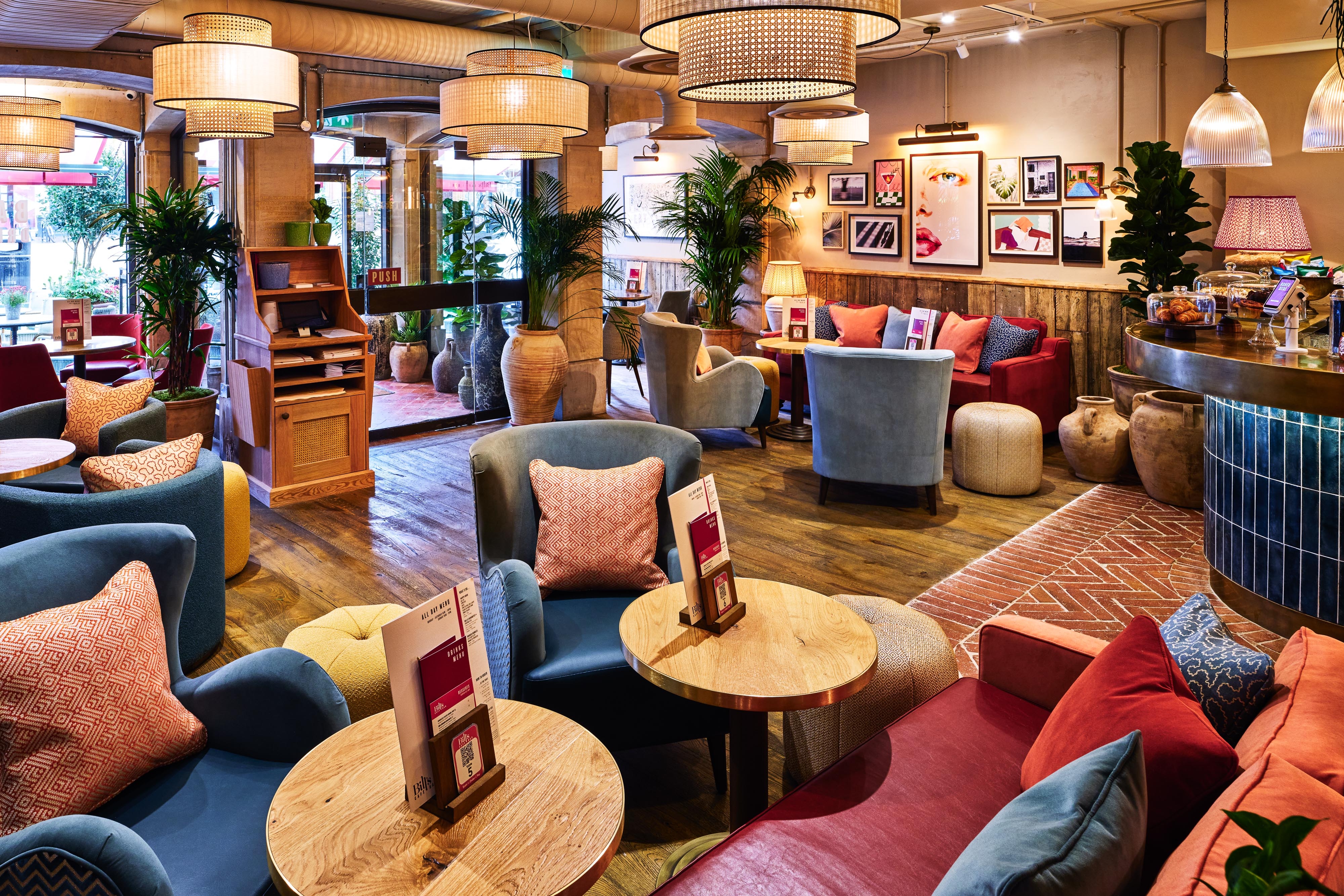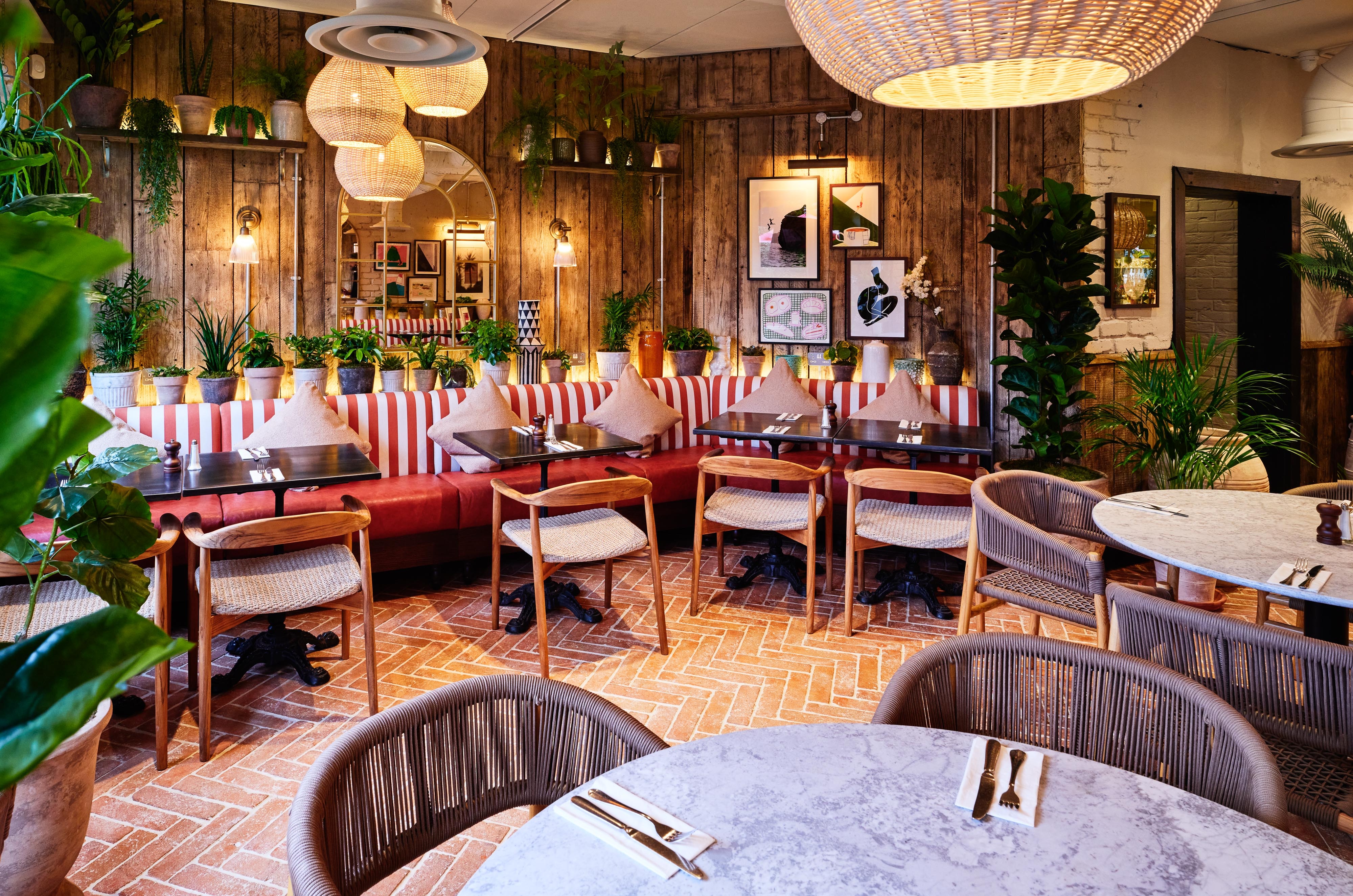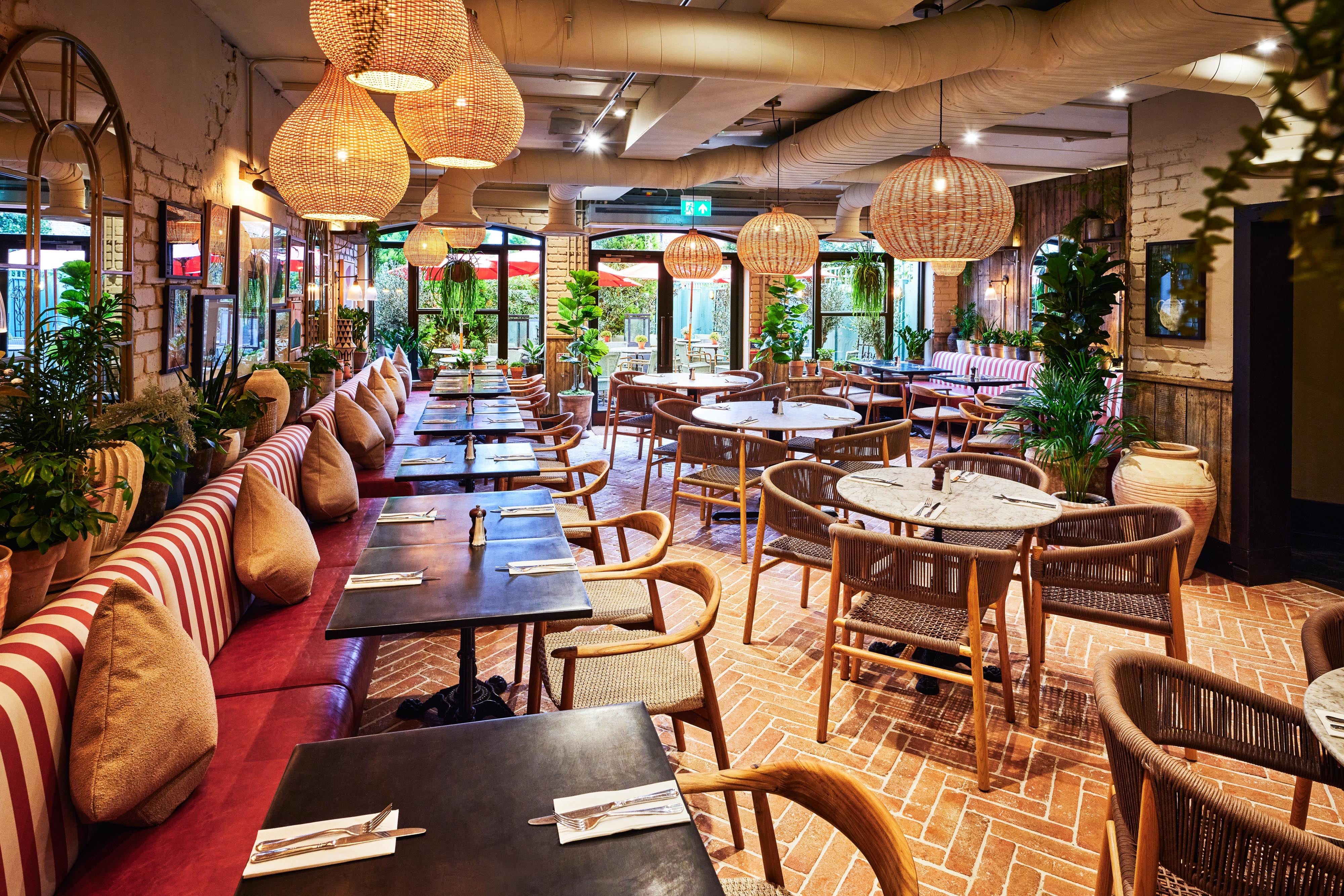 Bill’s Restaurant’s redesign embraces an eclectic, colourful aesthetic that aligns seamlessly with our brand proposition. Each space feels like a room in Bill’s own home, bursting with personality: the Conservatory showcases bold terracotta-striped banquettes, woven seating, and rattan lampshades; the Bar features an eye-catching azure blue-tiled counter with a brass top and bespoke tasseled lights; and the Lounge blends deep reds and coastal teals across soft seating, highlighted by layered drum lights and rich timber floors.