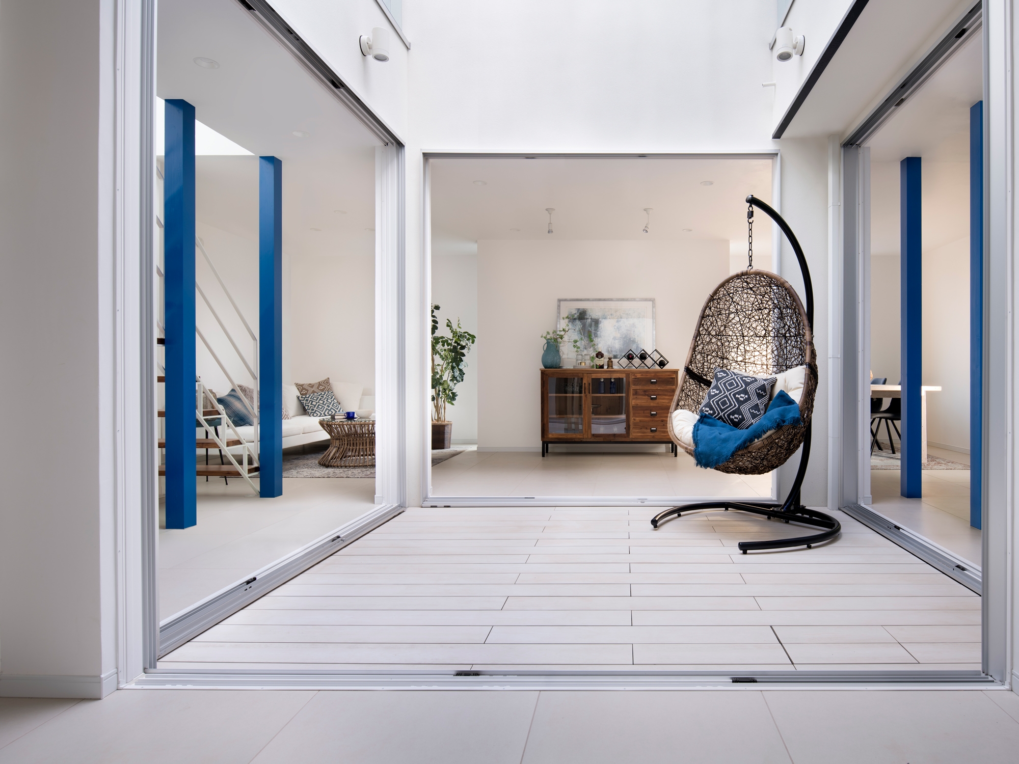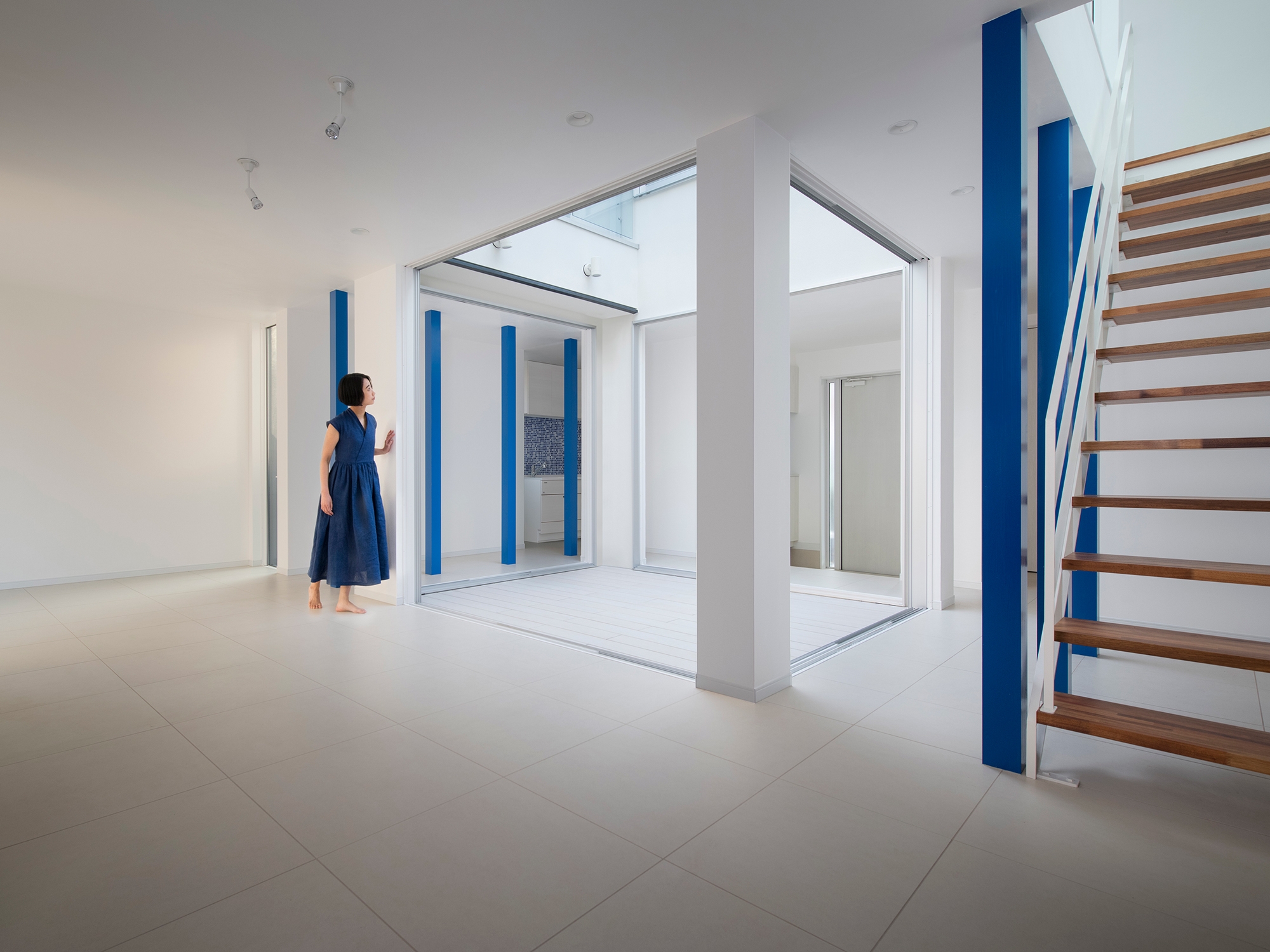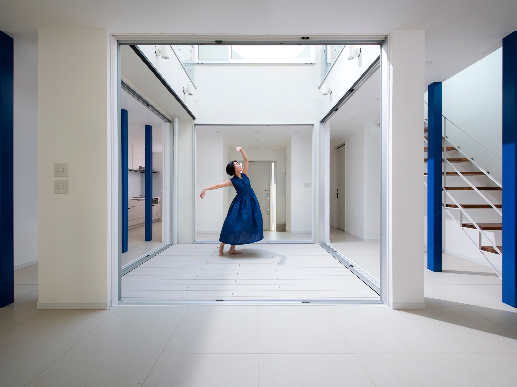 Traditional Japanese townhouses (machiya) integrate nature by placing a garden at the center, nurturing a unique aesthetic and respect for the natural world. However, modern houses, with their focus on functionality, tend to isolate themselves from the outside environment. In response, architect Shin Takamatsu designed this house, inspired by traditional living, with the mission of coexisting with the sky. On a narrow urban site, a large courtyard is placed at the center, with all rooms and corridors surrounding it. This design connects every space in the house to the courtyard, making the entire home feel like one unified space centered around the skyWindows facing the exterior are limited, and most of the light comes from the courtyard, filling the home with indirect, natural light. Even when artificial lighting is turned off, the space retains its value. The design allows the space to connect not only horizontally but vertically as well, creating a feeling of openness towards the sky, as if being embraced by it. The skyline, reminiscent of rugged mountain ranges, lifts the gaze of passersby, giving them an opportunity to see and experience the sky.