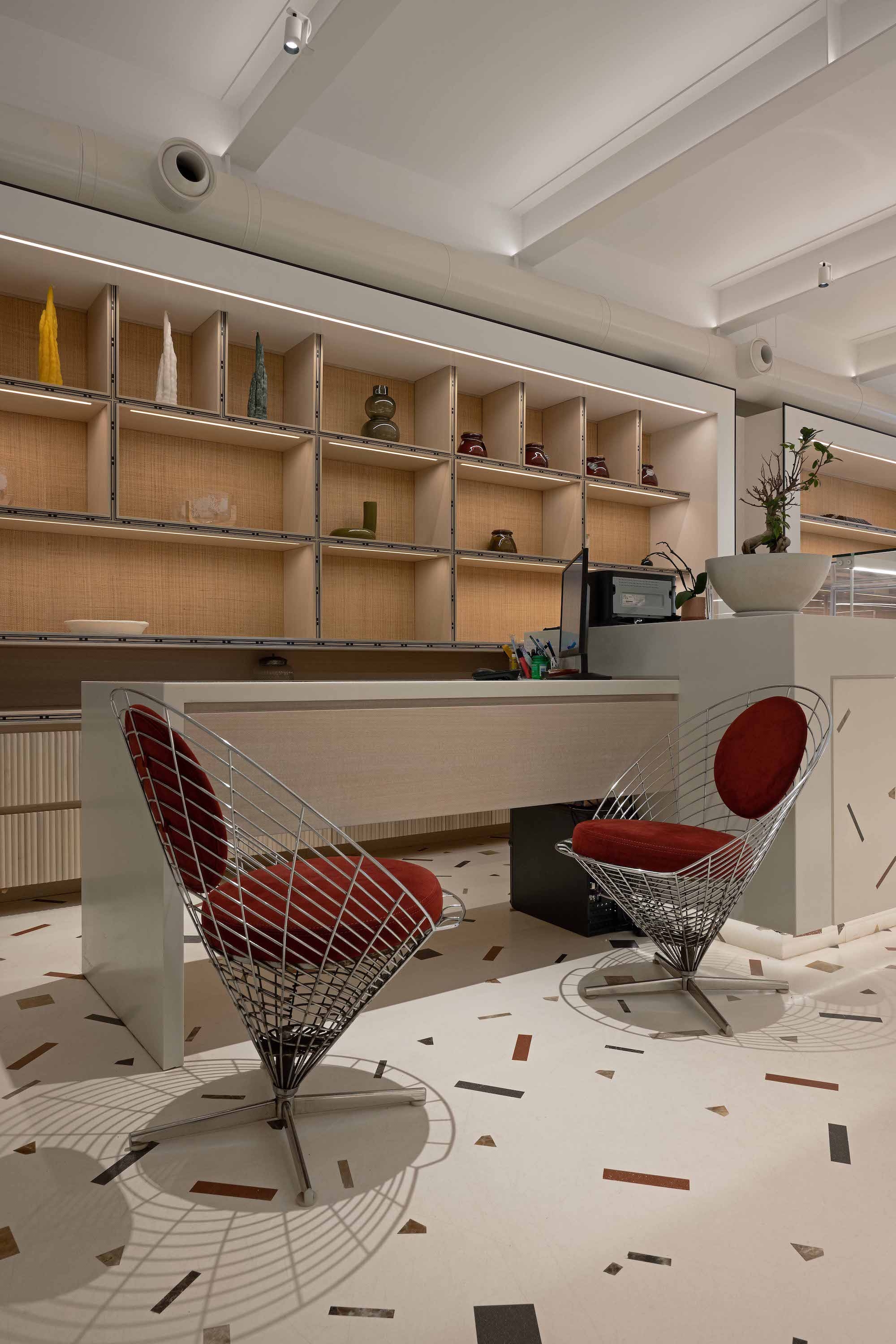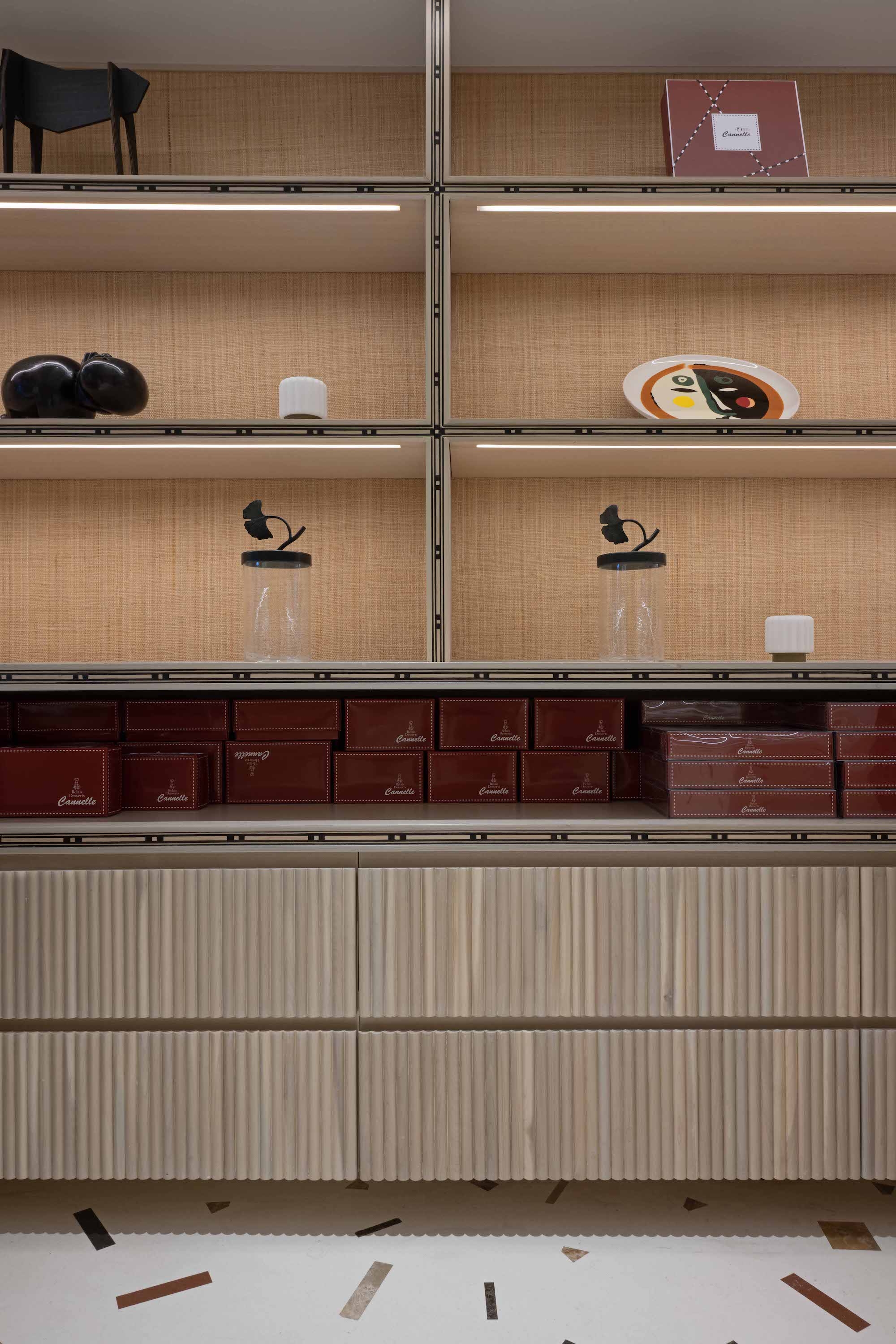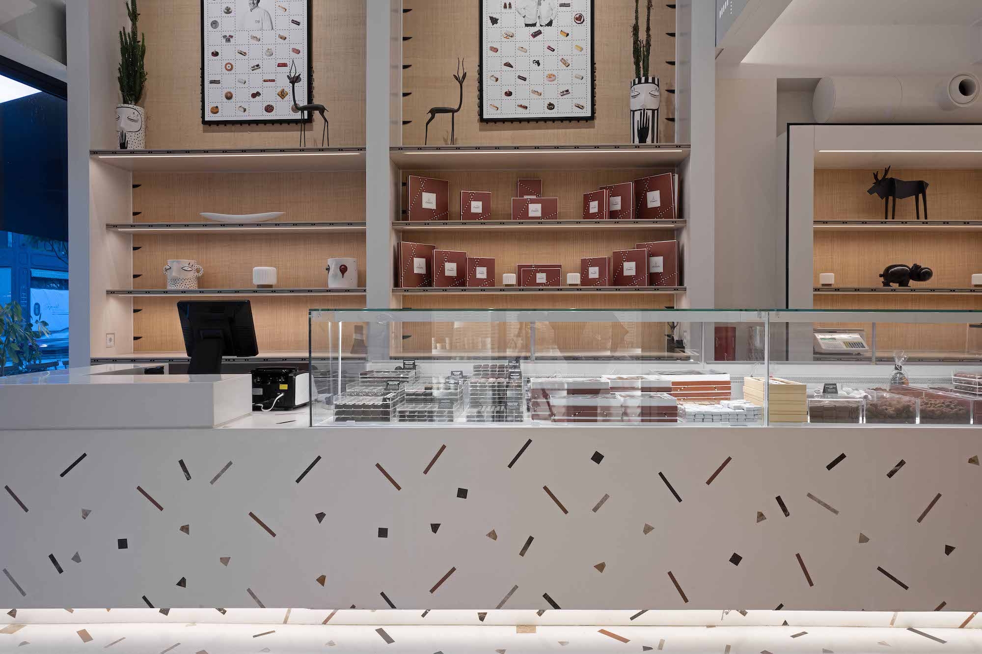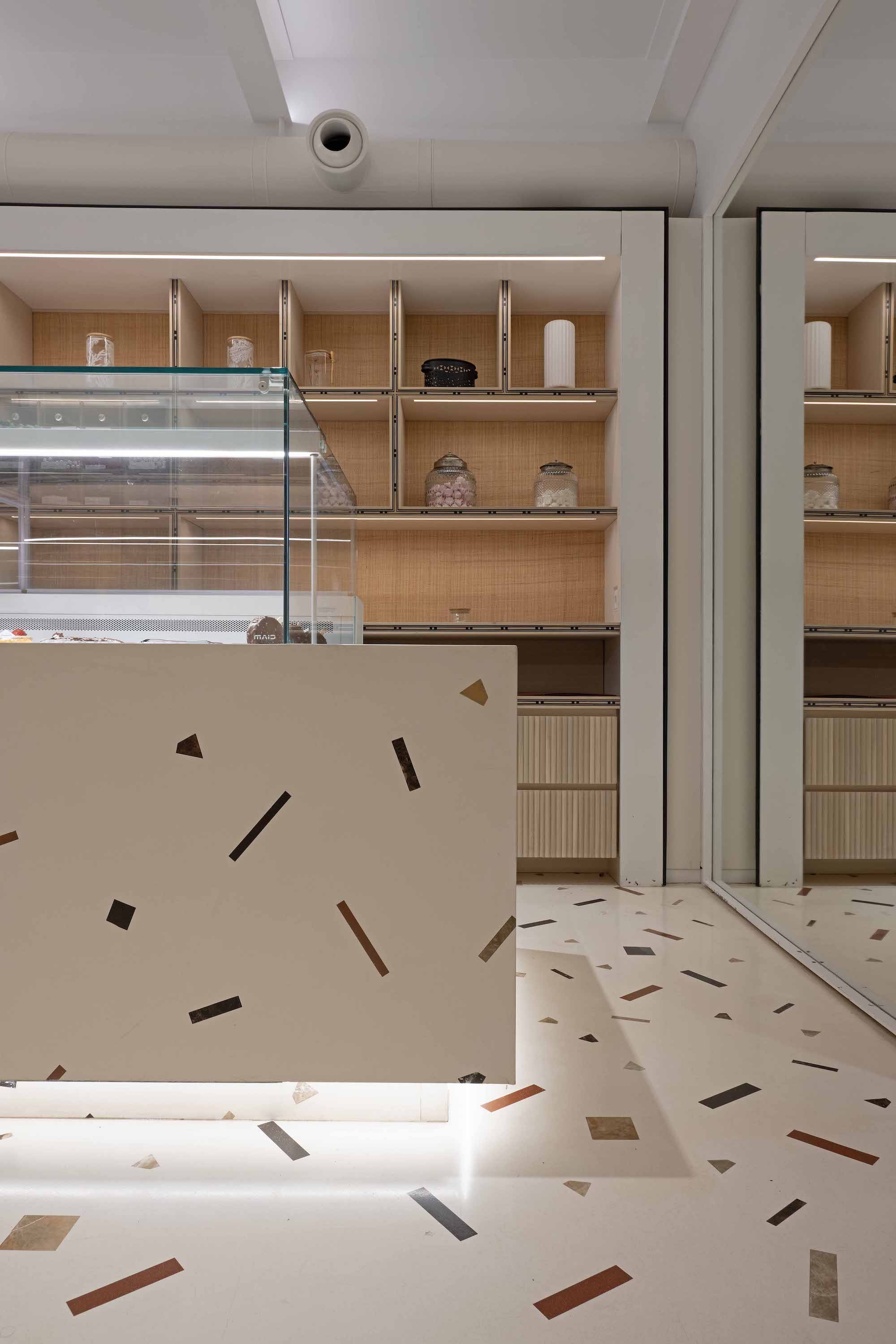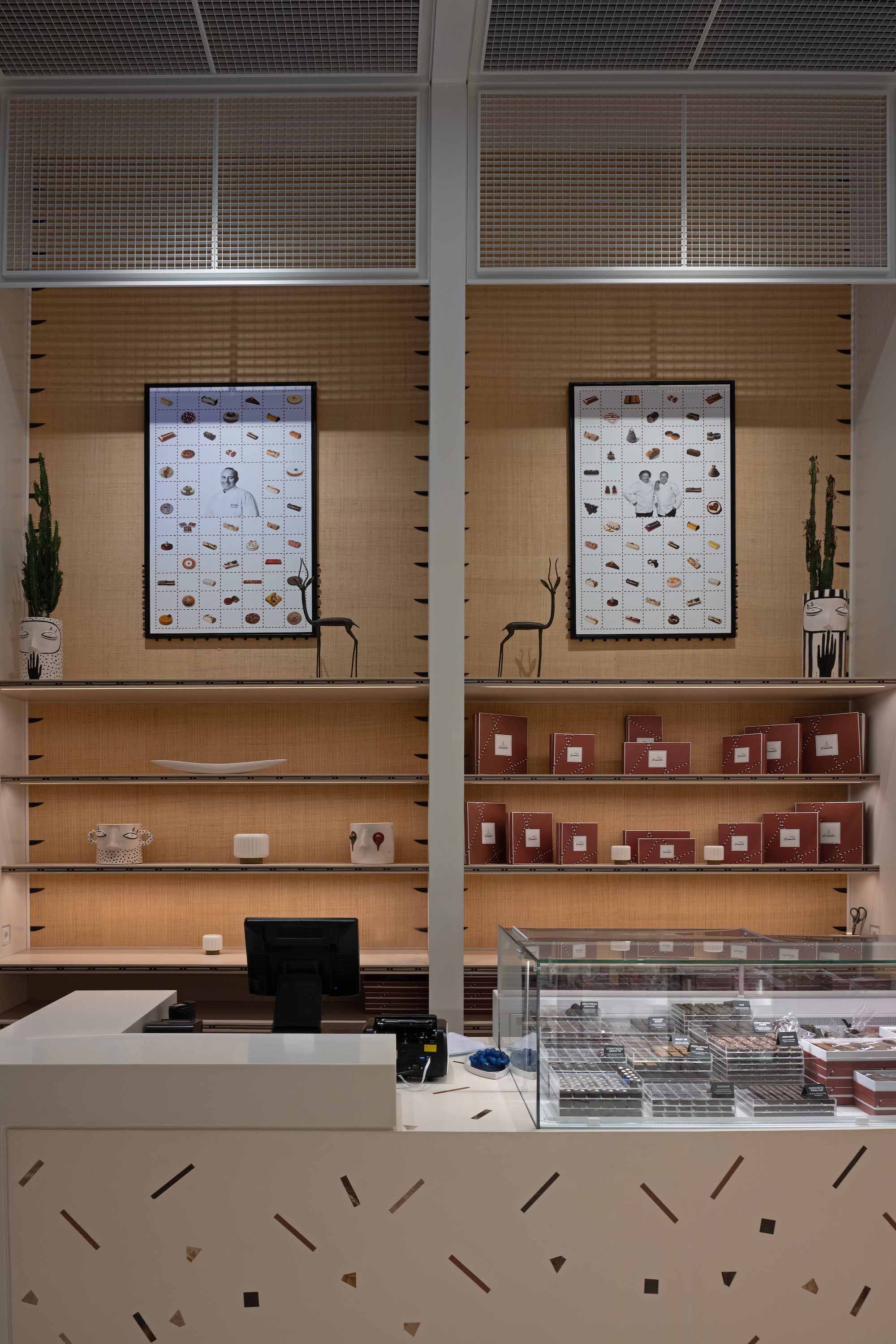 The terrazzo flooring created for Cannelle serves as a signature element, as it embeds within it inlaid chocolate bars and cinnamon sticks, enticing customers to indulge. Earthy tones reminiscent of vanilla and chocolate hues dominate, mirroring the essence of Cannelle’s products.