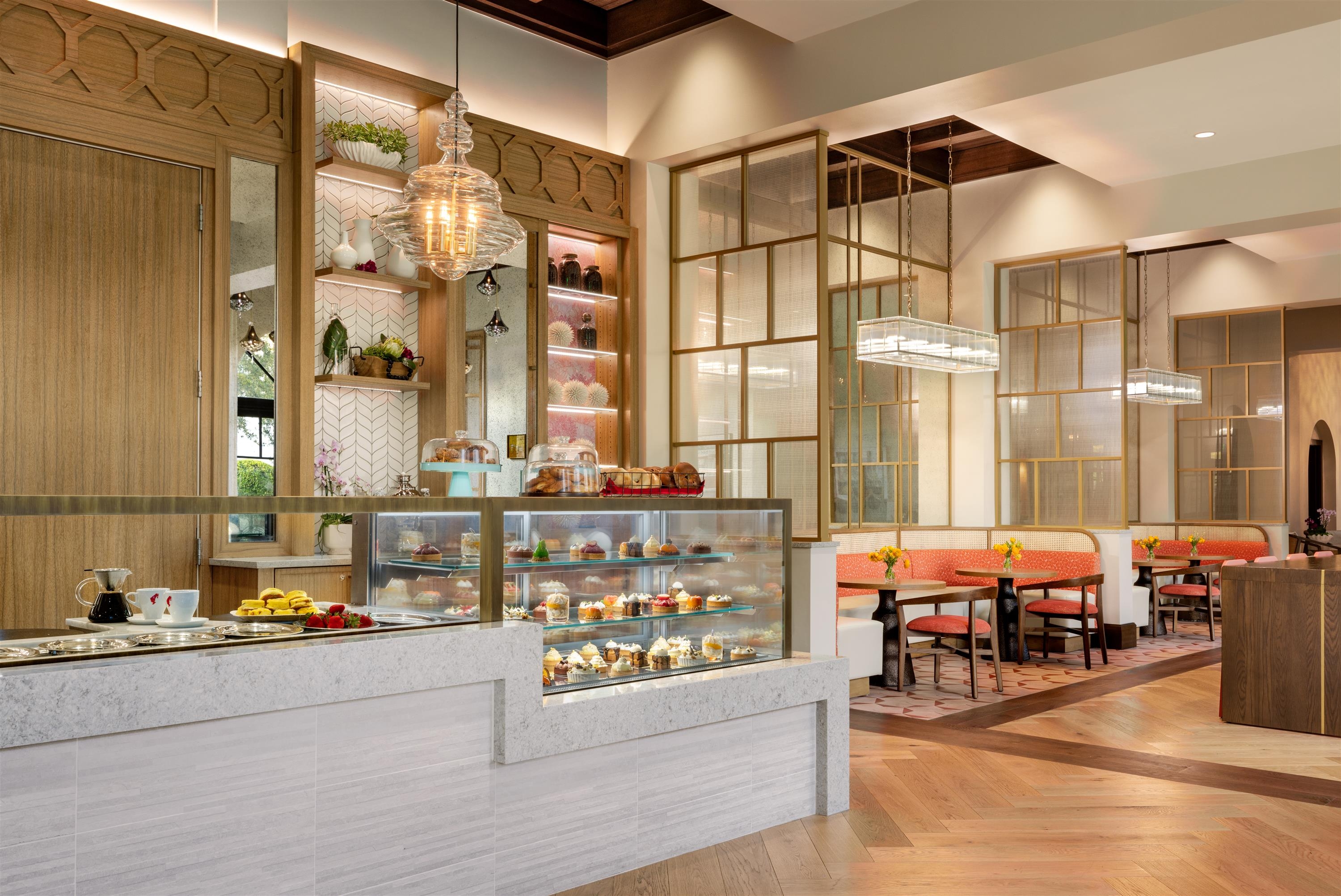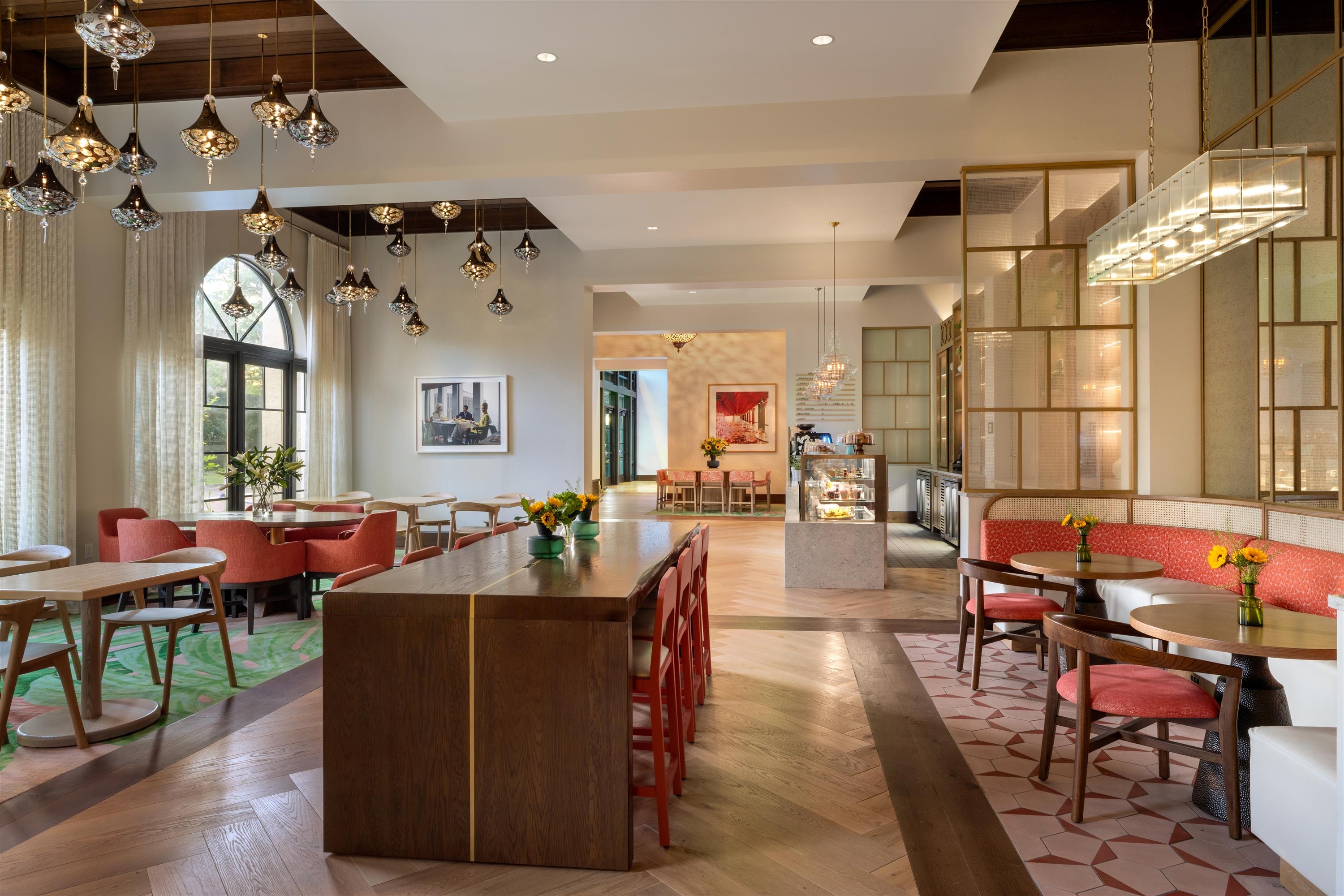 The new Café, formerly back-of-house, now links the hotel’s two wings, offering quick bites and drinks by day and a chic wine and dessert bar by night. Vibrant pinks and lush greens evoke Winter Park’s natural beauty, with dynamic lighting, bold food-themed art, and cozy seating fostering community and creativity.