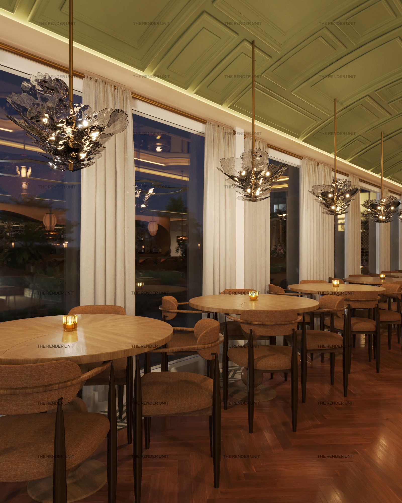Luxe yet cozy, the indoor dining room will envelop visitors in its pleasing palette of muted greens and earth tones. Gold leaf ceilings, dramatic marble, and Murano glass chandeliers elevate the design. Chinoiserie wallpapers and cane furniture speak to the Vietnamese/French connection.