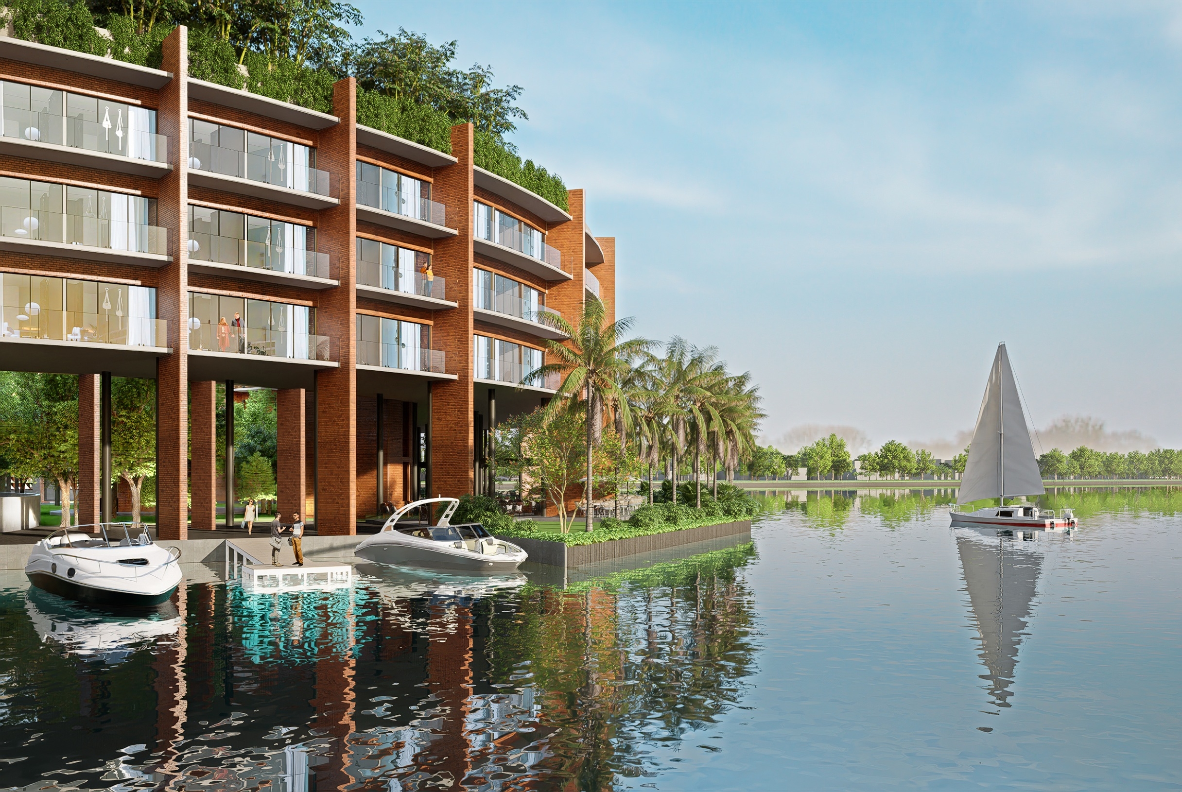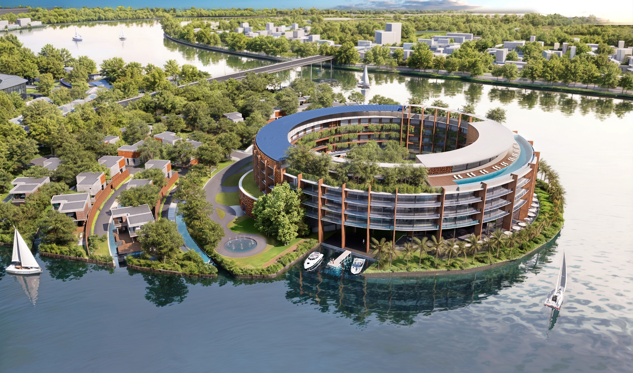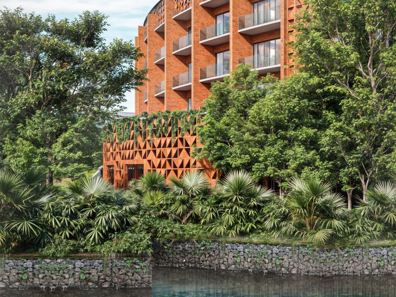 The brief entailed a 150-room resort and 26 luxury villas located on a unique river island setting. Located 50km south of Da Nang City and just under 4 hectares in size, the masterplan extended to the entire island. The double happiness symbol, synonymous with Vietnamese culture inspired the circular form of the hotel that ripples across the entire site, taking advantage of the panoramic 270? river views. A symbol of good luck, unity and happiness often associated with Vietnamese weddings. References to Cham culture give rise to added warmth and detail. Inspiration was drawn from the nearby Khuong My Towers, the exposed earthy hues of the brick combined with the wild vegetation that has taken root over time. Brick becomes the main finish of the resort, forming a rotating rhythm of structural walls. A double height conference centre is embedded into the resort plan, it’s glazed façade is protected from the heat by a textured ceramic sun-screen. The roof houses the guest pool, café, dining garden and yoga garden. Man made water features echo the circular plan of the resort, allowing each villa to enjoy a connection with water, forming a truly unique setting to live, play and relax.