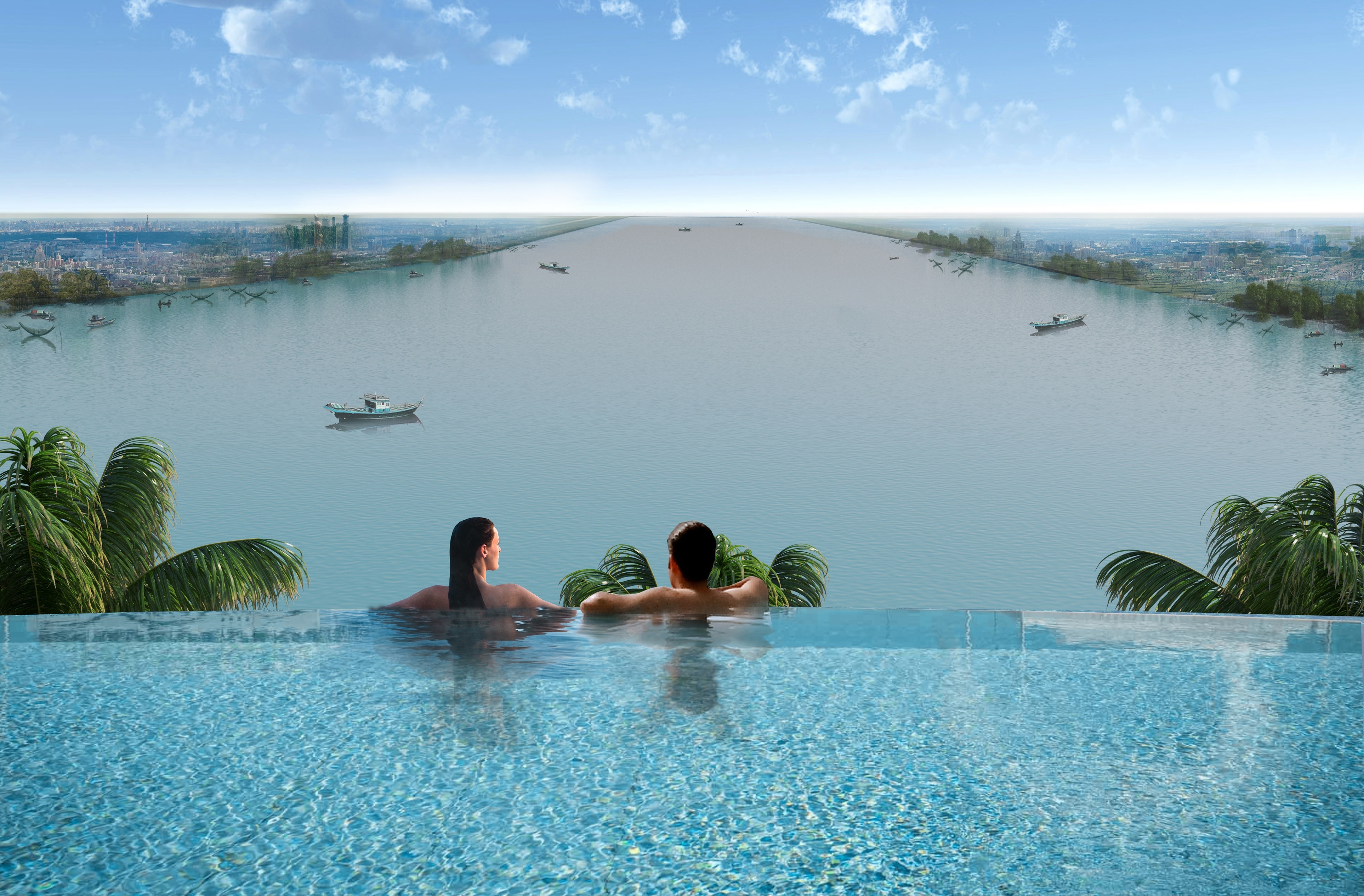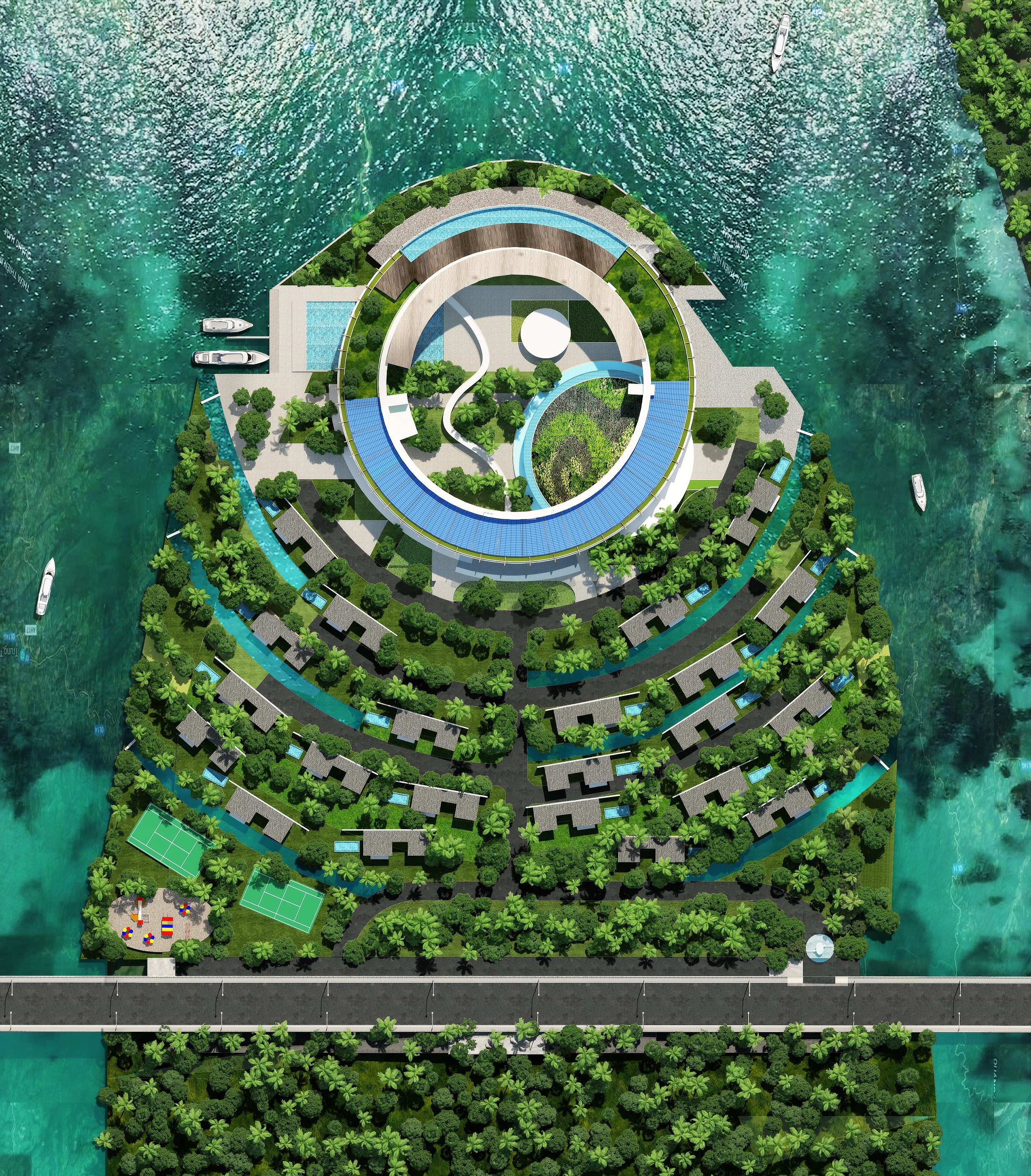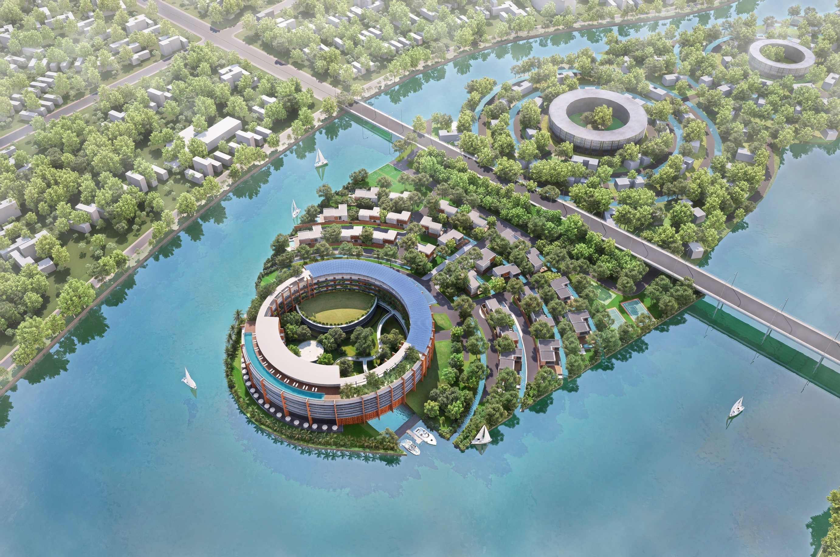 The brief entailed a 150-room resort and 26 luxury villas located on a unique river island setting. Located 50km south of Da Nang City and just under 4 hectares in size, the masterplan extended to the entire island. The double happiness symbol, synonymous with Vietnamese culture inspired the circular form of the hotel that ripples across the entire site, taking advantage of the panoramic 270? river views. A symbol of good luck, unity and happiness often associated with Vietnamese weddings. References to Cham culture give rise to added warmth and detail. Inspiration was drawn from the nearby Khuong My Towers, the exposed earthy hues of the brick combined with the wild vegetation that has taken root over time. Brick becomes the main finish of the resort, forming a rotating rhythm of structural walls. A double height conference centre is embedded into the resort plan, it’s glazed façade is protected from the heat by a textured ceramic sun-screen. The roof houses the guest pool, café, dining garden and yoga garden. Man made water features echo the circular plan of the resort, allowing each villa to enjoy a connection with water, forming a truly unique setting to live, play and relax.
