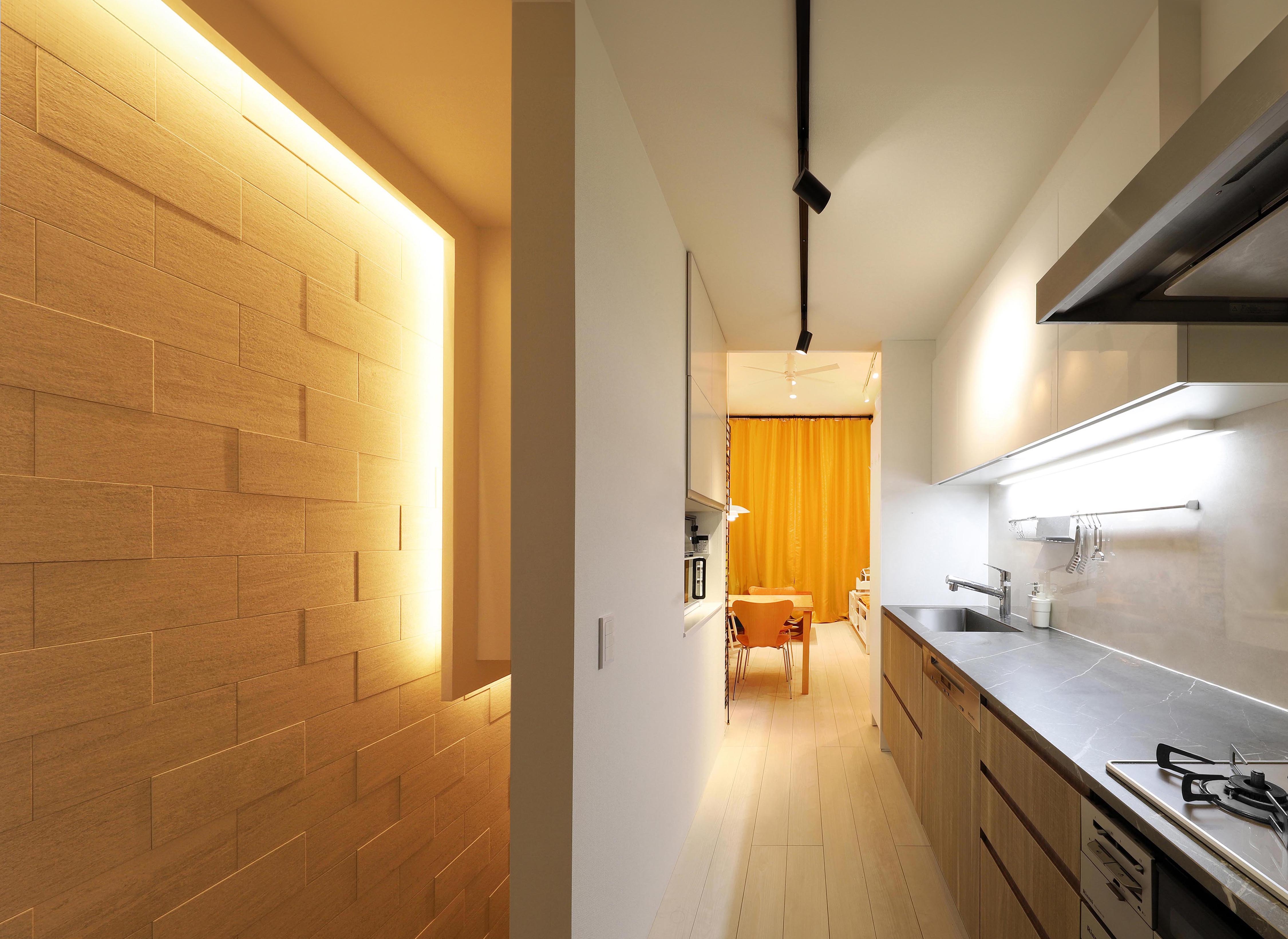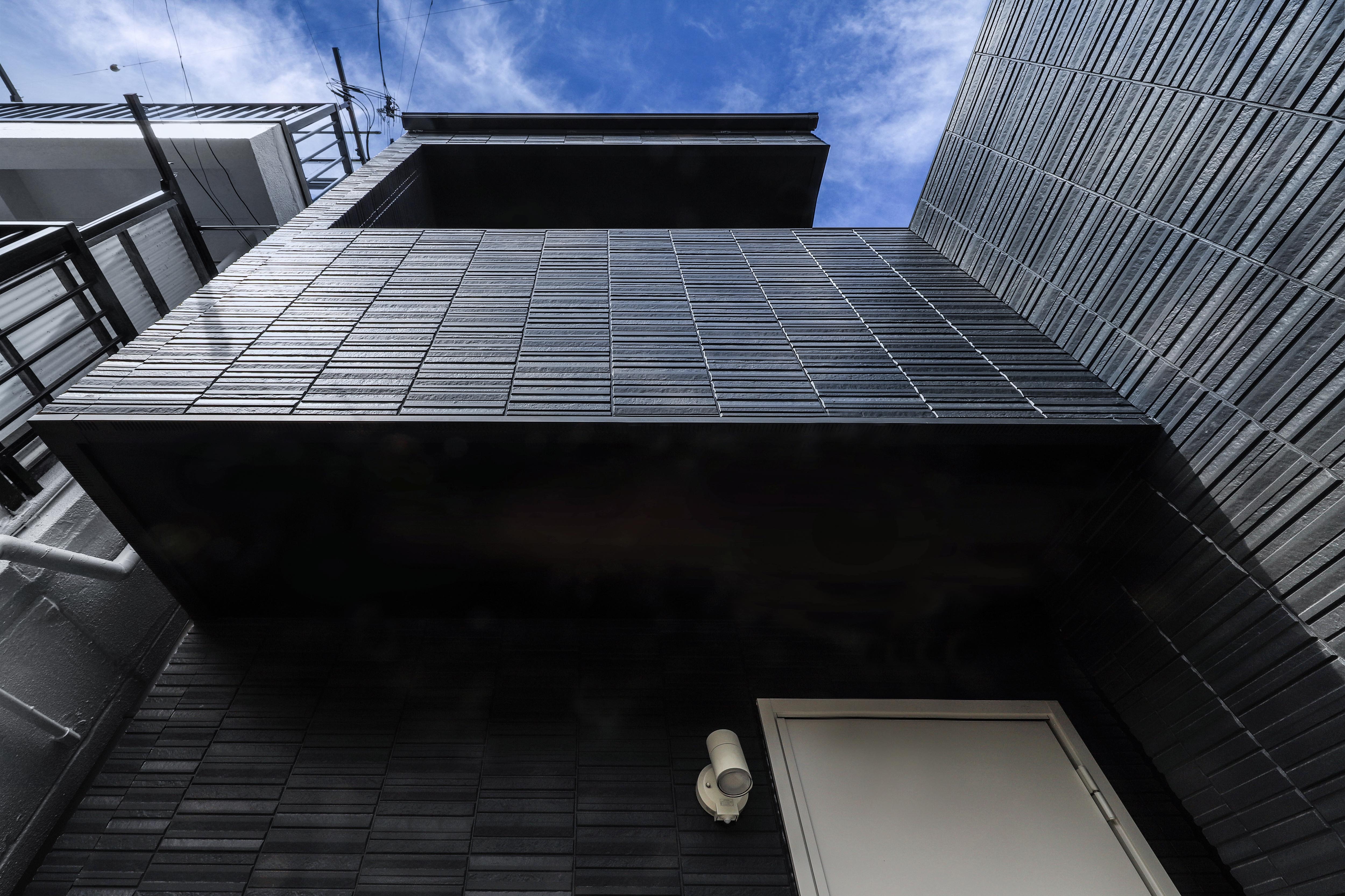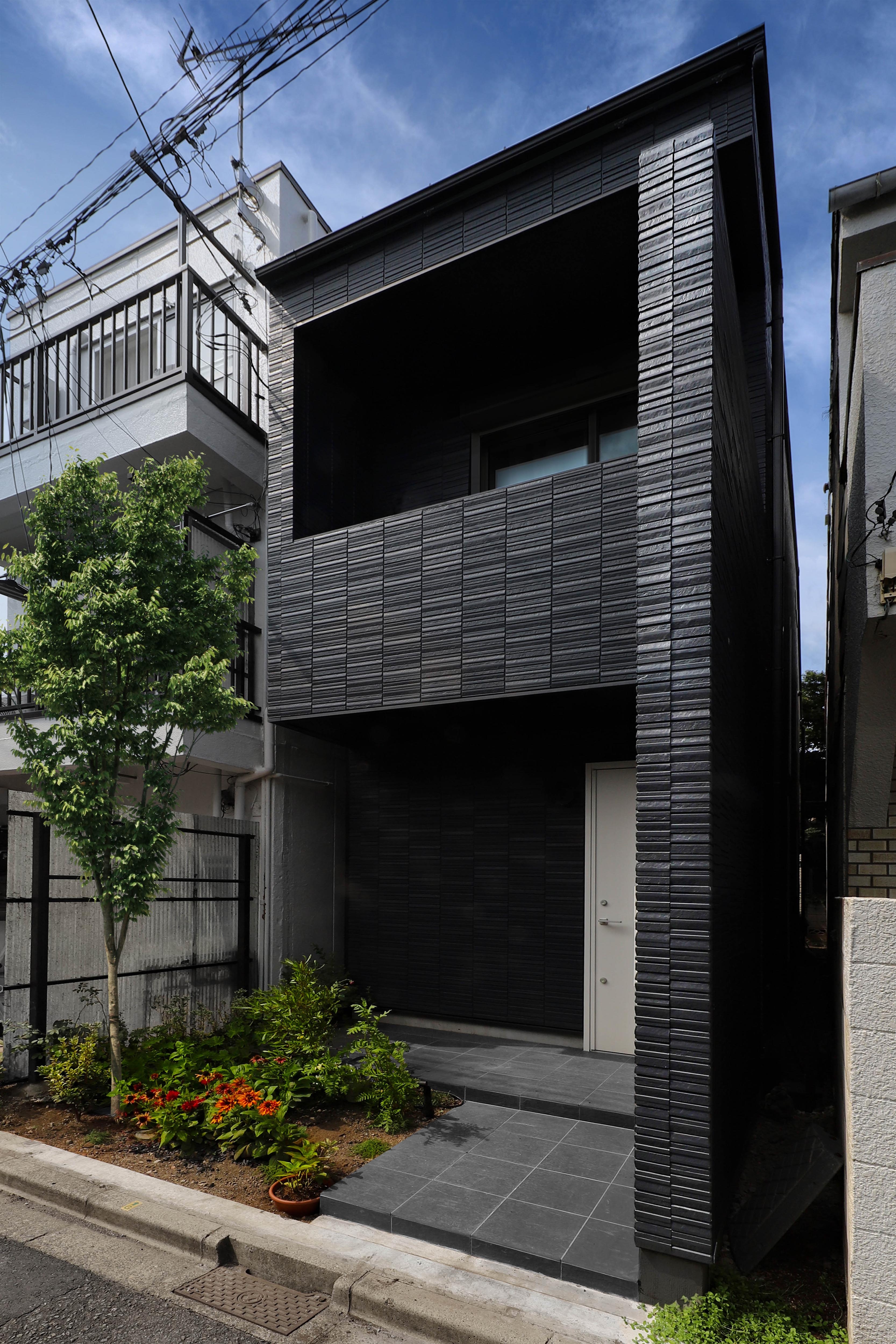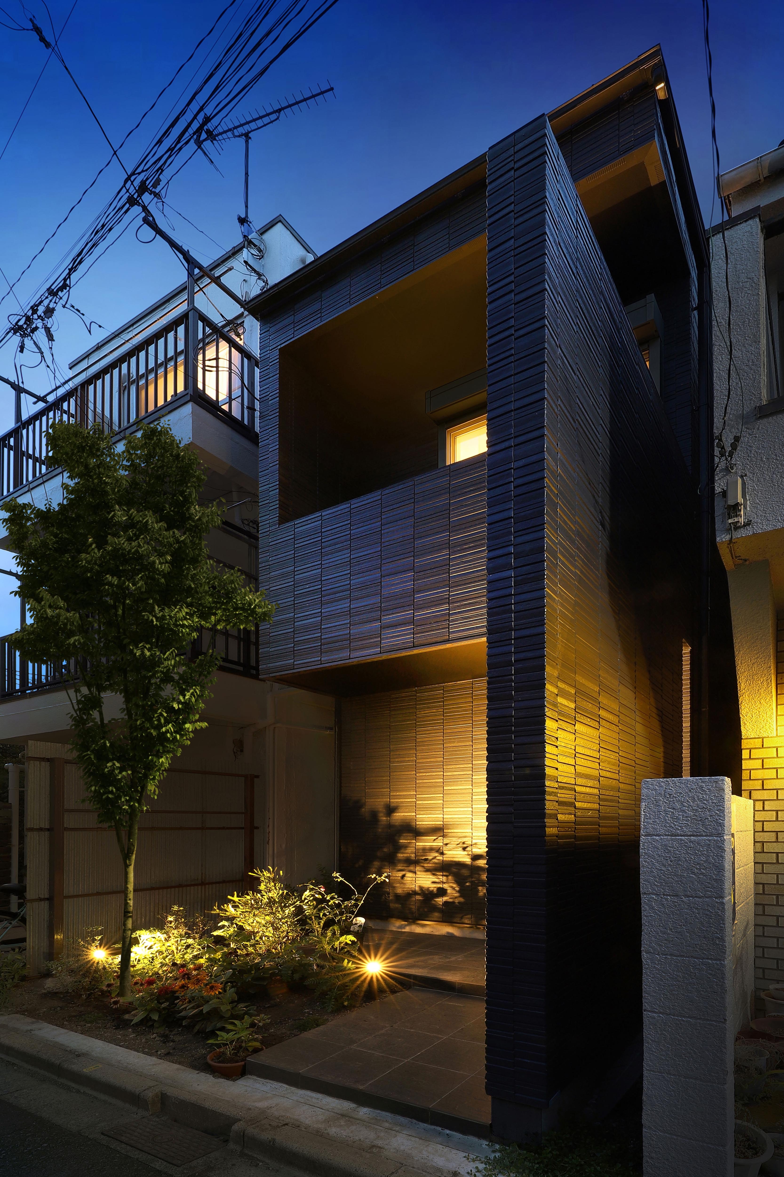 This project is a small house for a family of three, planned on a narrow and elongated site measuring 3.6m wide and 15m deep, resembling an “eel’s bed.” Due to setback rules, the effective width is further restricted to under 2.6m. To avoid sightlines and capture southern light, the LDK is placed on the second floor, rather than on the south-facing ground floor. A linear corridor and staircase connect the entrance to the living area, taking advantage of the site's shape. To the north, a private courtyard with wooden decking and green walls is enclosed by boundary walls. The client requested privacy and a refined exterior. In response, the entry wall, balcony, second-floor western boundary wall, and overhanging eaves are integrated into a continuous frame, forming a sculptural facade under 1.5 bays wide. At night, the exterior is further articulated by lighting. Indirect lighting and textured tiles enrich the corridor and stairway, guiding occupants to the second floor. Despite strict building coverage and floor area ratio limits, the design creates generous spatial experiences through well-crafted intermediary zones.