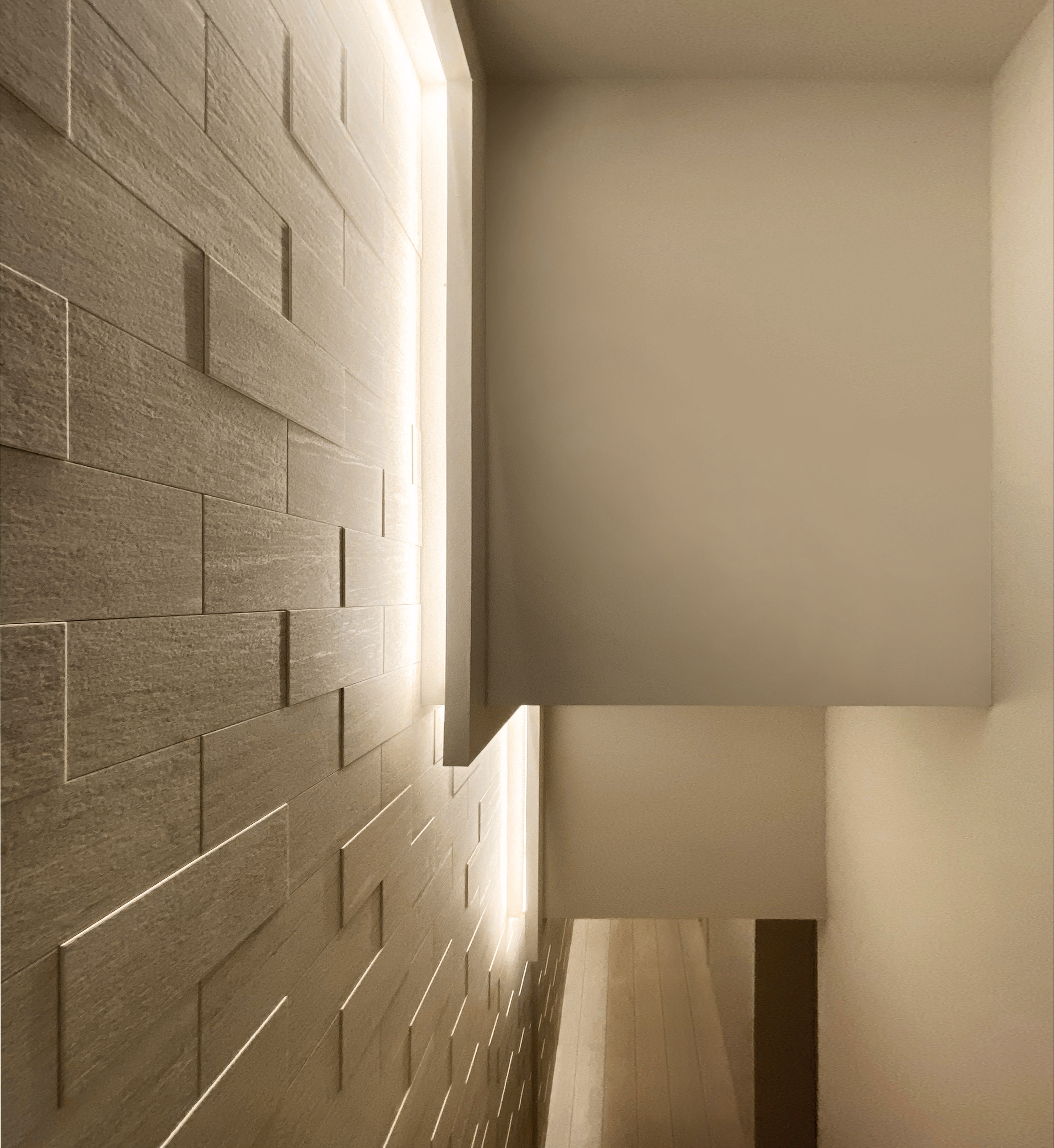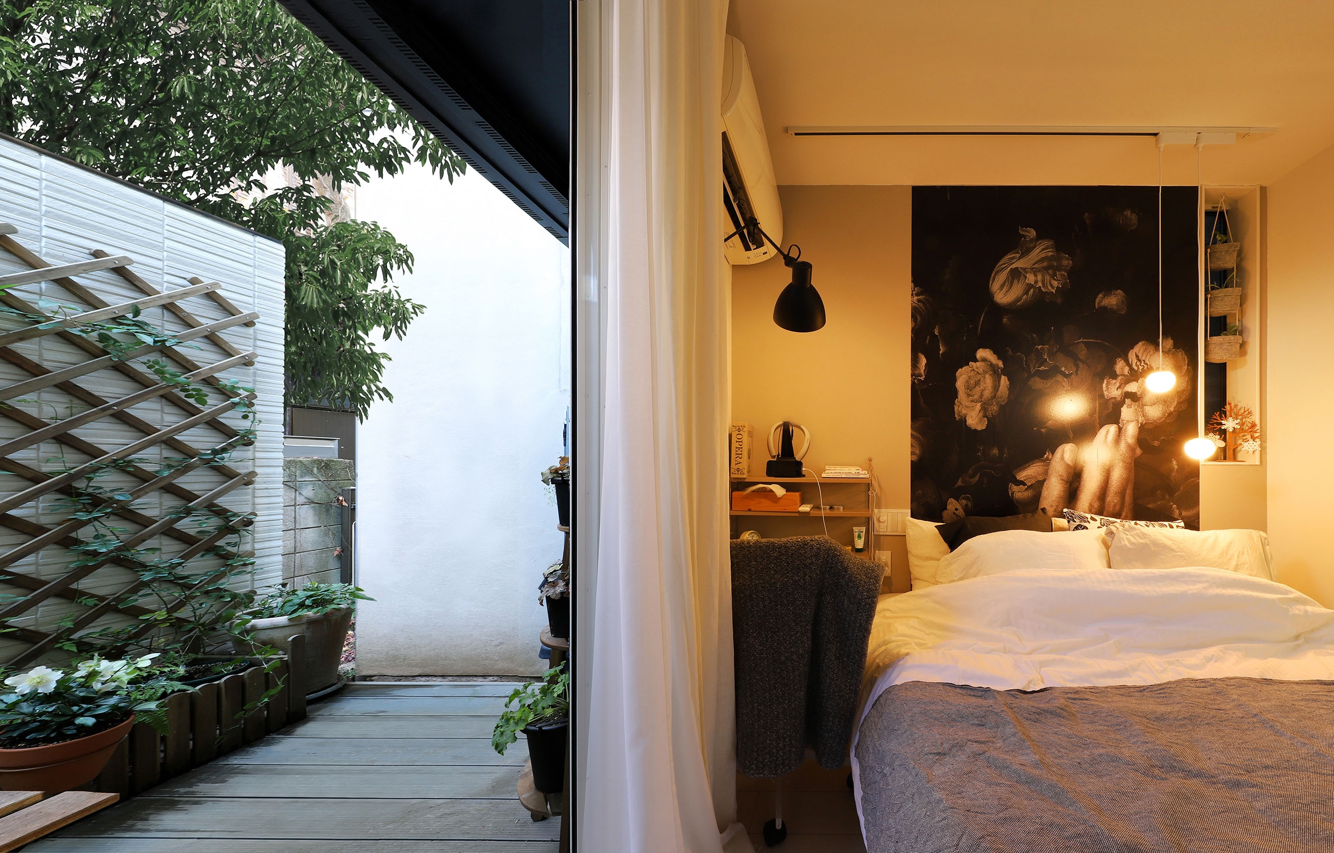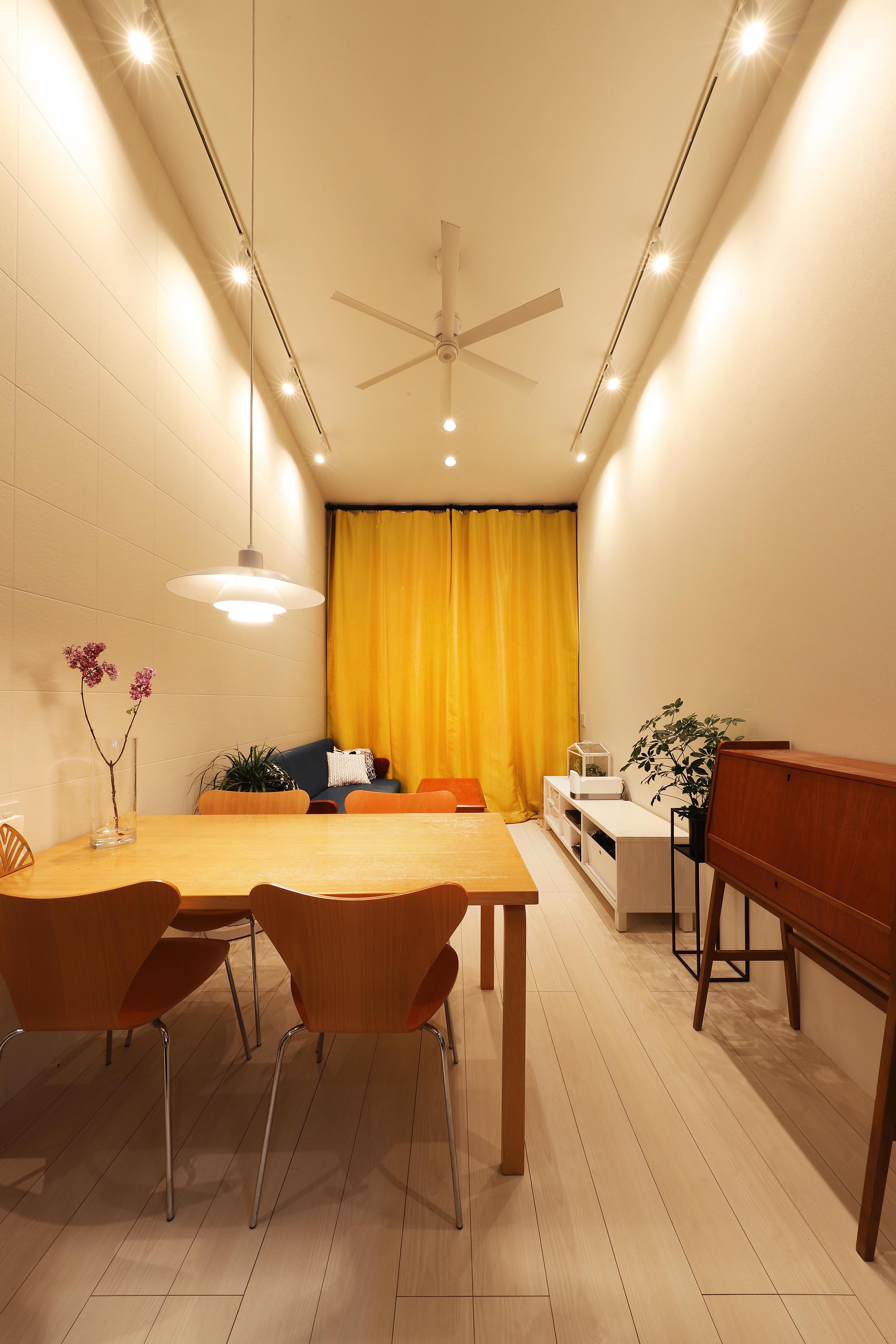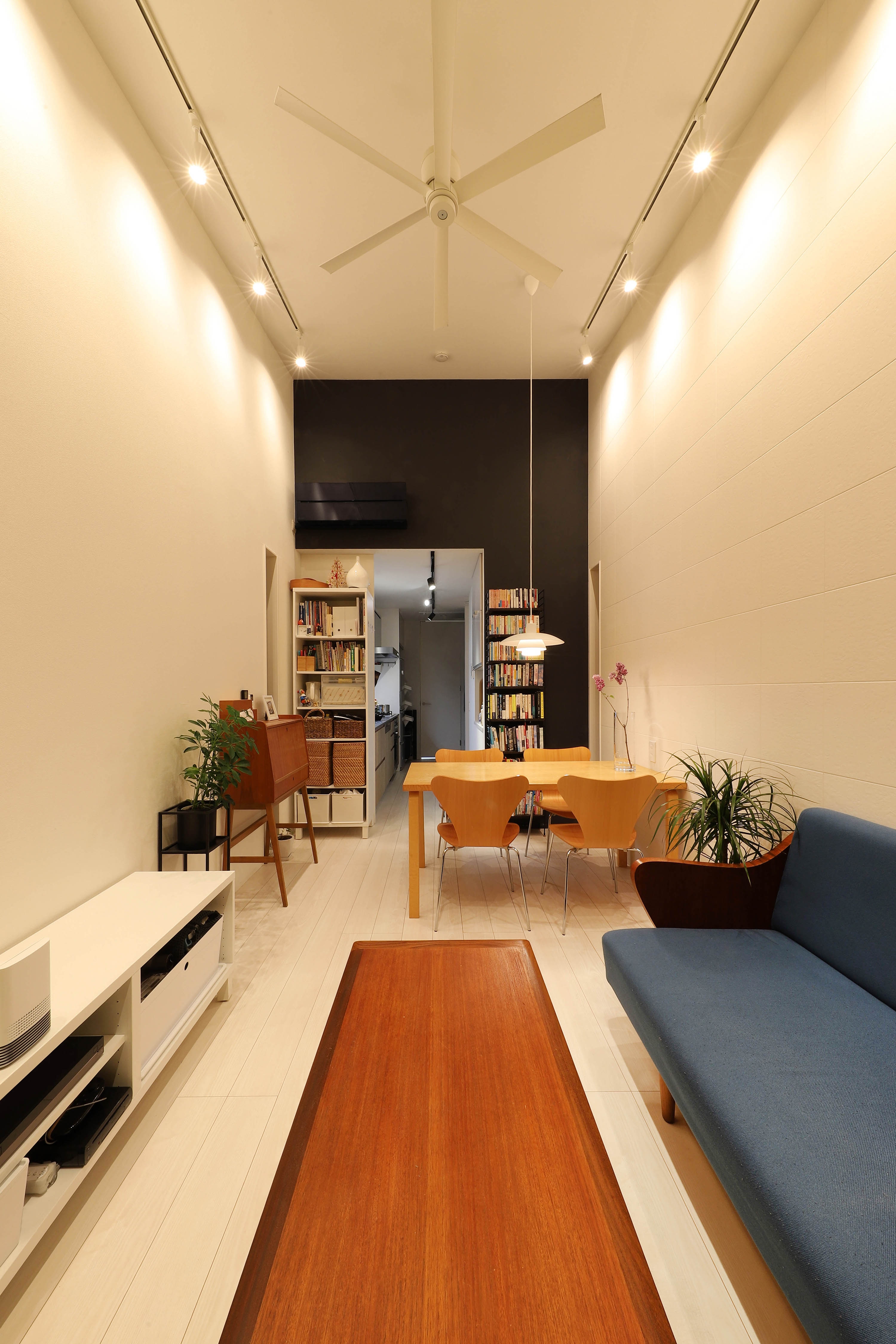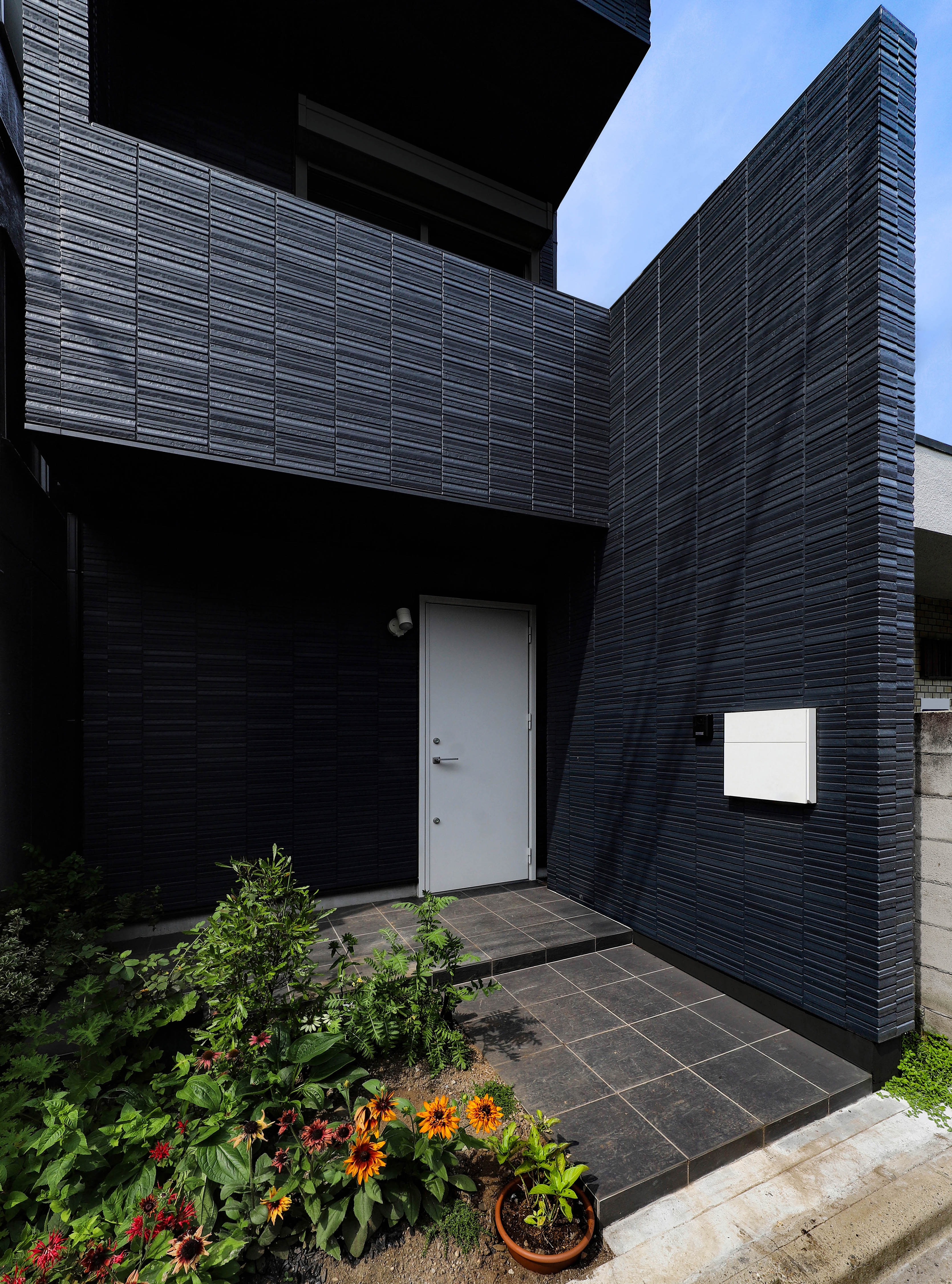 This project is a small house for a family of three, planned on a narrow and elongated site measuring 3.6m wide and 15m deep, resembling an “eel’s bed.” Due to setback rules, the effective width is further restricted to under 2.6m. To avoid sightlines and capture southern light, the LDK is placed on the second floor, rather than on the south-facing ground floor. A linear corridor and staircase connect the entrance to the living area, taking advantage of the site's shape. To the north, a private courtyard with wooden decking and green walls is enclosed by boundary walls. The client requested privacy and a refined exterior. In response, the entry wall, balcony, second-floor western boundary wall, and overhanging eaves are integrated into a continuous frame, forming a sculptural facade under 1.5 bays wide. At night, the exterior is further articulated by lighting. Indirect lighting and textured tiles enrich the corridor and stairway, guiding occupants to the second floor. Despite strict building coverage and floor area ratio limits, the design creates generous spatial experiences through well-crafted intermediary zones.