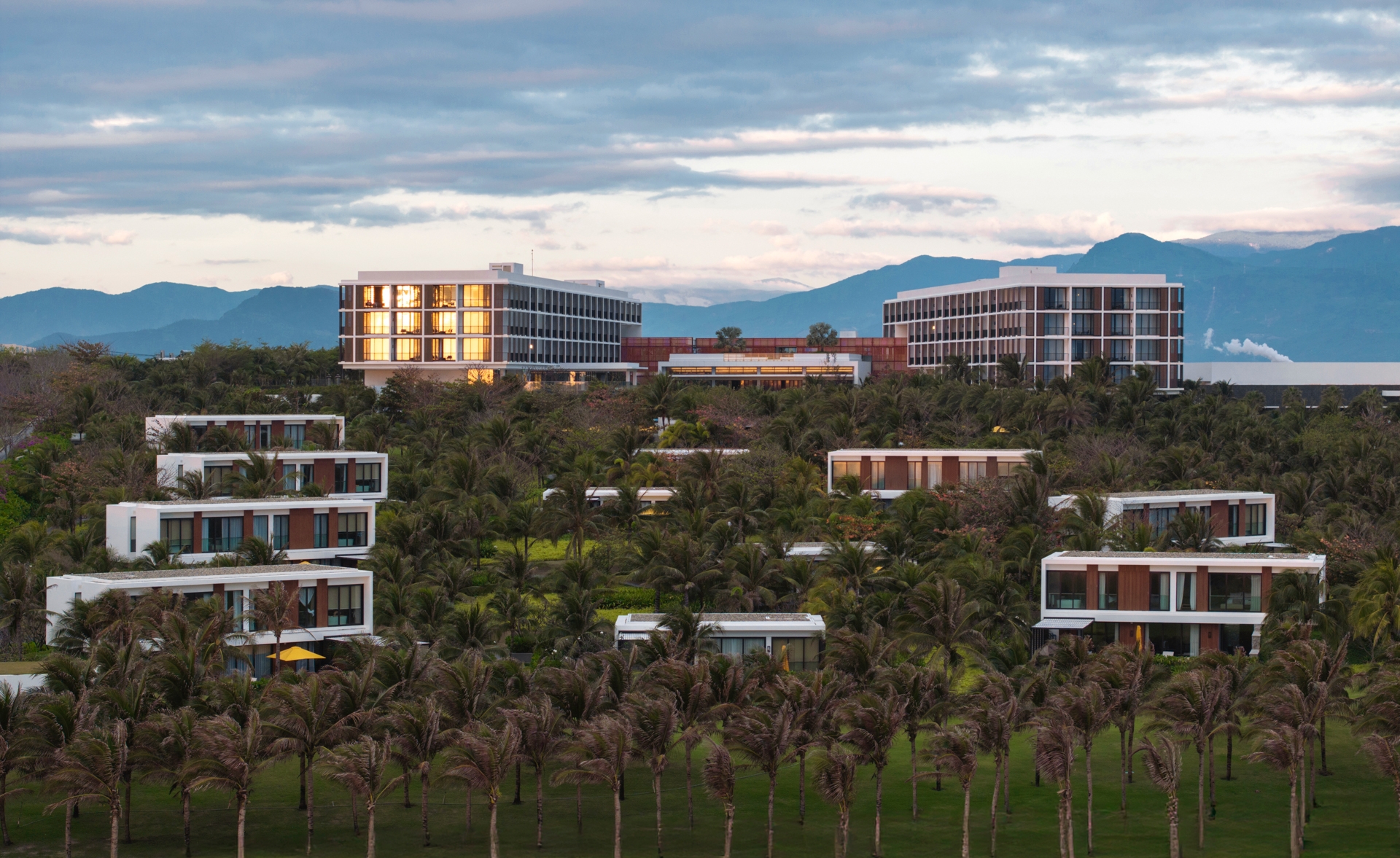 The beachfront retreat is carefully integrated into a 25-acre site where sand dunes rise up to 25 meters. By placing the hotel blocks at the site’s highest point with villas terraced within the slopes along the existing contours, the design minimizes site disruption while maximizing ocean views for all accommodations.