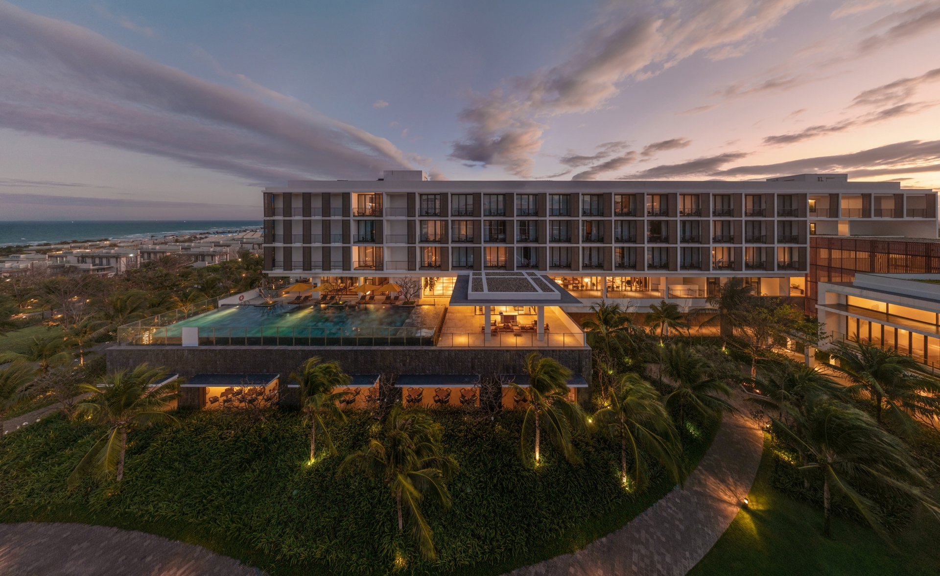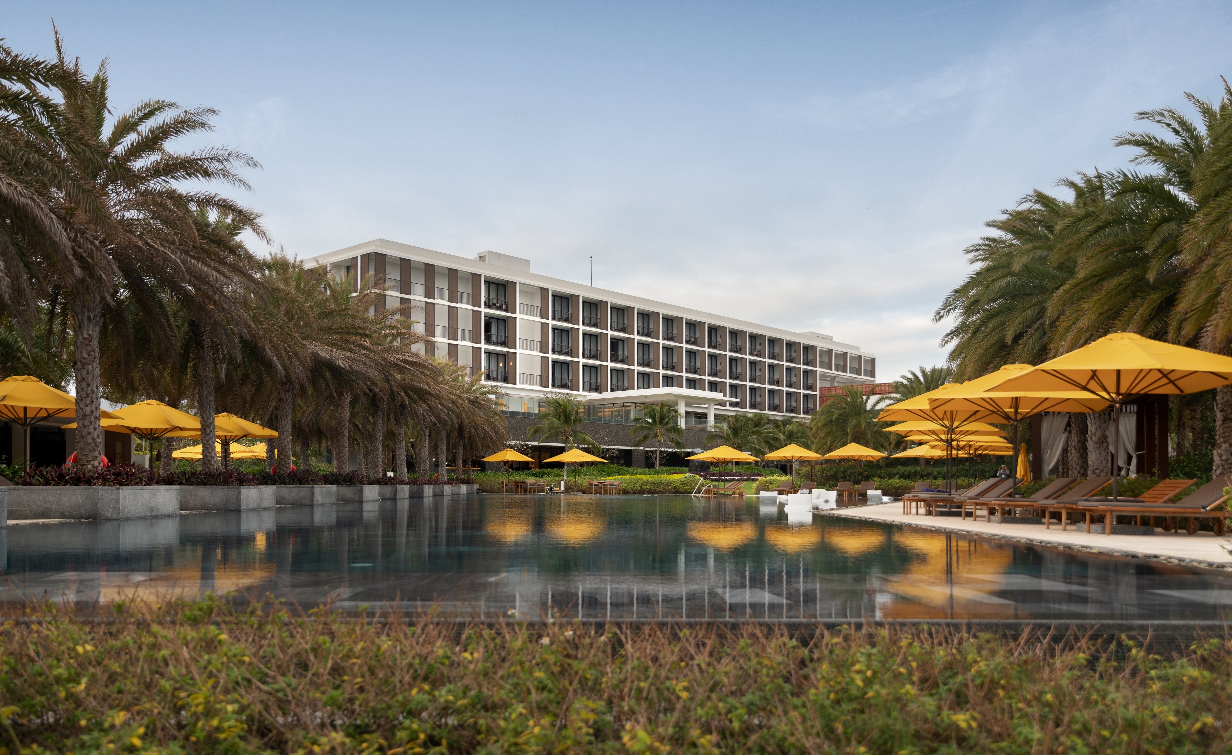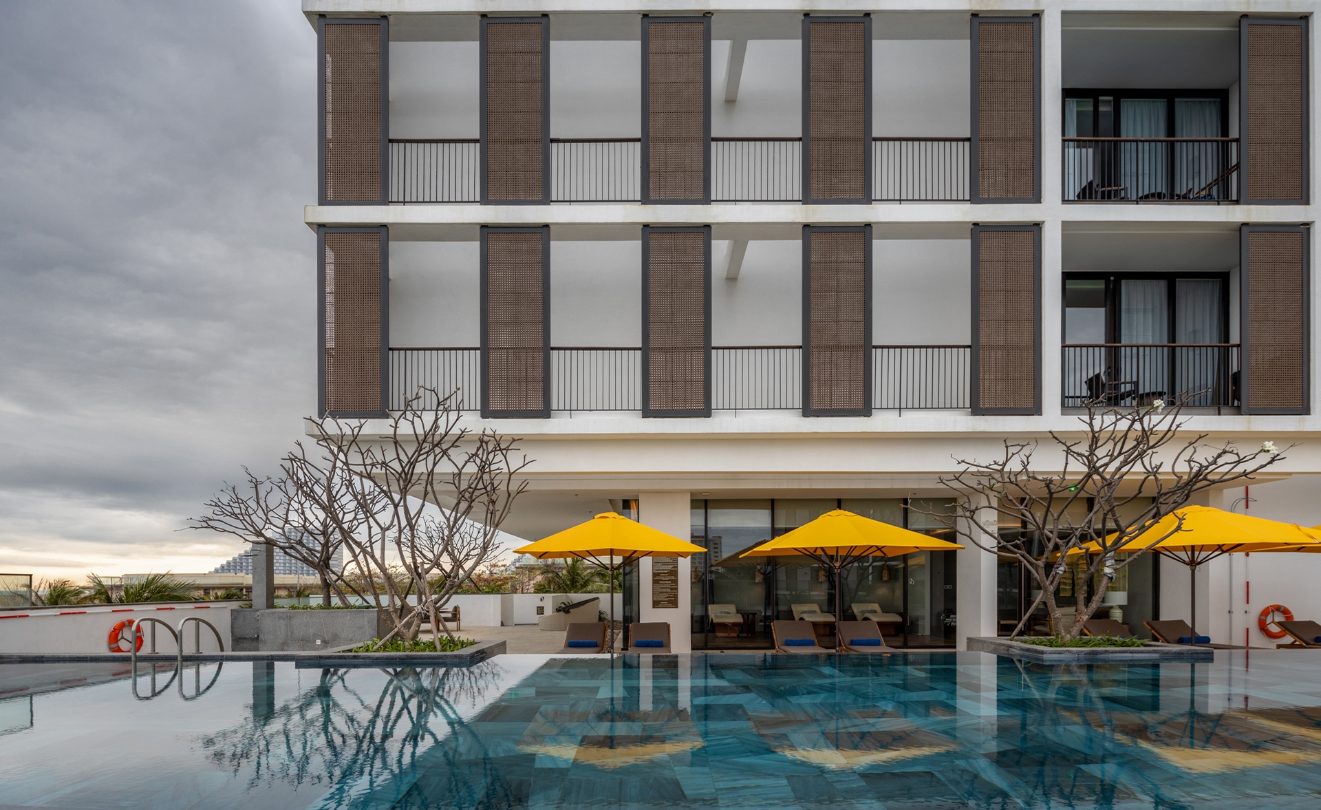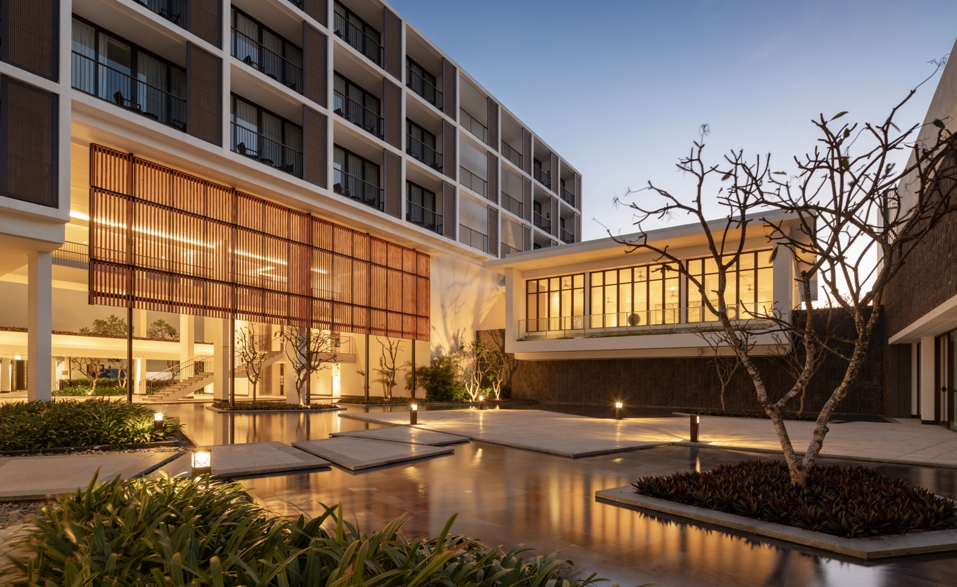 The landscape pattern reflects the lobster and prawn farms of Cam Ranh Bay, a recognizable sight for travelers arriving by air. Similarly, the hotel’s shading screens are inspired by the Khánh Hòa province’s traditional weaving techniques and the woven elements in outdoor pavilions local craftsmanship.
