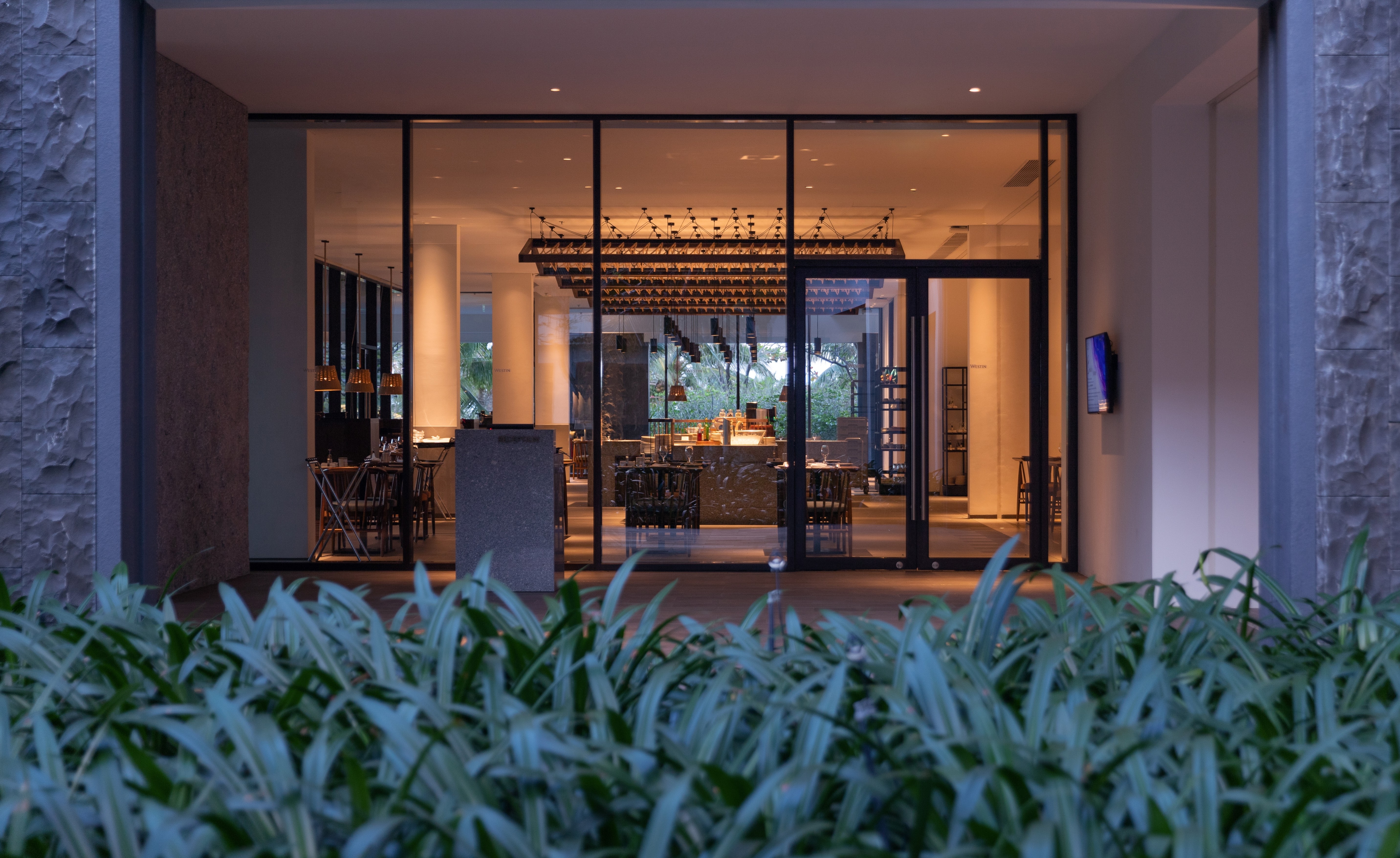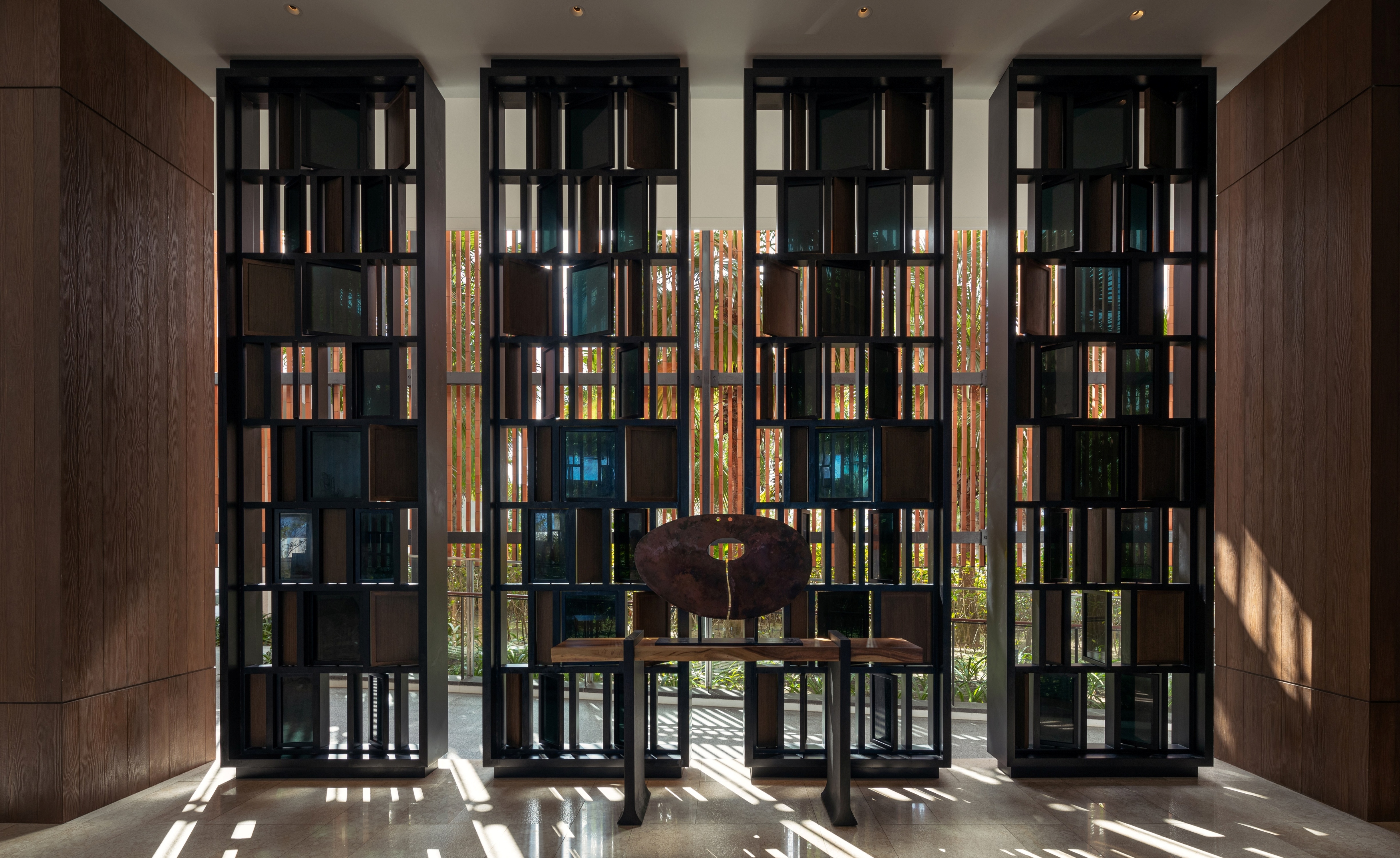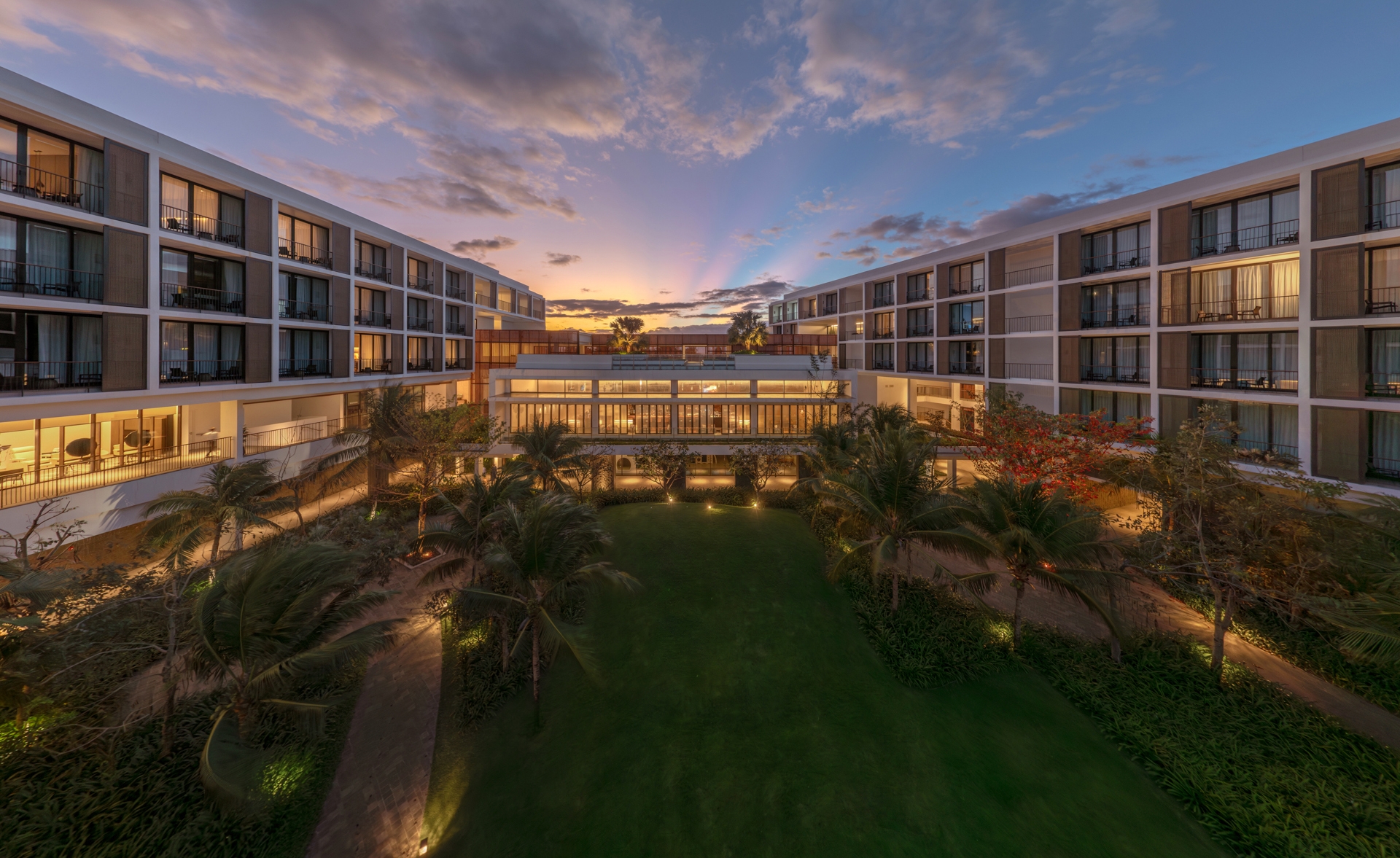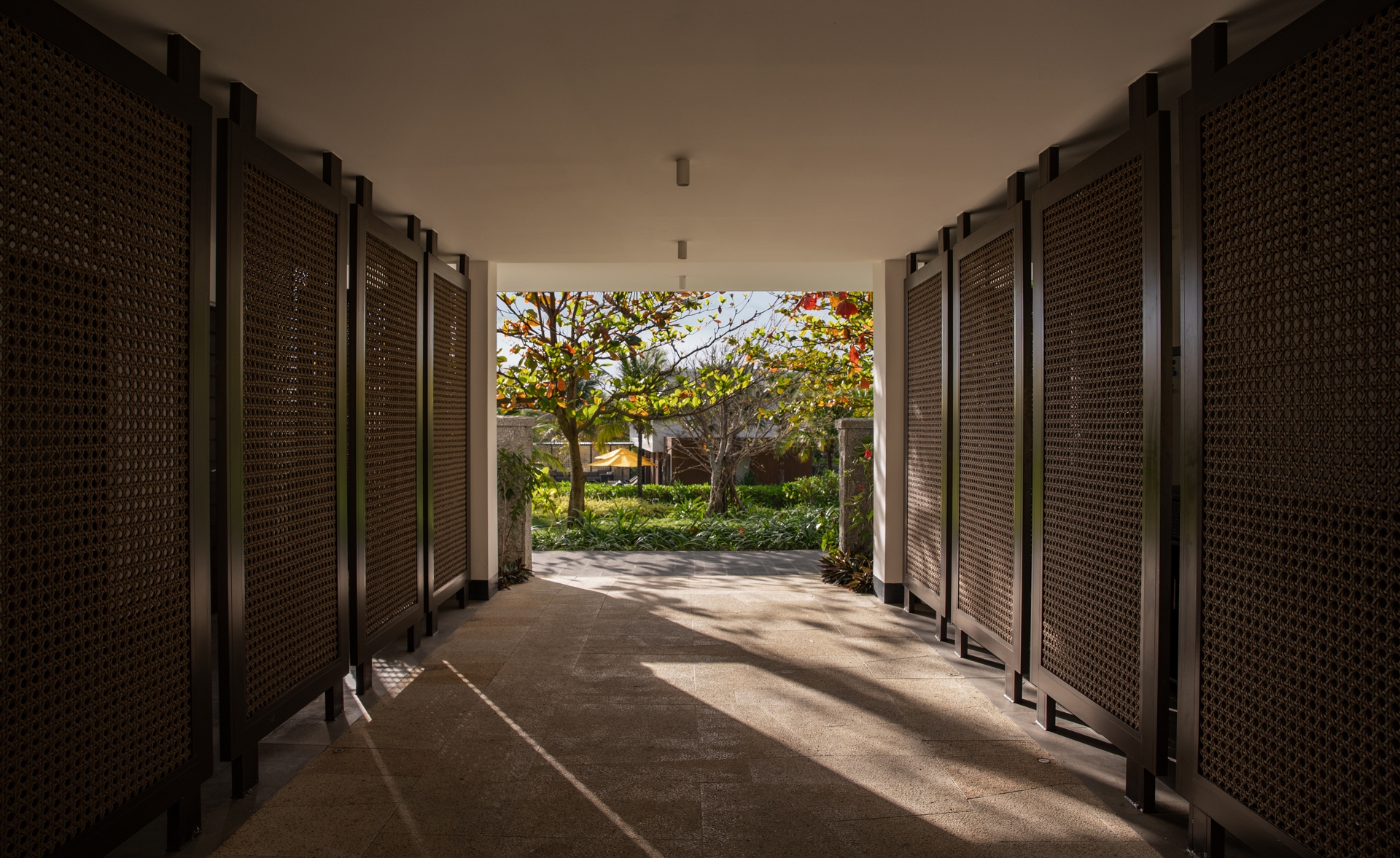 The landscape pattern reflects the lobster and prawn farms of Cam Ranh Bay, a recognizable sight for travelers arriving by air. Similarly, the hotel’s shading screens are inspired by the Khánh Hòa province’s traditional weaving techniques and the woven elements in outdoor pavilions local craftsmanship.
