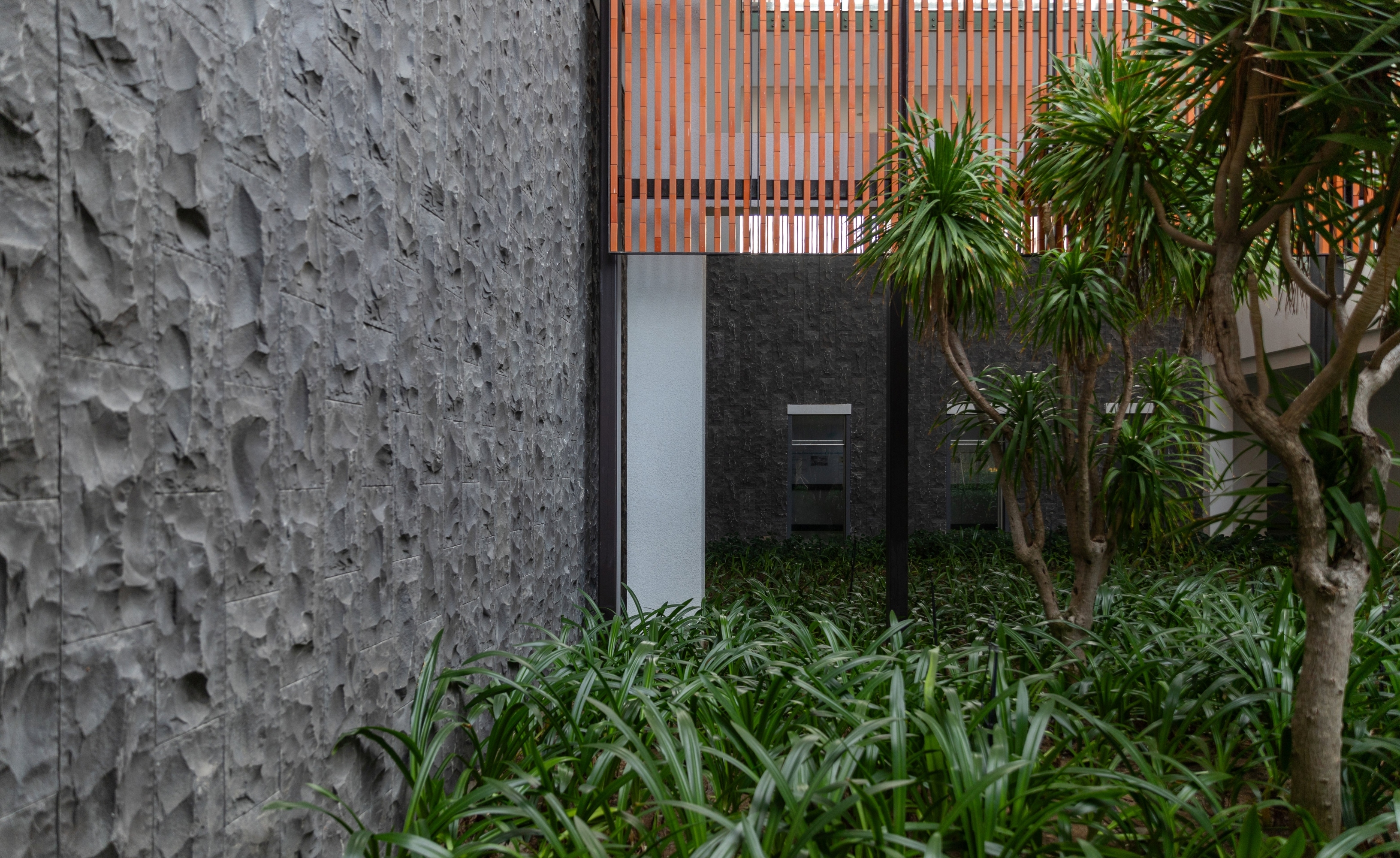 To withstand the tropical climate and monsoon season, the resort features brick screens, using handmade bricks from a nearby factory. The use of basalt stone, granite, and locally sourced blue stone enhances the landscape and pool finishes, reinforcing the resort’s connection to its natural surroundings. The use of local materials lowers the carbon footprint, while passive cooling techniques help reduce energy consumption.