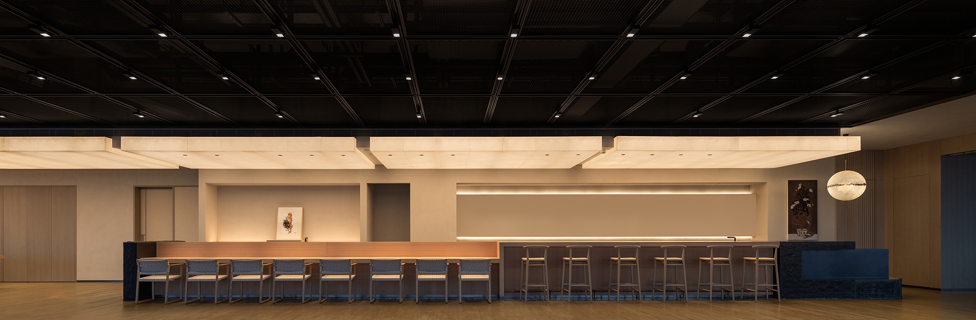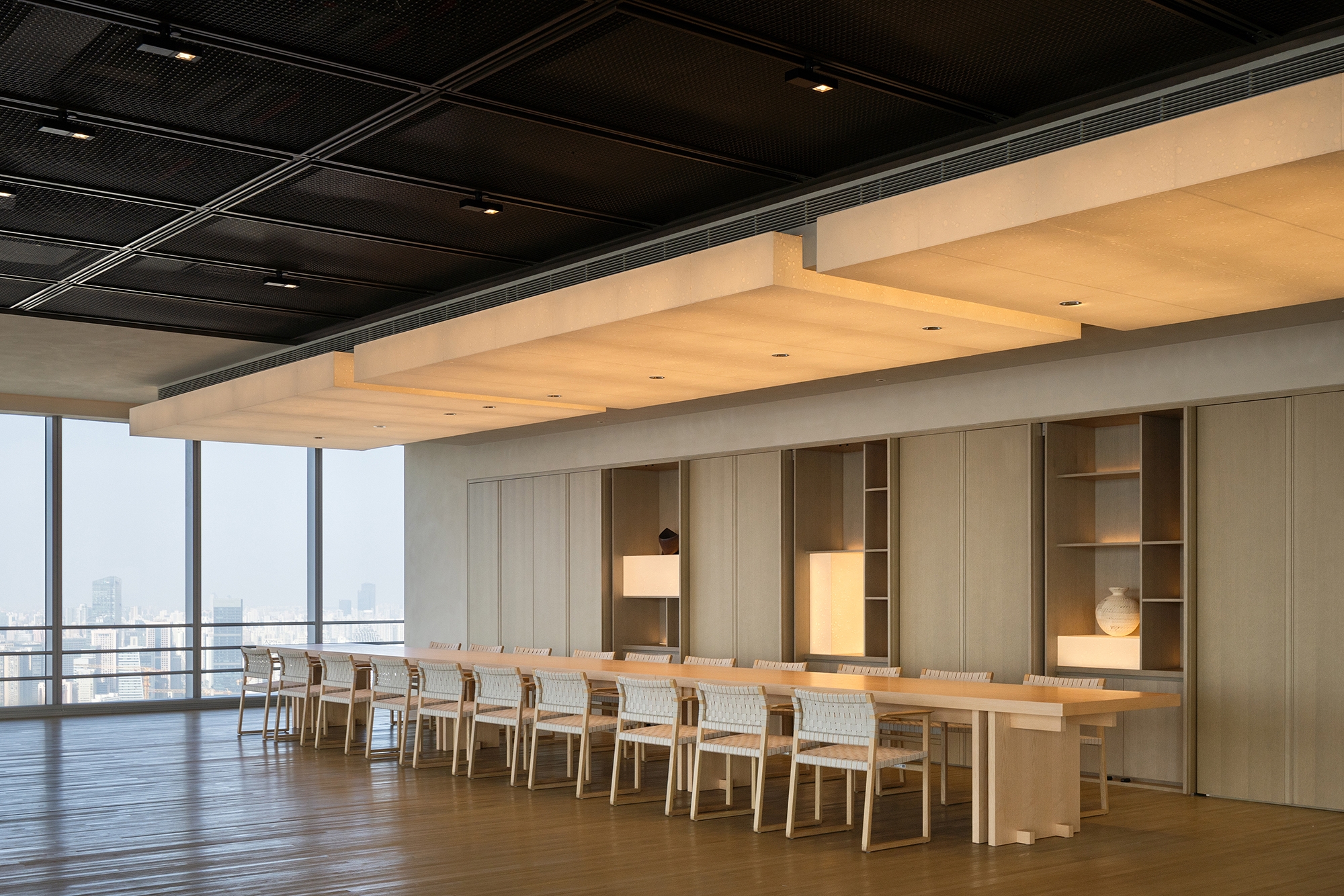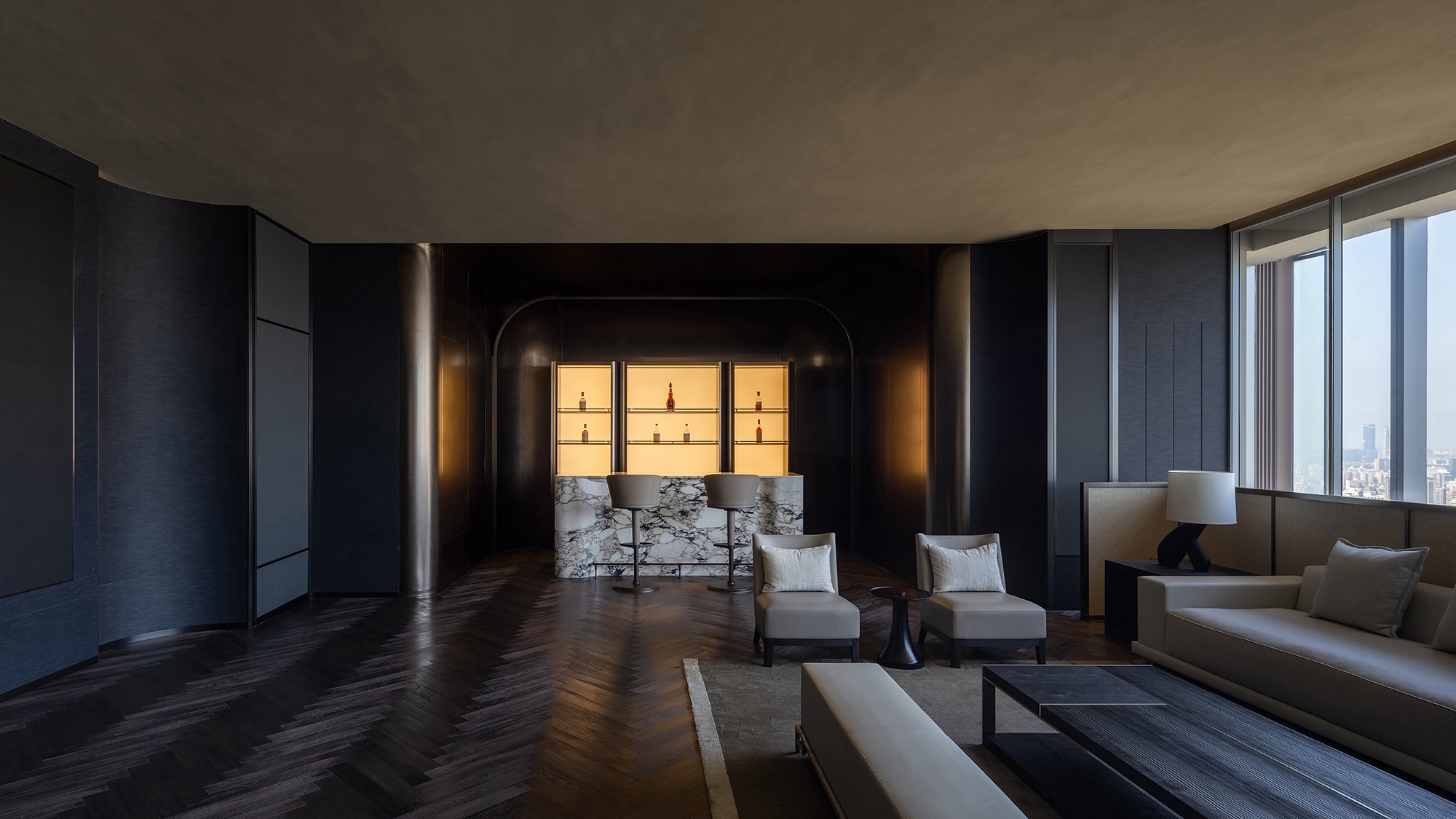 The "cloud lounge" offers a sweeping 270-degree panoramic view of the bustling cityscape. Its open and fluid design allows light and shadow to traverse freely, weaving into the stories of the space with every moment. A flexible layout invites various configurations, inspiring diverse settings tailored to different occasions.