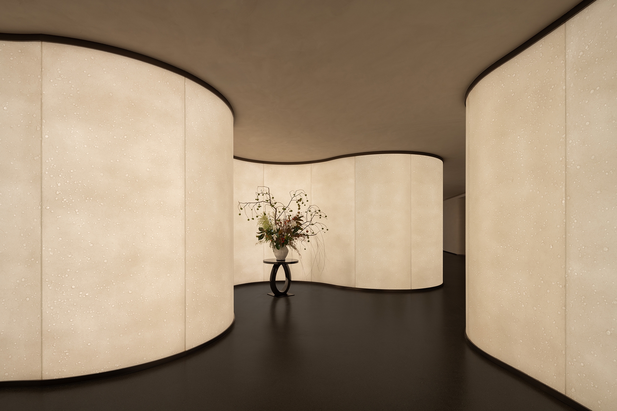 The entrance features a winding art corridor that bridges tranquility and vibrancy. It reflects the design team’s mastery of spatial organization while extending a sense of cultural charm. Within the multimedia lounge, a soothing palette of beige and ink tones pairs with refined textures and meticulous detailing, creating an ambiance of understated elegance and nobility.