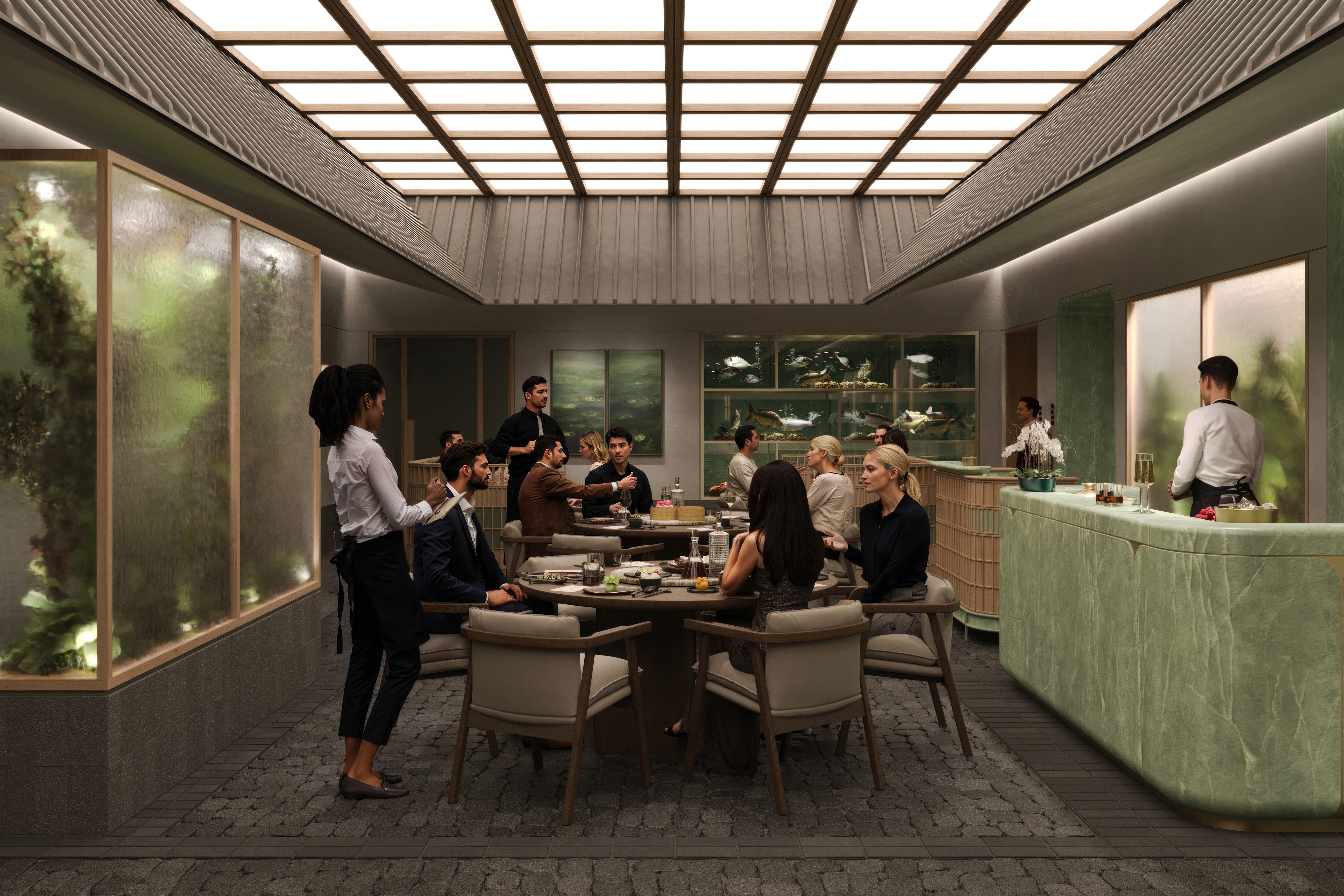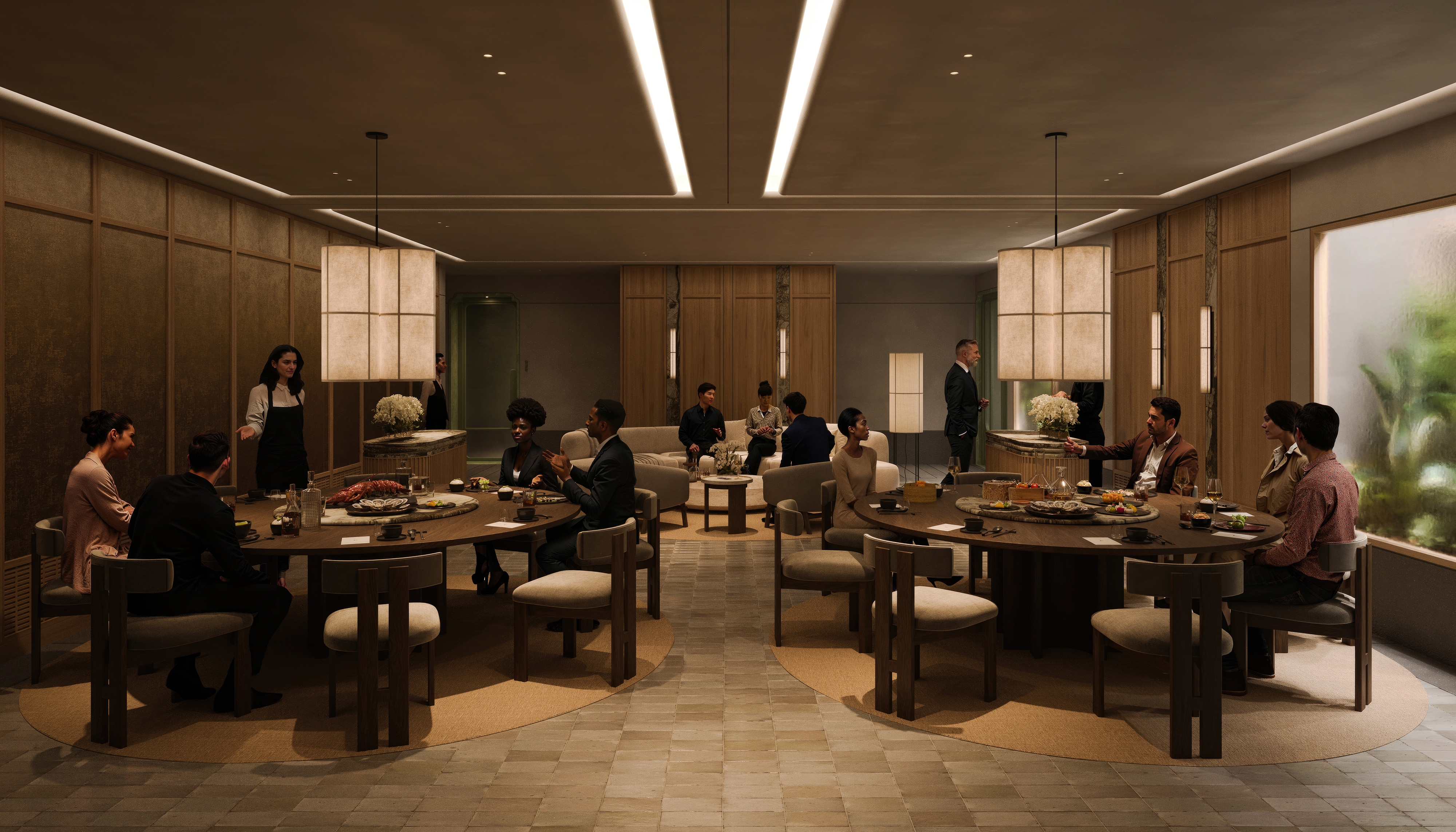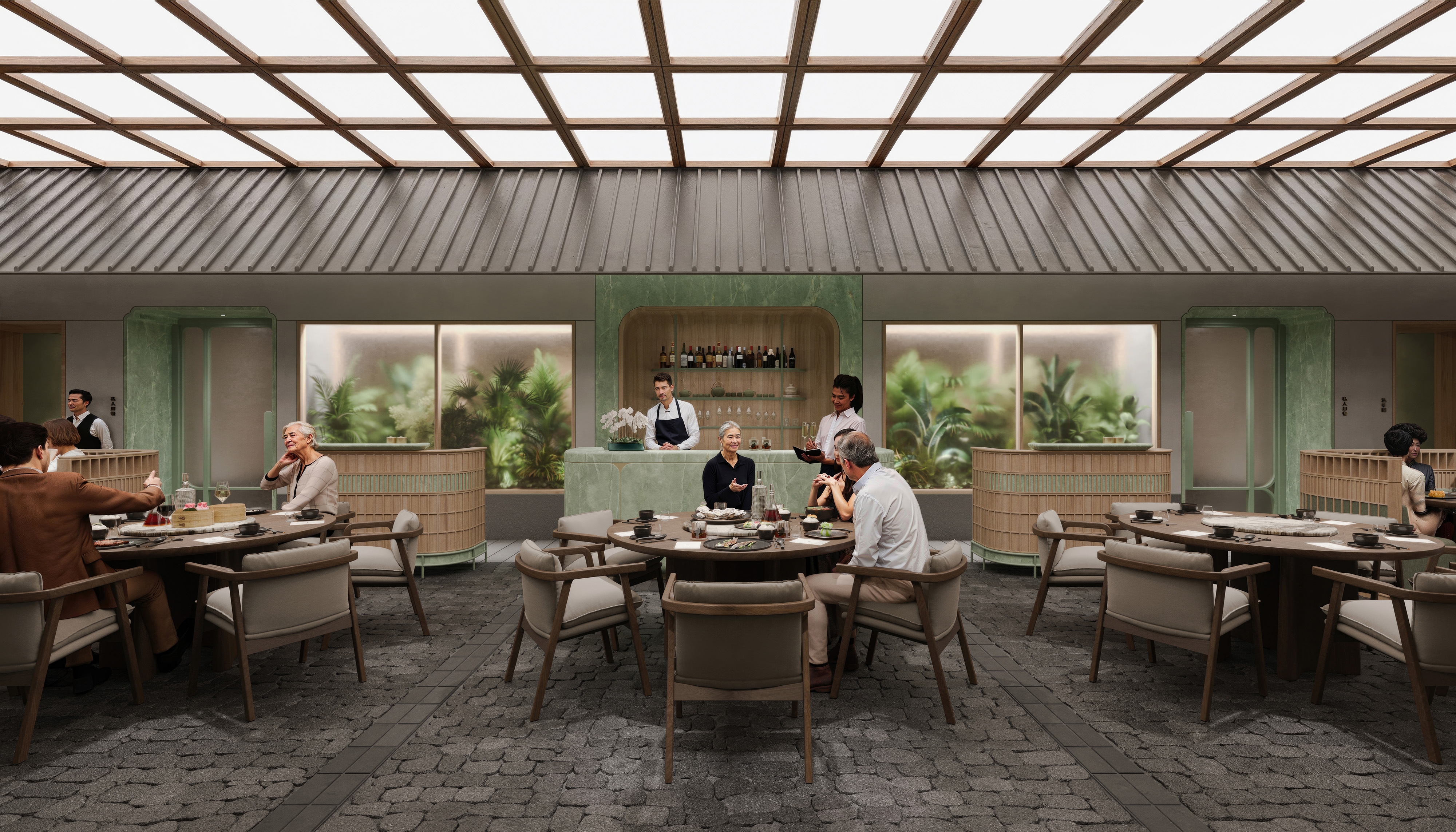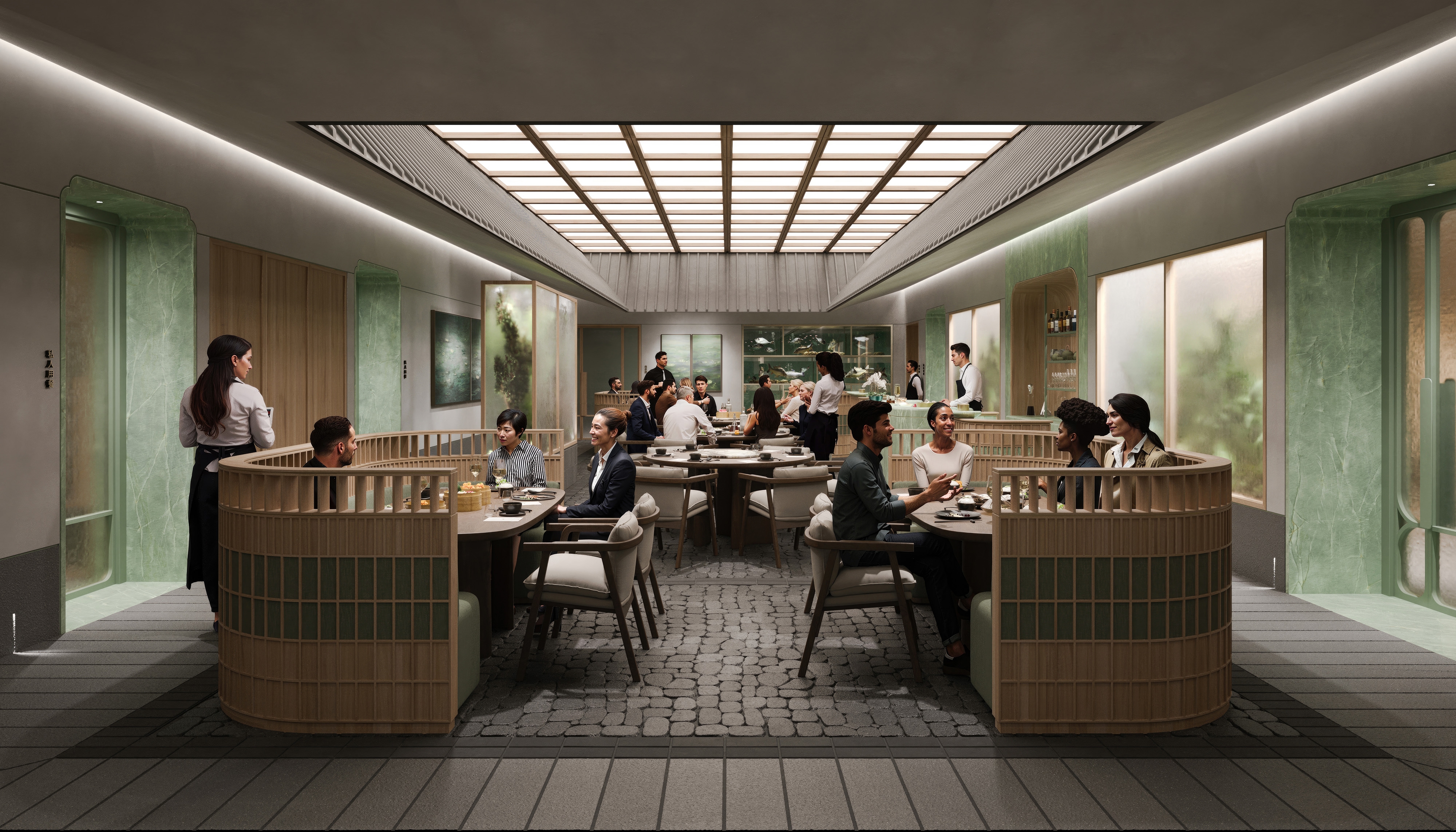 SHH was commissioned to design a Michelin-star Cantonese restaurant in Beijing’s Chaoyang District. The brief called for a design that would narrate a cohesive story through the guest’s journey, incorporating traditional architectural elements which enrich the dining experience. From arrival to departure, the space is designed to engage guests by creating a memorable and immersive environment that reflects the cultural depth and culinary sophistication of Cantonese cuisine. The design intent is to provide dining spaces suitable for the use of general guests alongside private and VIP dining spaces for business lunches and special events. The restaurant configuration incorporates spatial and material elements that are found in the traditional Lingnan-style architecture of South China, reinterpreted in contemporary ways: a central “courtyard” dining area is surrounded by a series of private dining spaces, and incorporating further architectural elements like gateways, thresholds, porches and connecting alleyways. To capture the essence of the culinary journey, the CGI visuals guide viewers through distinct dining environments.