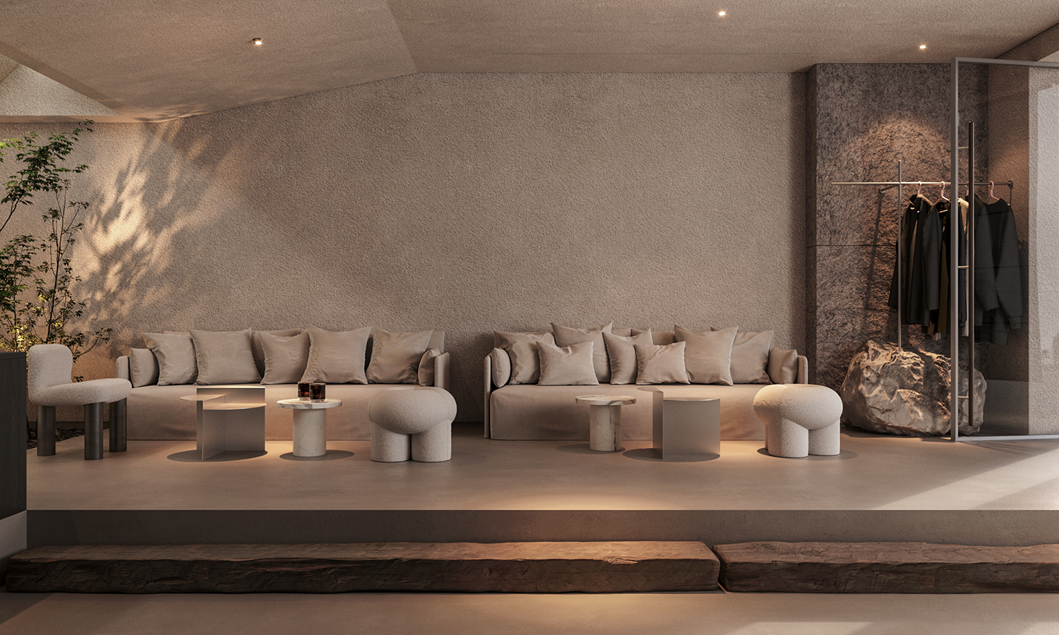 Special attention is given to lighting: a combination of natural light and artificial sources enhances the depth of textures and creates a multi-layered ambiance. Recessed lighting subtly highlights key areas, adding depth and warmth to the space.