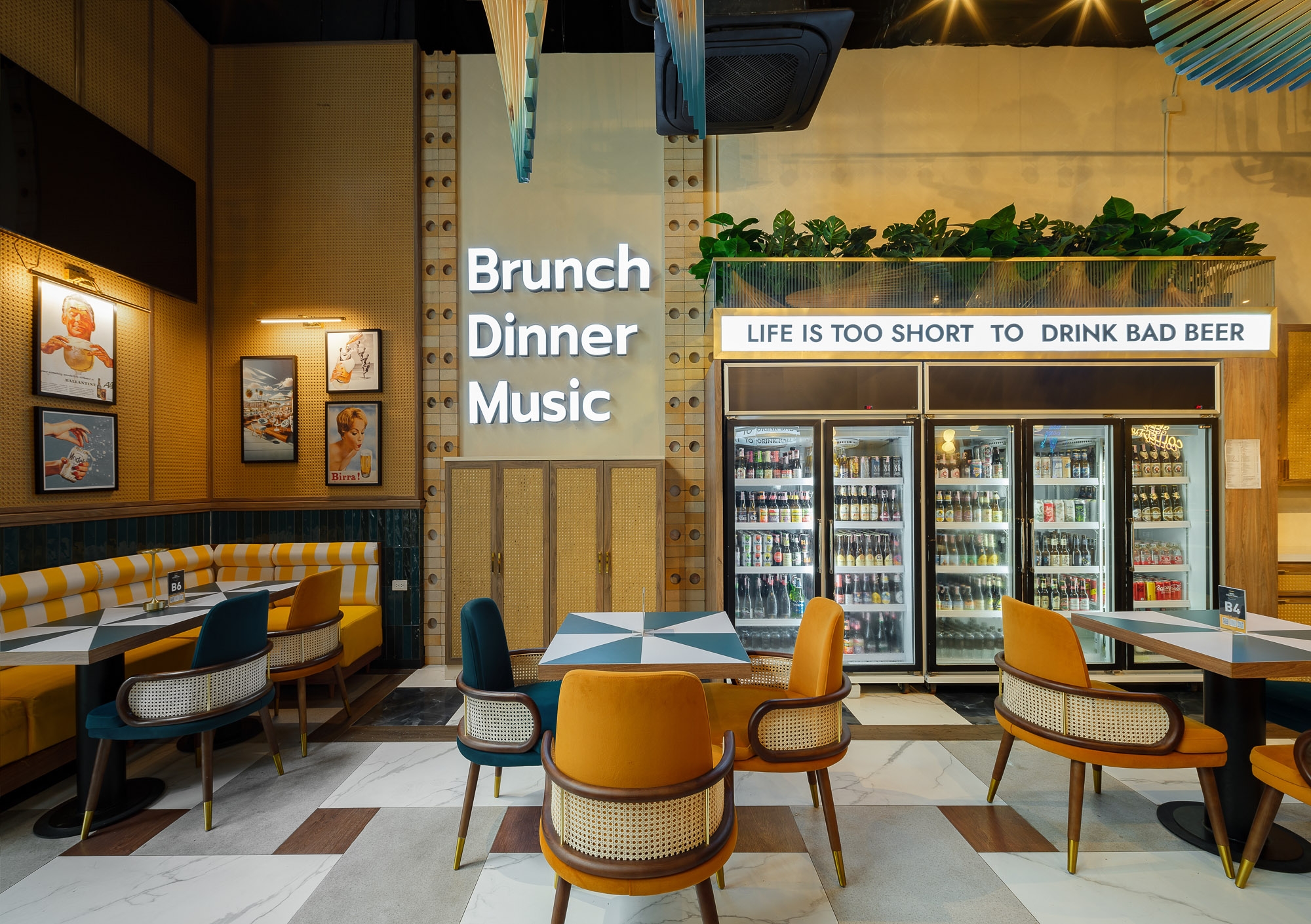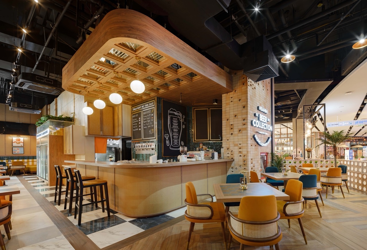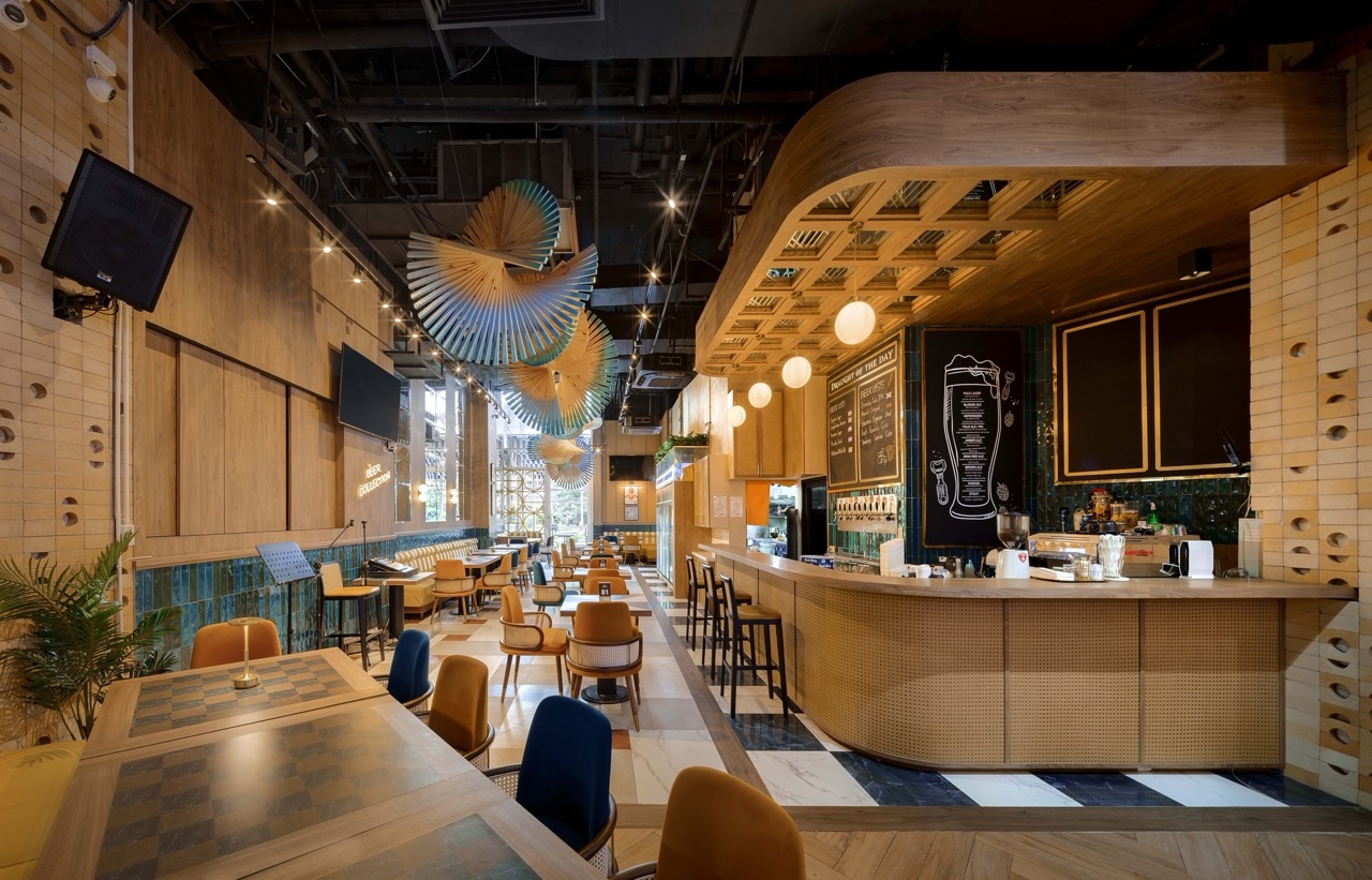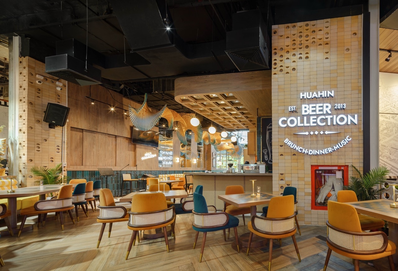 Beer Collection redefines dining with a Retro Beach style inspired by the vibrant charm of 1950s-70s Palm Springs blended with Hua Hin’s coastal essence. The design embraces playful yellows, the brand’s CI color, paired with ocean blue to echo the refreshing vibe of the sea. Geometric shapes throughout the décor evoke a lively, social atmosphere, embodying the “Best Brew with Best Friend” concept—a destination where beer lovers can unwind and connect.