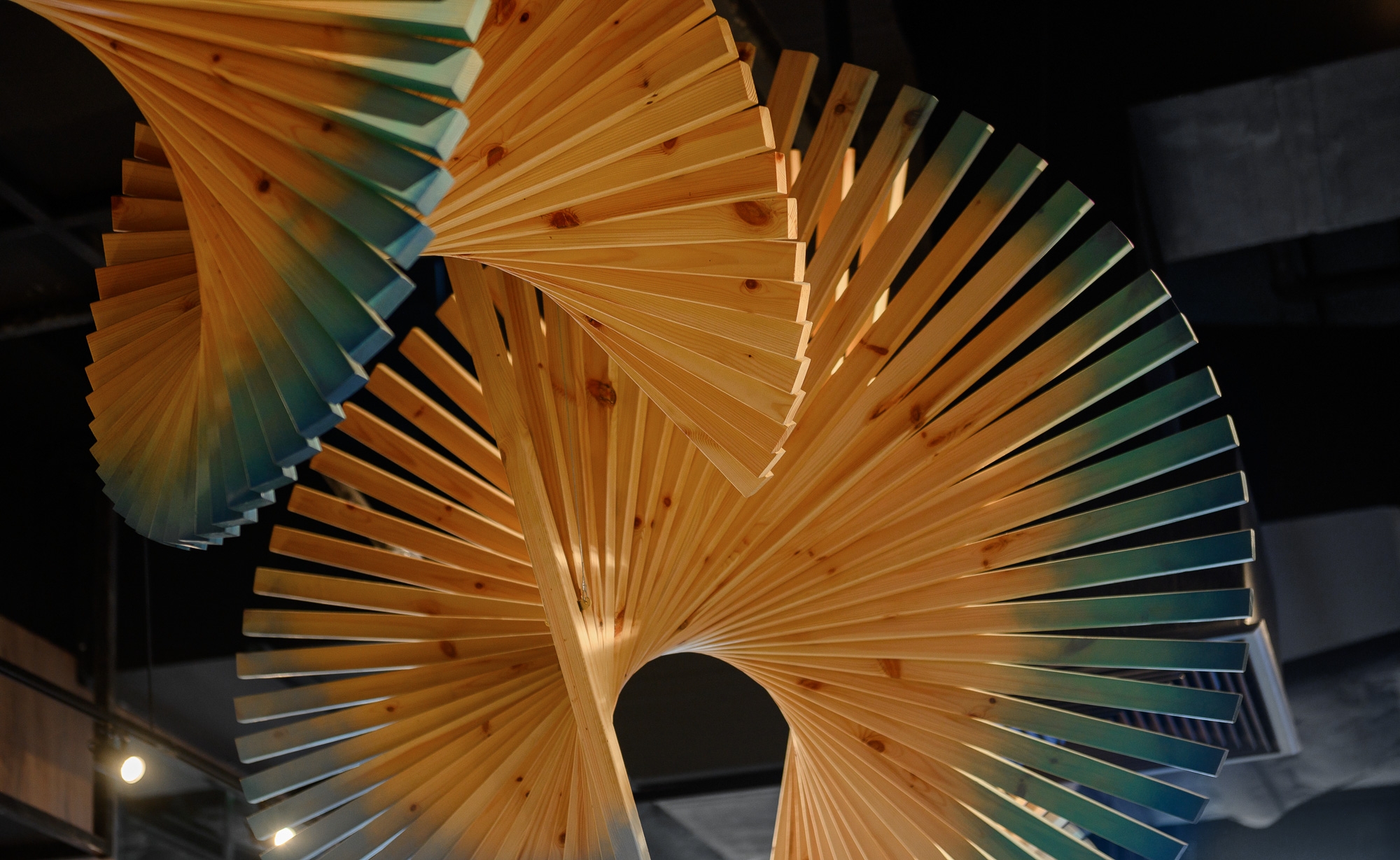 Key elements include a centerpiece sculpture and furniture inspired by palm trees, with fronds and trunks abstracted into geometric forms. Social Club-themed tables incorporate playful nods to games like chess, darts, and Monopoly, enhancing interaction. Overhead, an artful ceiling installation mirrors palm fronds, recreating the sensation of enjoying a beer under tropical shade.