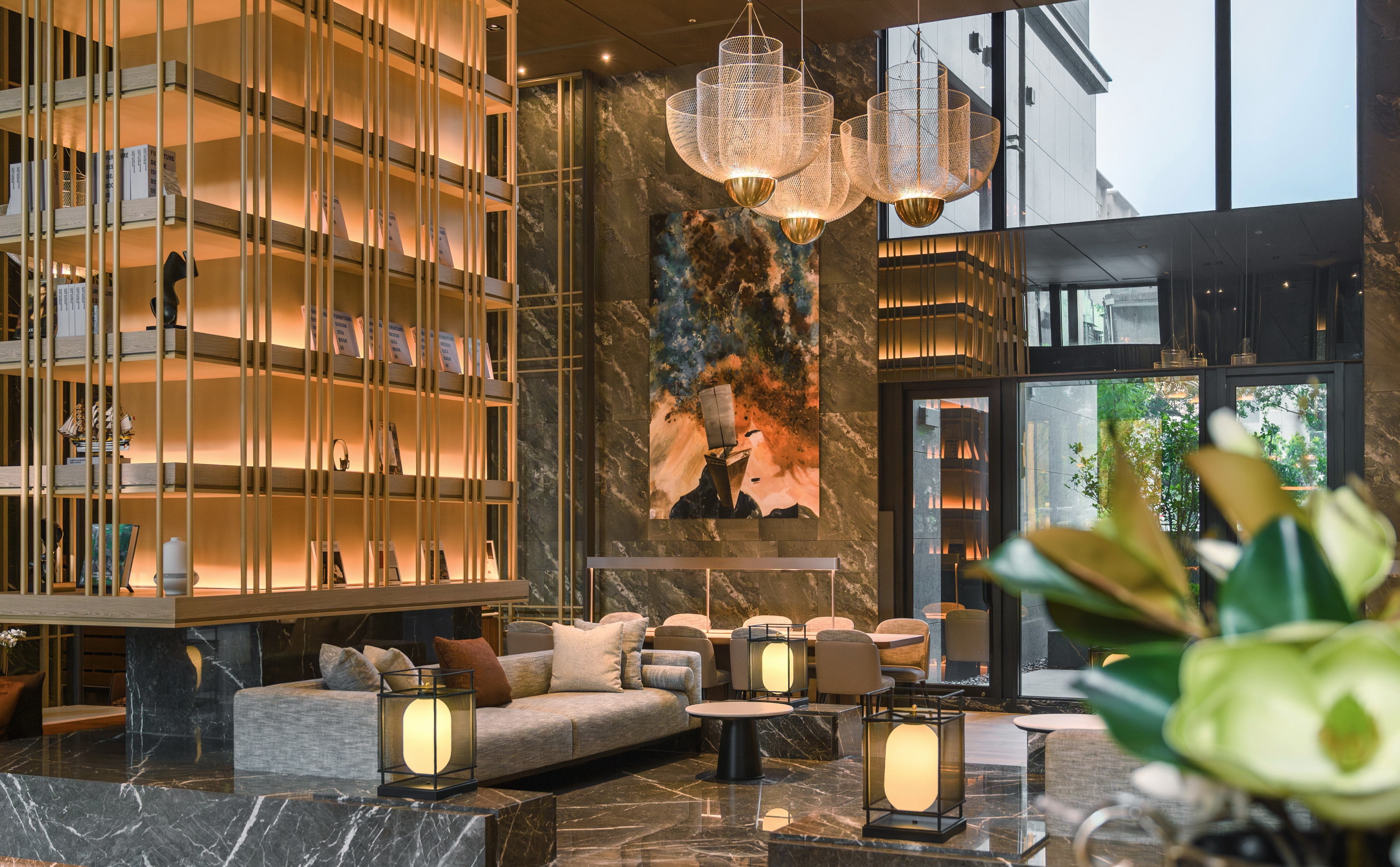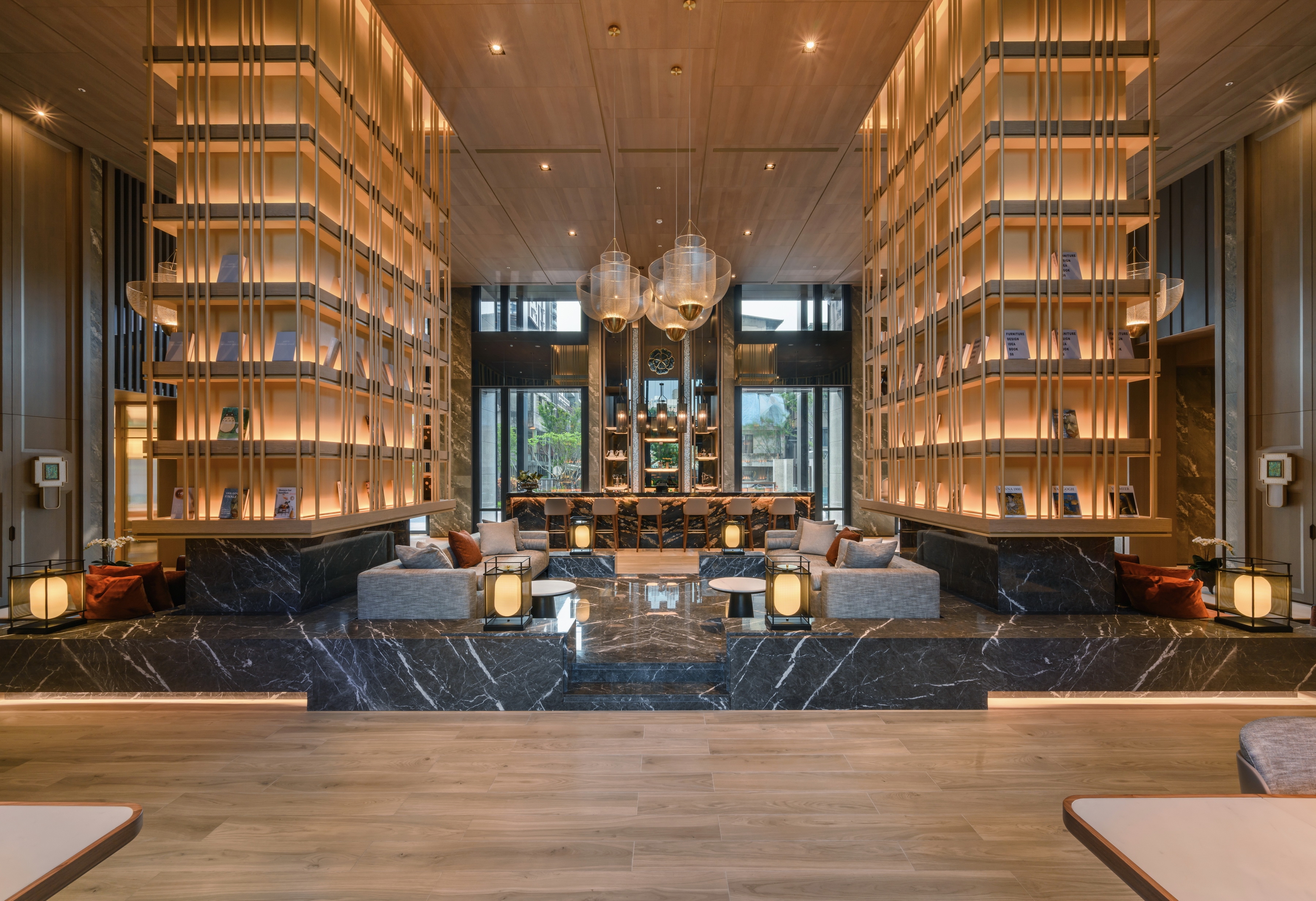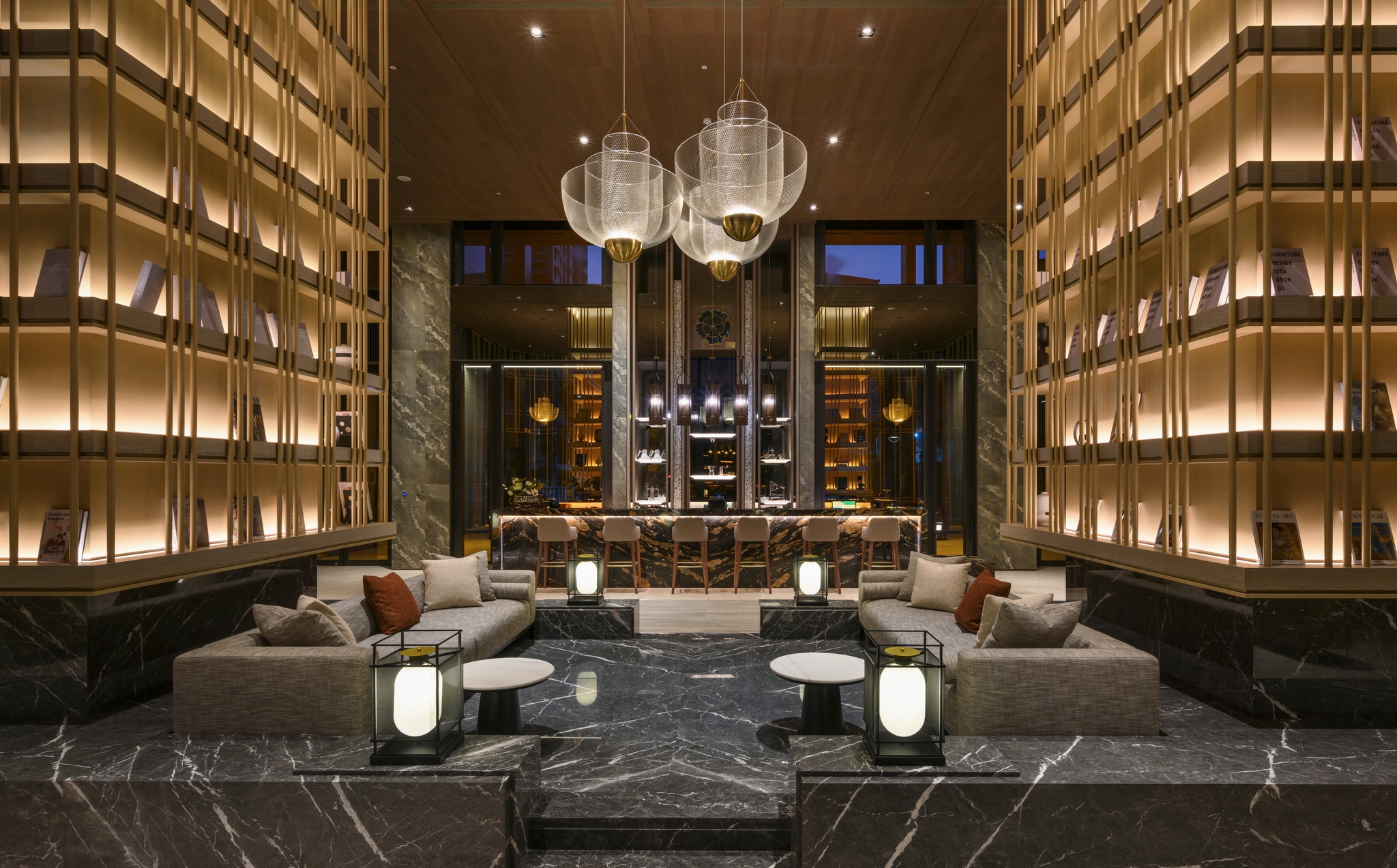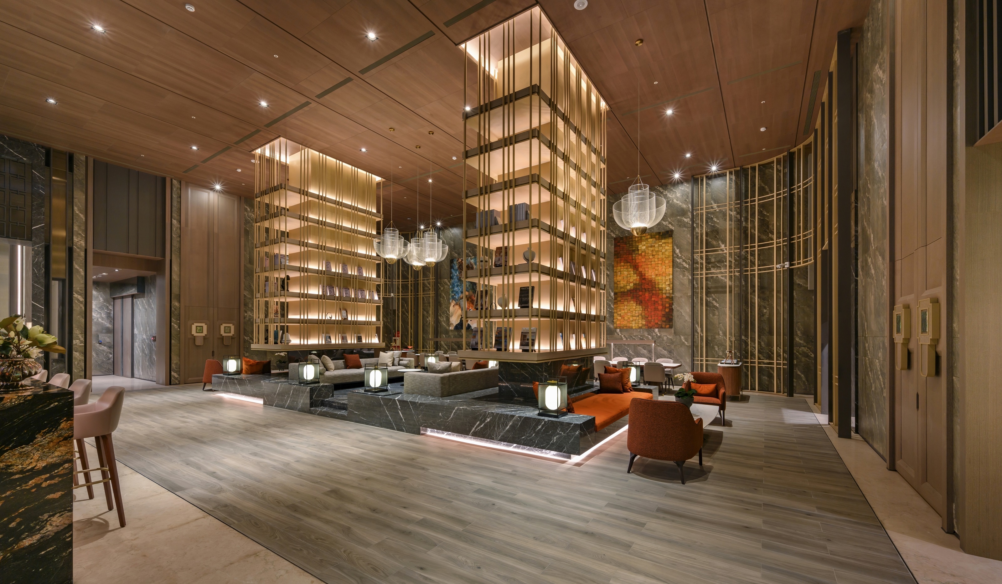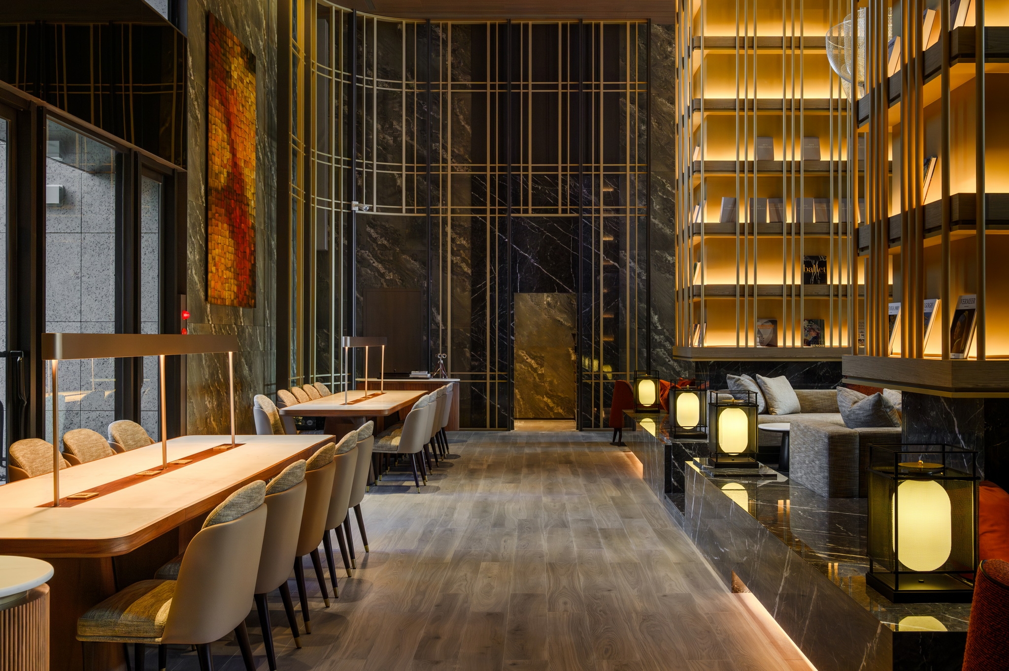 Towering book walls rise like a "forest of sails," framing a café that recalls an open deck. Amber-gold light drapes across the space like fine brocade, blending classical grace with modern sophistication. A striking chandelier mimics the warm orange glow of shrimp-fishing lamps, symbolizing abundance and harvest.